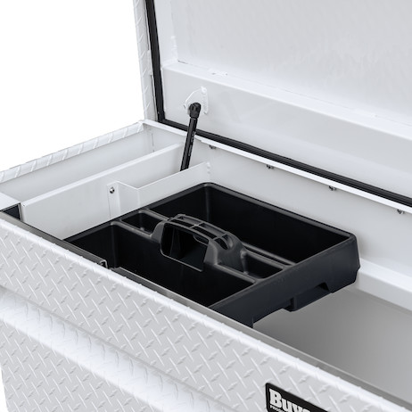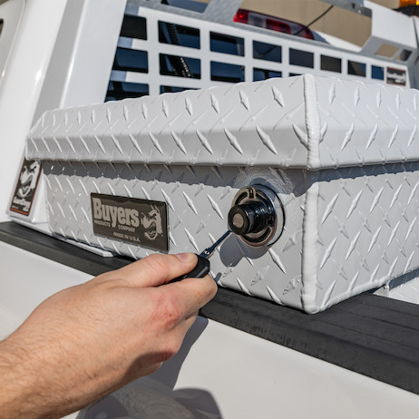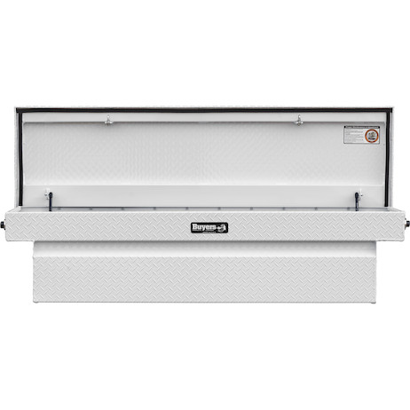 Constructed from durable, corrosion-resistant, and lightweight diamond tread aluminum, this truck tool box is built to last. A gloss white powder-coated finish provides long-lasting color. Push-button locks on either side ensure that your tools remain secure and readily accessible, while a weather-resistant seal protects your equipment from moisture and dirt. Installation is hassle-free, thanks to pre-drilled mounting holes and included mounting hardware.
