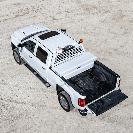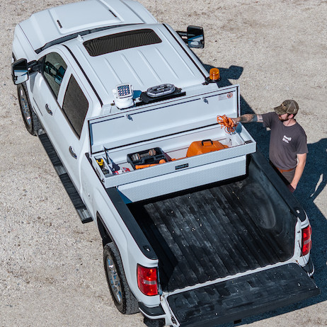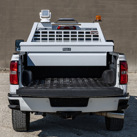 Protect and secure your equipment for the long haul with Buyers Products Diamond Tread Aluminum Crossover Truck Box. This truck box is designed to fit full-size pickups with 6.5-foot and 8-foot beds, suspending securely from your truck's bed side rails.