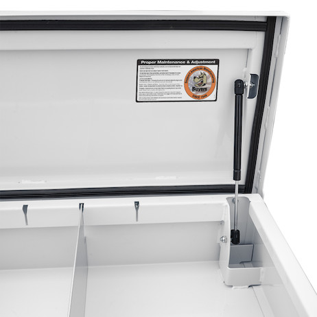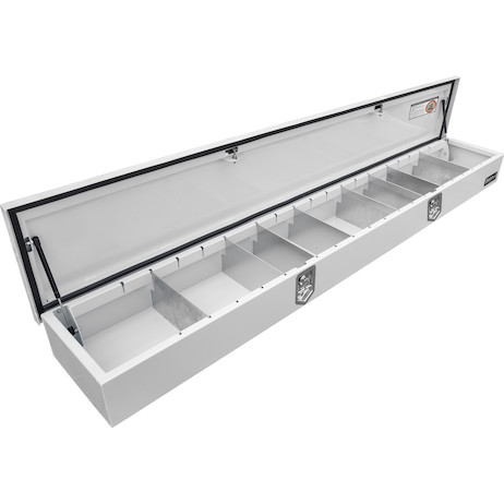 Each truck box is constructed from 14 Ga carbon steel and is powder-coated to prevent corrosion. The stainless-steel hinge and weather-resistant seal keep moisture and dirt away from your equipment. Protect against weather and theft with locking stainless steel compression latches. Gas shocks ensure the flip-up door opens smoothly and stays open. Adjustable dividers are included, and allows users to optimize the storage space inside the truck box.