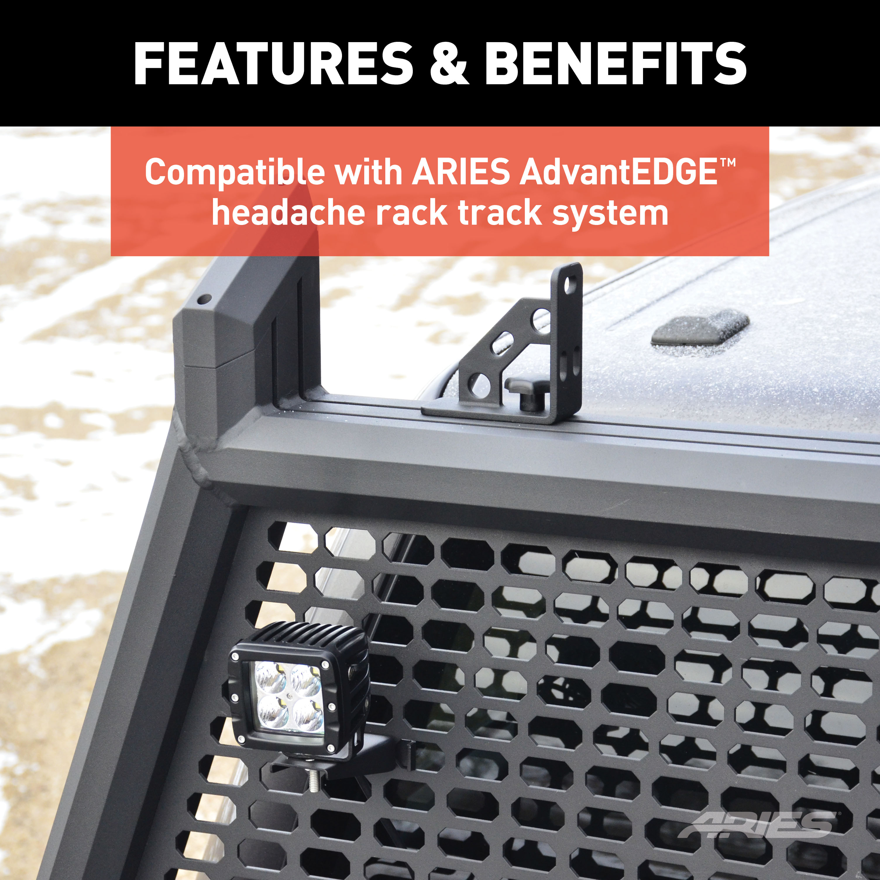 - Securely mounts onto the AdvantEDGE headache rack track system