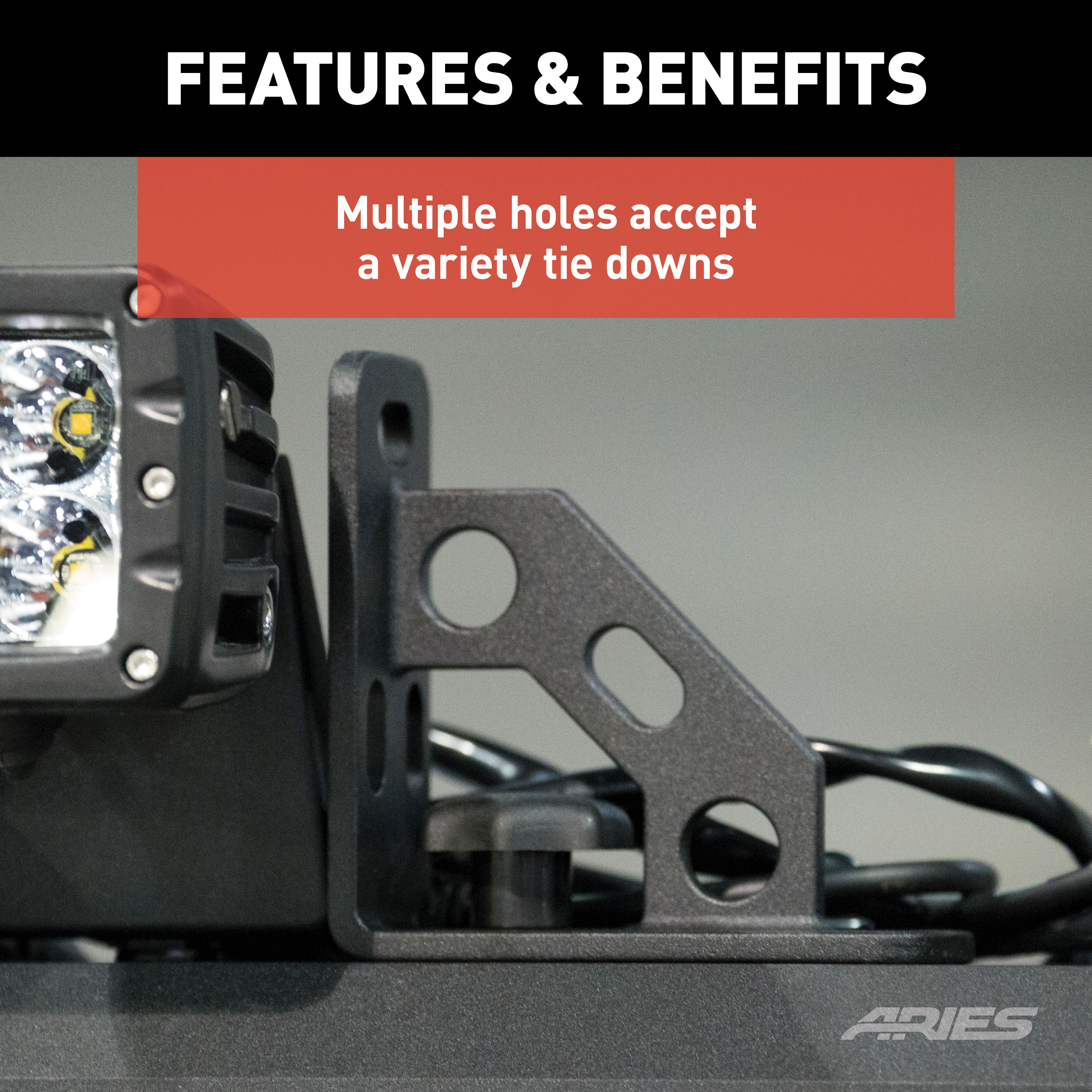 The ARIES AdvantEDGE headache rack adds style and protection to the modern pickup truck, featuring a lightweight, all-aluminum construction and a unique, octagonal tube profile. The headache rack is also designed to add functionality to the truck, with these highly adjustable tie-down anchors. The AdvantEDGE tie-down anchors attach using the track system along the top edge on the headache rack. They provide multiple holes to accept a variety of different cargo straps, ropes or bungee cords. Because the tie-downs use the track system and feature an easy-to-operate threaded knob, adjusting their position is fast, simple and completely customizable. Two tie-down anchors are included in this package. NOTE: Tie-downs should not be used to secure loads in the bed of the pickup truck or any other place that would cause the tie-downs and headache rack to be side loaded. Tie-downs should only be used to secure loads on top of the headache rack.