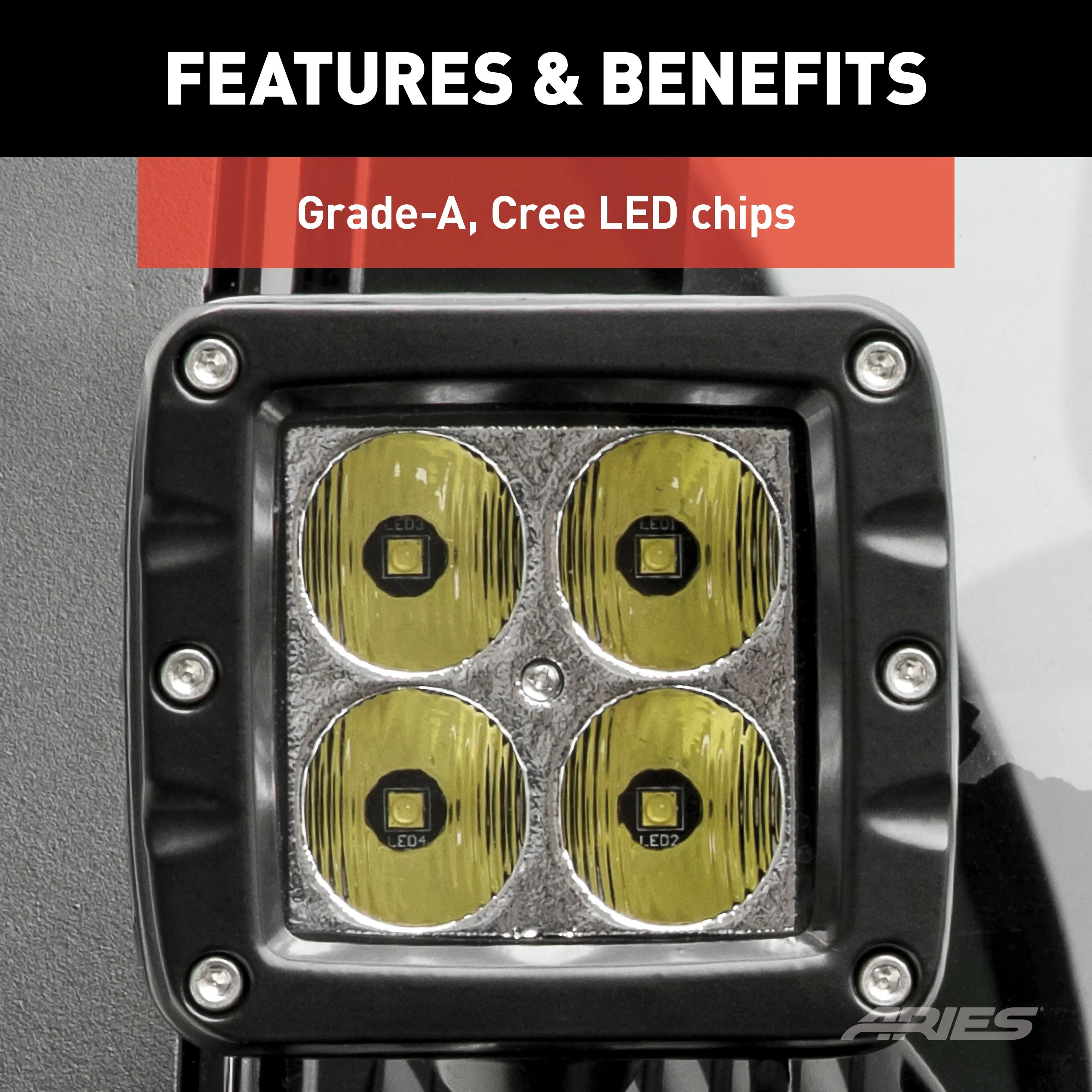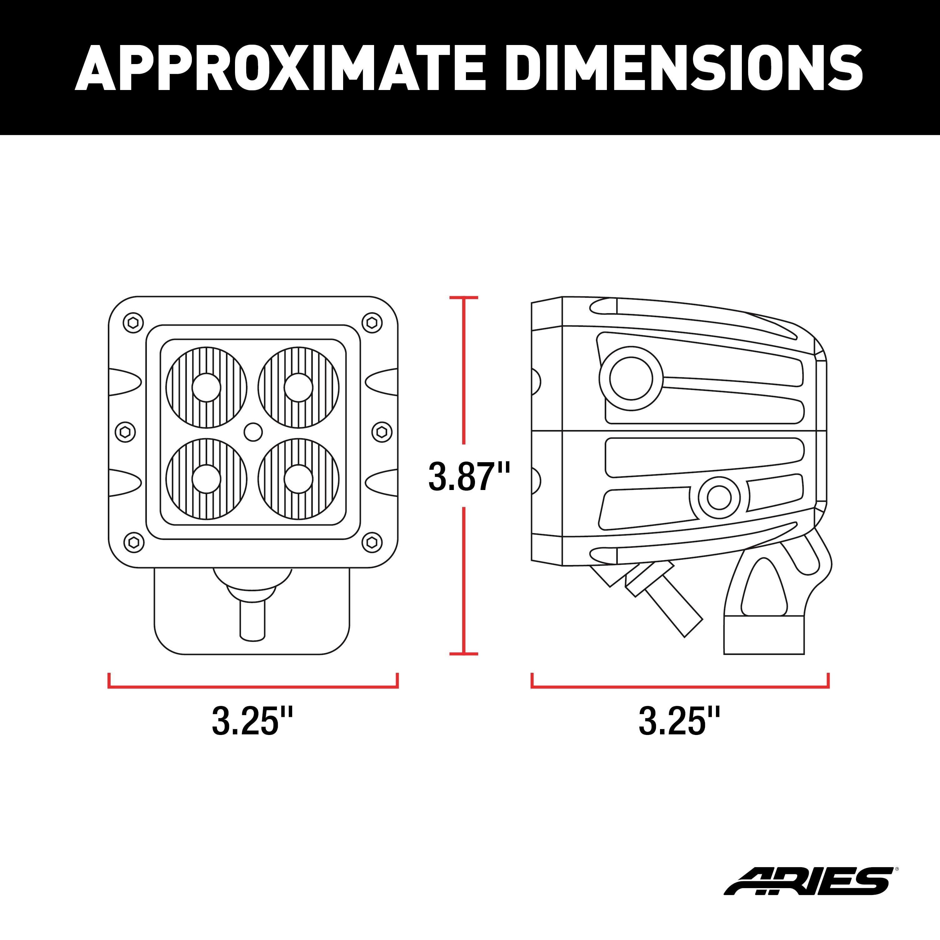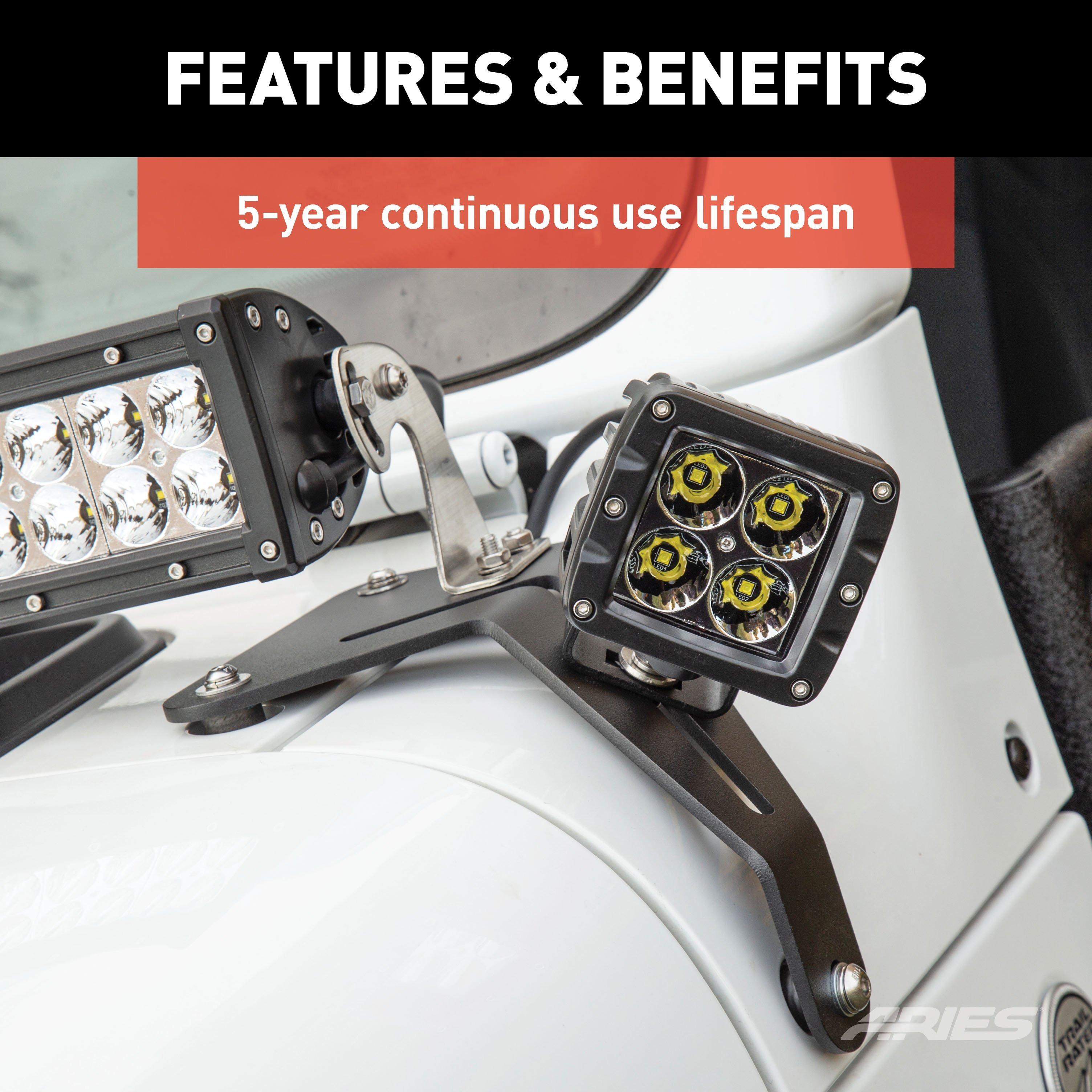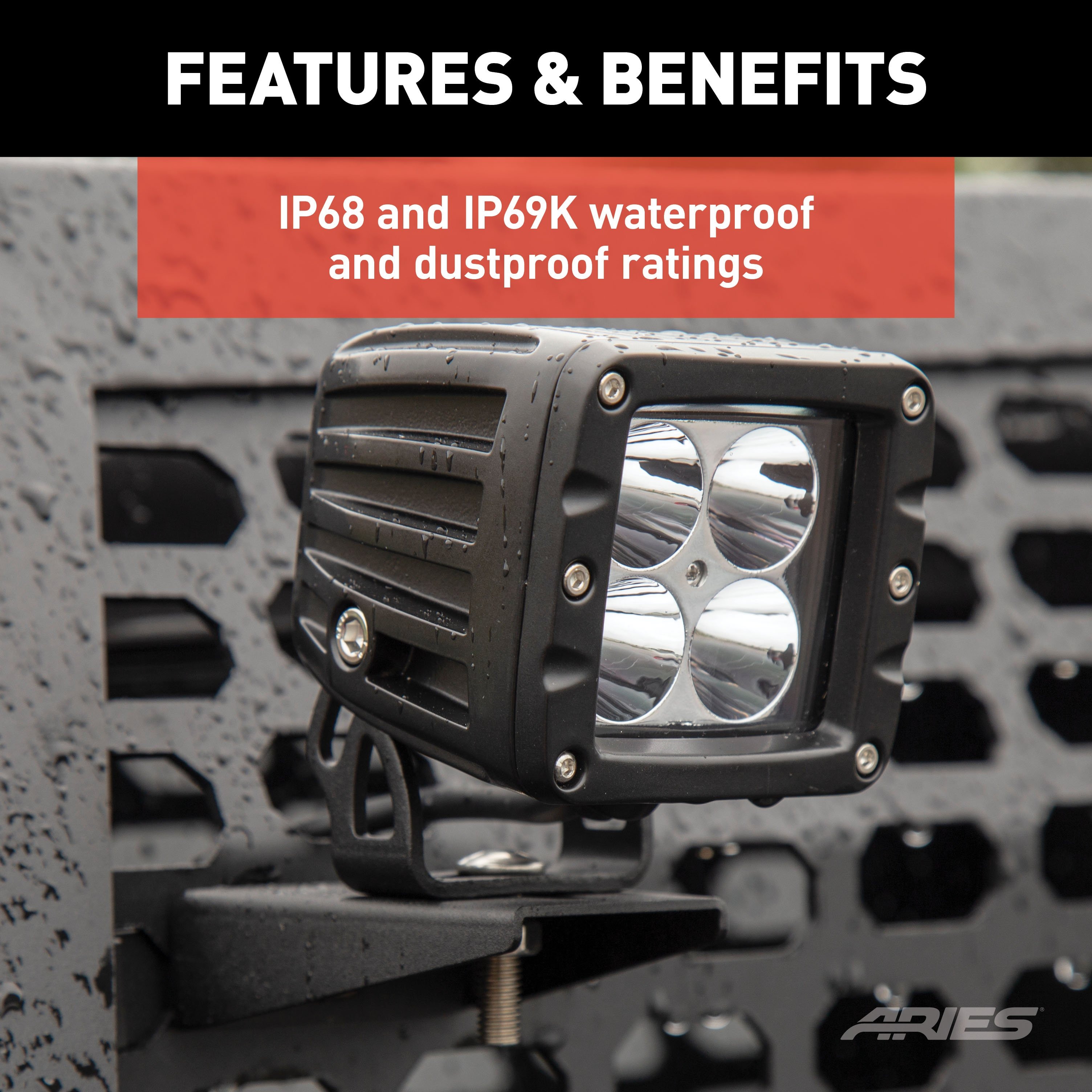 ARIES LED lights are made to shine bright, last long and take a beating. Each light boasts grade-A LED chips, an IP68-standard breather, waterproof aluminum construction, a 50,000+ hour lifespan and a pedigree of thorough testing and certifications. At the heart of each ARIES LED light is a set of grade-A LED chips. Each LED is set into a high-efficiency reflector to eliminate as much wasted light as possible and allowing for 96% reflector efficiency. This means a farther-reaching, more powerful beam without increased electrical input or higher running temperatures. The LED chips are securely mounted in a strong, rust-free aluminum housing and shielded with a rugged Lexan lens to withstand impacts and resist cracking. The housing keeps moisture out and allows us to give our LED lights an IP68 and IP69K waterproof and dustproof rating. Each light is also equipped with an IP68-standard breather that completely seals the housing and keeps moisture and air from getting inside and corroding the LEDs. ARIES LED lights are outfitted with dual, oversize heat sinks for optimal efficiency and longevity. These heat sinks keep running temperatures low, protect against burnout and promote a long operating life. Our lights average a 50,000-hour lifespan, translating to five years of continuous use. They also feature instant on-off, so no time is wasted waiting for the light to warm up. To prove that our LED lights are different, they undergo strenuous testing, including a UV test, extreme temperature test, vibration test, dust test, salt test and altitude test. They are CE-certified and RoHS-certified. Each light comes with stainless steel mounting hardware and pivoting bracket for custom positioning on your vehicle, and each is fitted with a strong, waterproof wiring harness for a reliable connection.