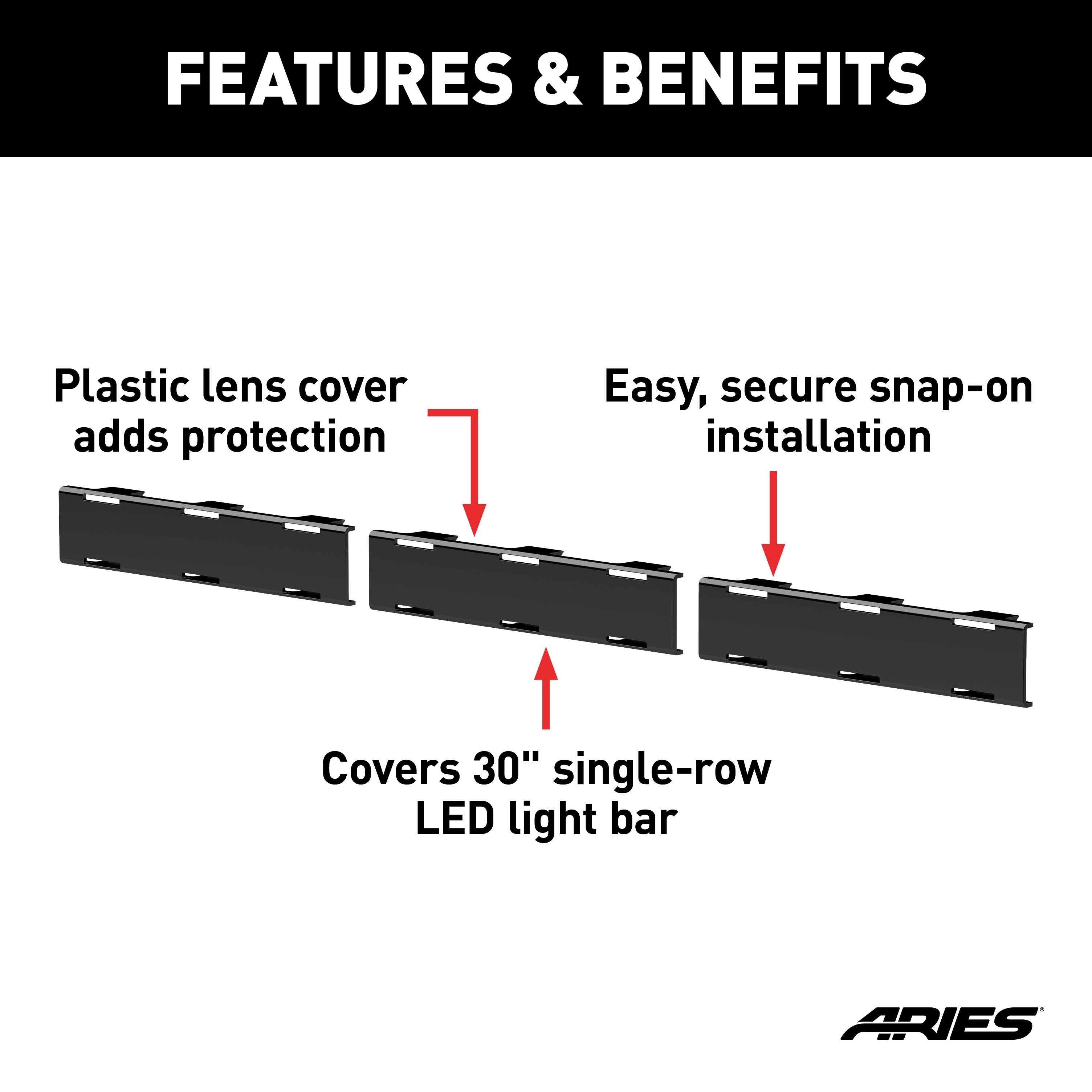 ARIES LED light bars and work lights help turn any truck, Jeep or SUV into the ultimate off-road ride. They are built with grade-A LED chips, an IP68-standard breather, waterproof aluminum construction and a 50K-hour lifespan. For all ARIES LED light bars or work lights, we offer LED light covers. These covers help make the vehicle street-legal in states where covers are required on the road (not all states require LED light covers). The lenses are made with a durable black plastic and provide a protective shield against scratches and road grime. This particular package includes three 10" LED covers to protect the ARIES 30" single-row LED light bar #1501264. All ARIES LED covers feature a simple, secure snap-on mounting system to install in seconds without any hardware or tools required.