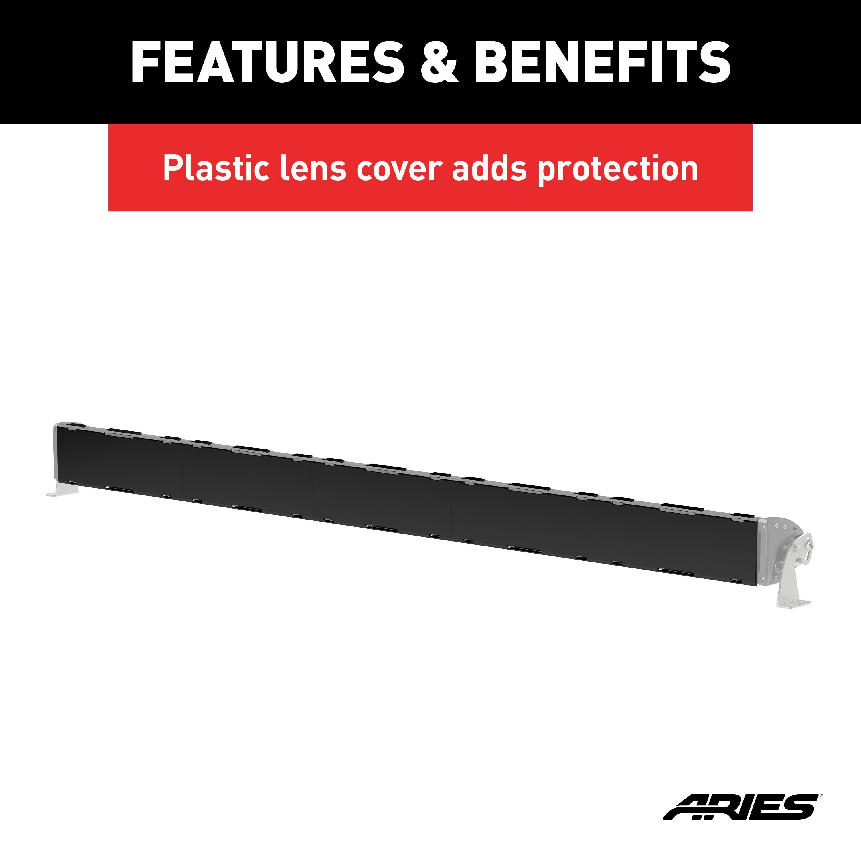 ARIES LED light bars and work lights help turn any truck, Jeep or SUV into the ultimate off-road ride. They are built with grade-A LED chips, an IP68-standard breather, waterproof aluminum construction and a 50K-hour lifespan. For all ARIES LED light bars or work lights, we offer LED light covers. These covers help make the vehicle street-legal in states where covers are required on the road (not all states require LED light covers). The lenses are made with a durable black plastic and provide a protective shield against scratches and road grime. This particular package includes five 10" LED covers to protect the ARIES 50" double-row LED light bar #1501278. All ARIES LED covers feature a simple, secure snap-on mounting system to install in seconds without any hardware or tools required.