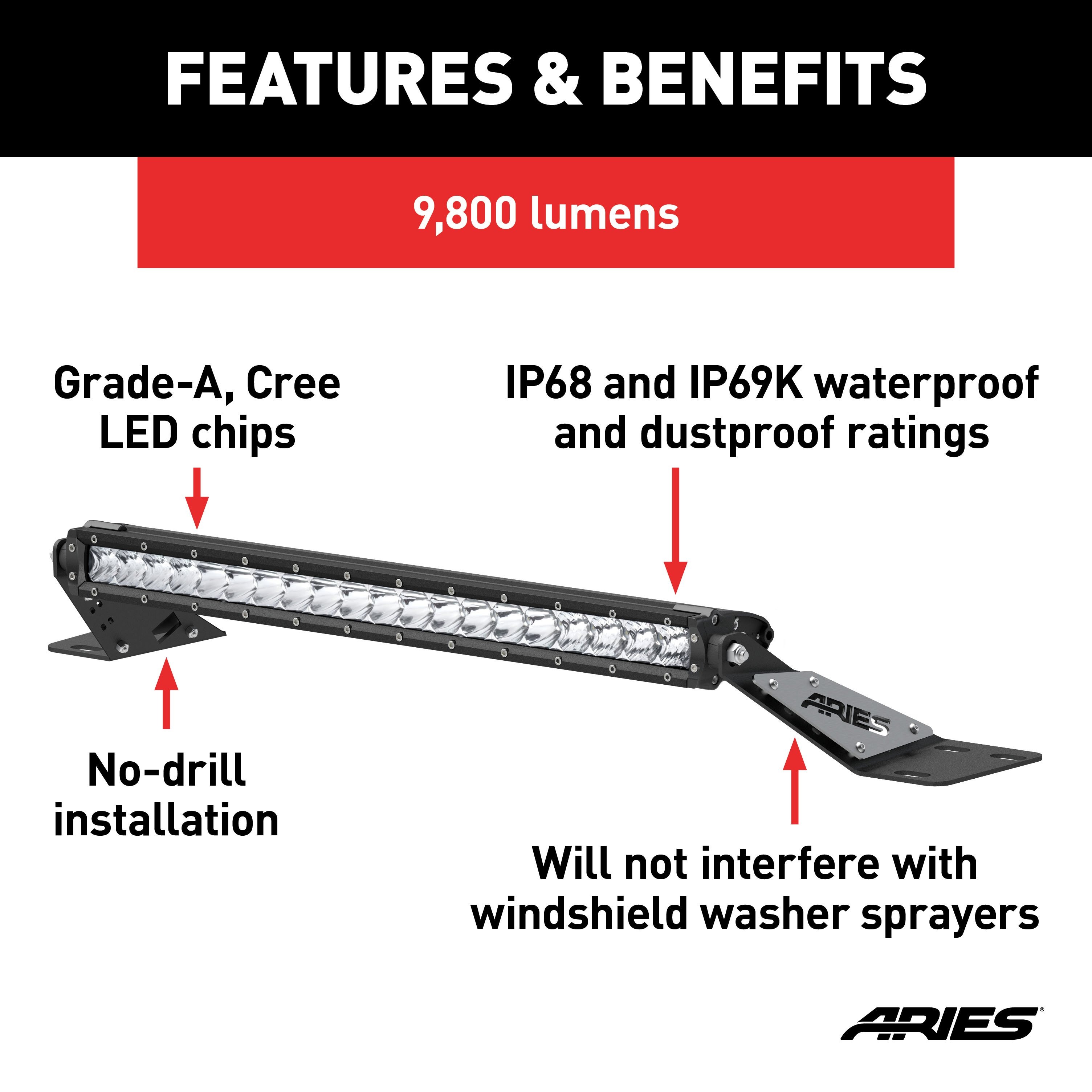 ARIES 1501302 20-Inch LED Light Bar for Jeep Wrangler TJ, Hood Mount Brackets, 9,800-Lumen Combo Beam