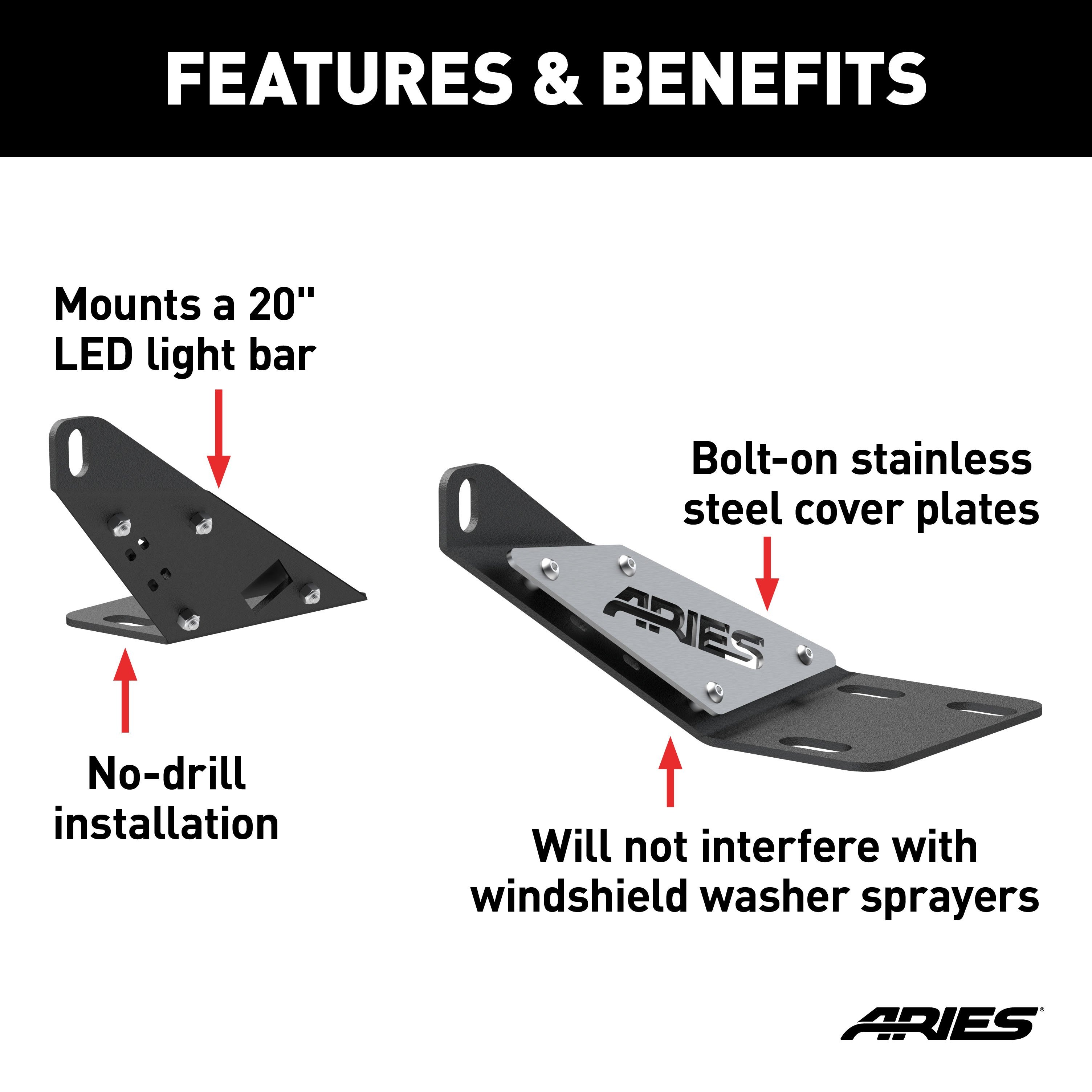 There is a sense of possibility unlike any other that comes every time you grip the wheel of your Wrangler and throw the transmission into drive. For shedding a little extra light on the trail and standing out from the rest of the herd, ARIES Jeep hood light mounting brackets are the accessory of choice. They mount quickly and easily on the hood of the Jeep Wrangler TJ, using factory mounting points, and accept an LED light bar up to 20" long (ARIES 20" single-row LED light bar #1501262 recommended). Because they use existing mounting locations, there is no drilling necessary, and the brackets will not interfere with the factory windshield washer sprayers. To easily outlast rust and keep your Jeep TJ looking like a pro, these LED light bar mounting brackets are made from stainless steel and are shi elded in a carbide black powder coat finish.