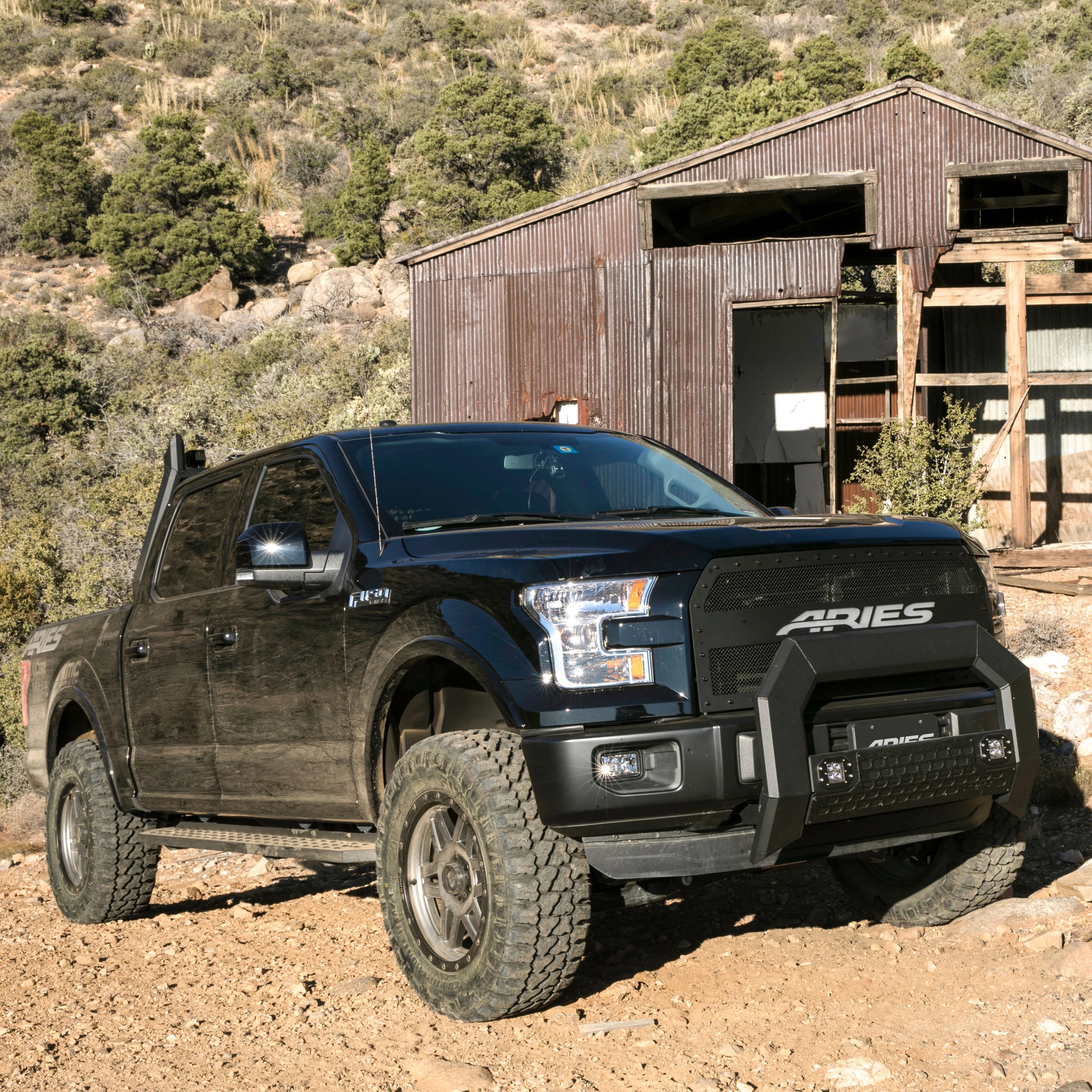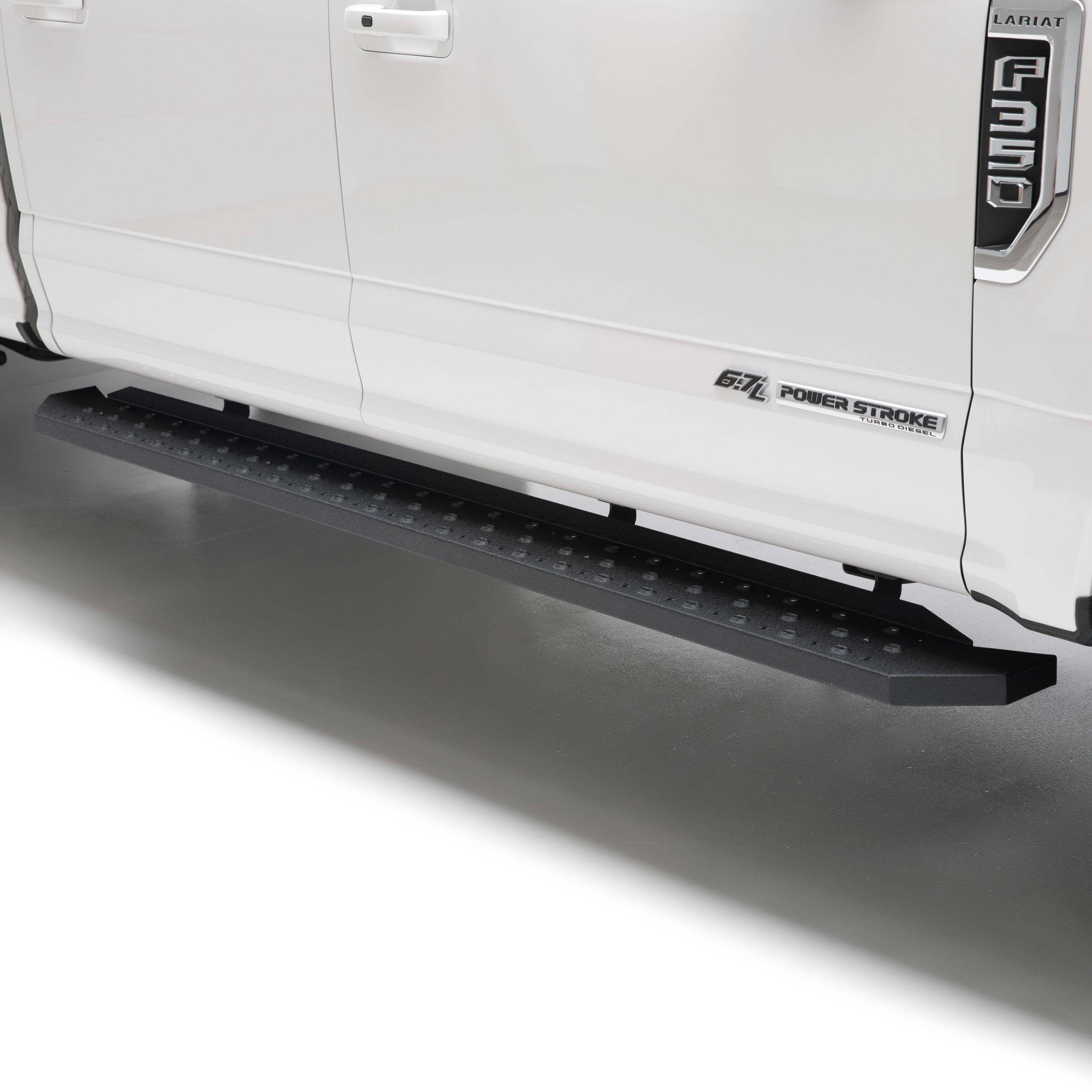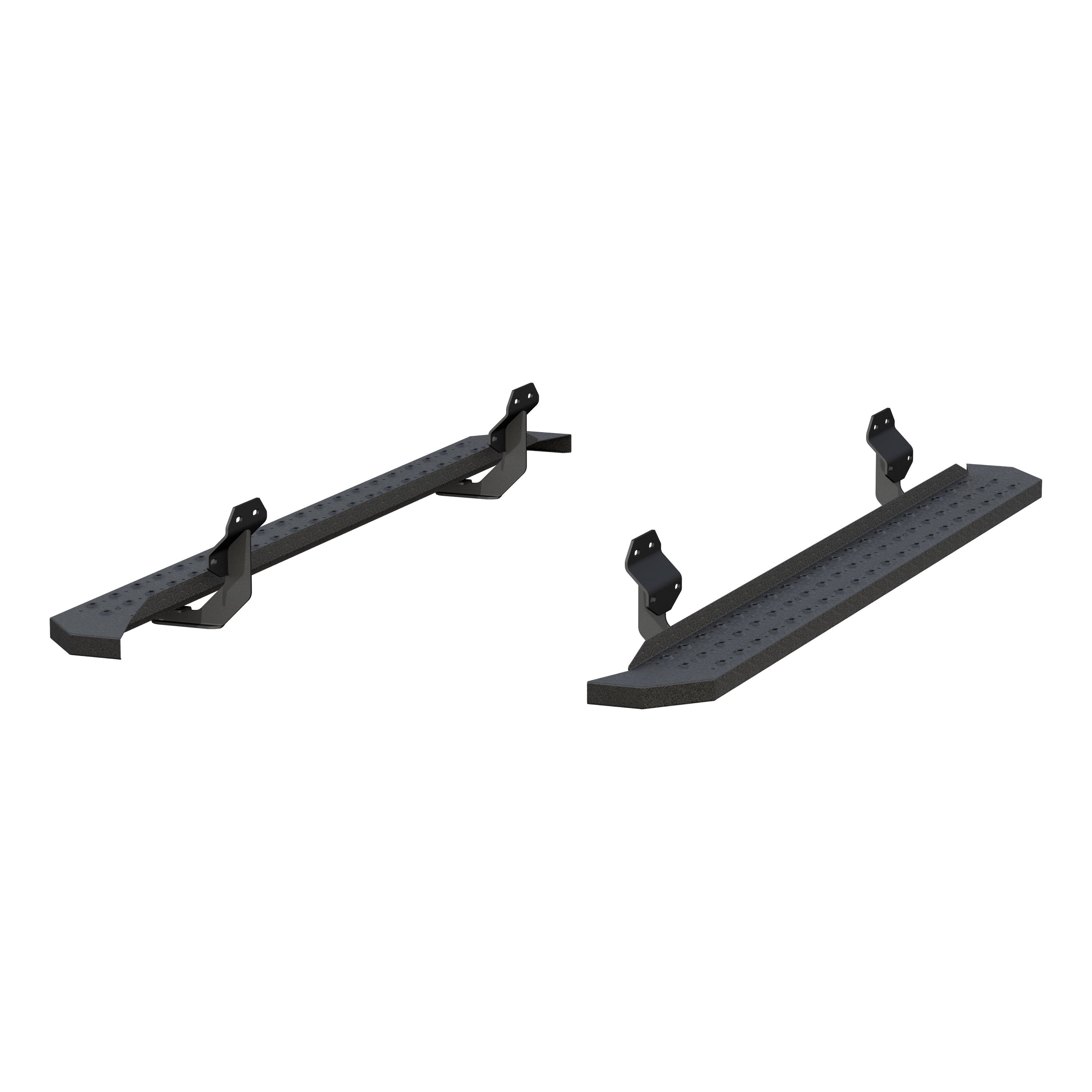 Powerful, definitive and uncompromising as a mountain ridge, ARIES RidgeStep running boards are made for those who gets it done, day after day. With their solid, all-steel construction, non-skid treads and tough powder coat finish, RidgeStep running boards are made to finish the job. Installation of these running boards is easy and secure because they use the ARIES VersaTrac mounting system. The underside of each board is equipped with a channel that accepts a set of heavy-duty bracket inserts. The inserts move along the channel to fit your truck, and the mount ing hardware provides a secure attachment. These running boards are designed to fit specific years of the Ford F-150, F-250 Super Duty, F-350 Super Duty, F-450 Super Duty and F-550 Super Duty (NOTE: This set of running boards includes vehicle-specific VersaTrac mounting brackets. See the application information to verify compatibility with your vehicle). ARIES RidgeStep running boards are not only made for easier installation, but they are also built to face the harsh elements of the commercial job. They feature high-strength, solid steel construction for a step that can keep up with those steel-toe boots, and they are completely without plastic parts, meaning they will not crack or fade over time. Their stamped, all-steel tread offers a 6-1/2" wide, non-skid surface that will never wear down no matter how many times you climb in and out of your truck. The end caps are also made from steel and are welded to contour to the body of your truck for a professional finish. RidgeStep running boards come with a unique E-coat and textured black powder coat finish to not only withstand rust but also to hide minor scratches and grime.