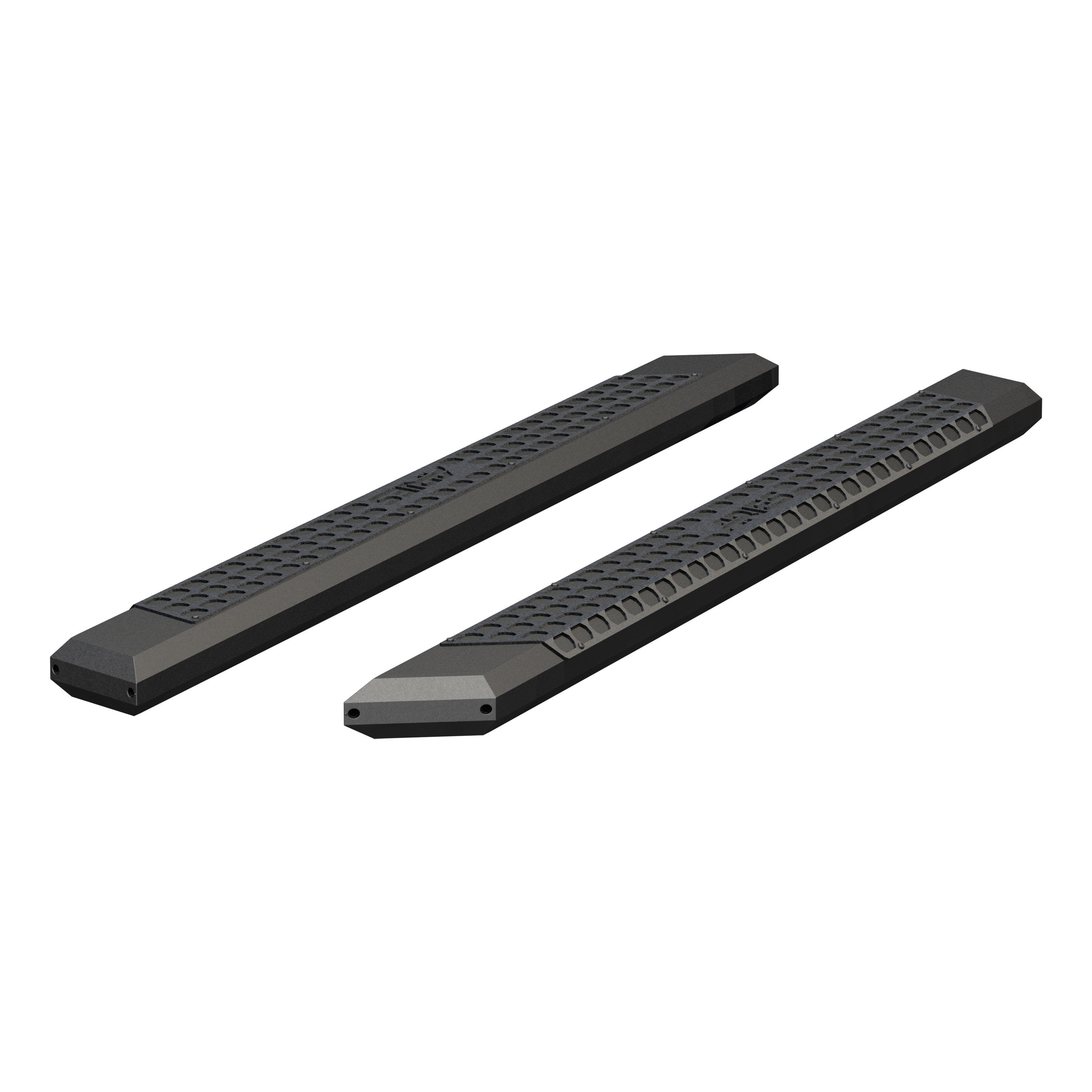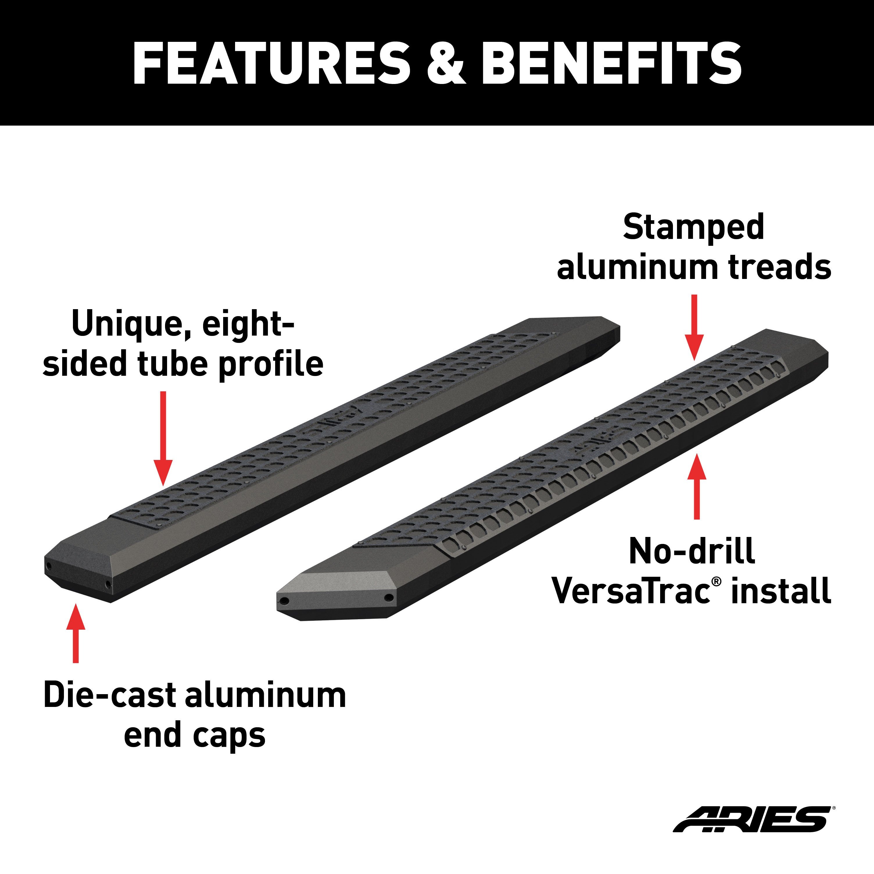 ARIES AdvantEDGE side bars do away with the common, rounded look of other side bars and nerf bars, featuring an angular, eight-sided tube profile and powder-coated all-aluminum construction. The angular edges provide a clear-cut, uncompromising accent for the look of today's trucks. Made from 5-1/2" wide, eight-sided, extruded aluminum tubing, AdvantEDGE side bars are strong, lightweight and impervious to rust, offering a solid step that is built to face the elements and outlast them. They also come with die-cast aluminum end caps and a stamped aluminum tread. The aluminum treads provide a long-lasting, non-skid stepping surface that will not crack or fade in the sun. ARIES AdvantEDGE side bars are also marked for their easy, custom-fit installation. They feature the ARIES VersaTrac mounting system with brackets that are made from powder-coated steel and built for specific vehicles (NOTE: VersaTrac mounting brackets are sold separately; see application information to determine which brackets and side bars fit your vehicle). The high-strength steel brackets mount using pre-existing holes, and the side bars attach to the brackets with heavy-duty hardware and a full-length channel. The VersaTrac mounting system makes installation simple and customizable, allowing the side bars to be swapped out at any time with other side steps or running boards that feature the VersaTrac system. Setting yourself apart is simple with the ARIES AdvantEDGE series. In addition to our AdvantEDGE side bars, we also offer the AdvantEDGE bull bar and AdvantEDGE headache rack, featuring the same all-aluminum construction and eight-sided tube profile. For a fully customized look to match your pickup, AdvantEDGE side bars are available in two finish options, including carbide black powder coat or chrome powder coat.