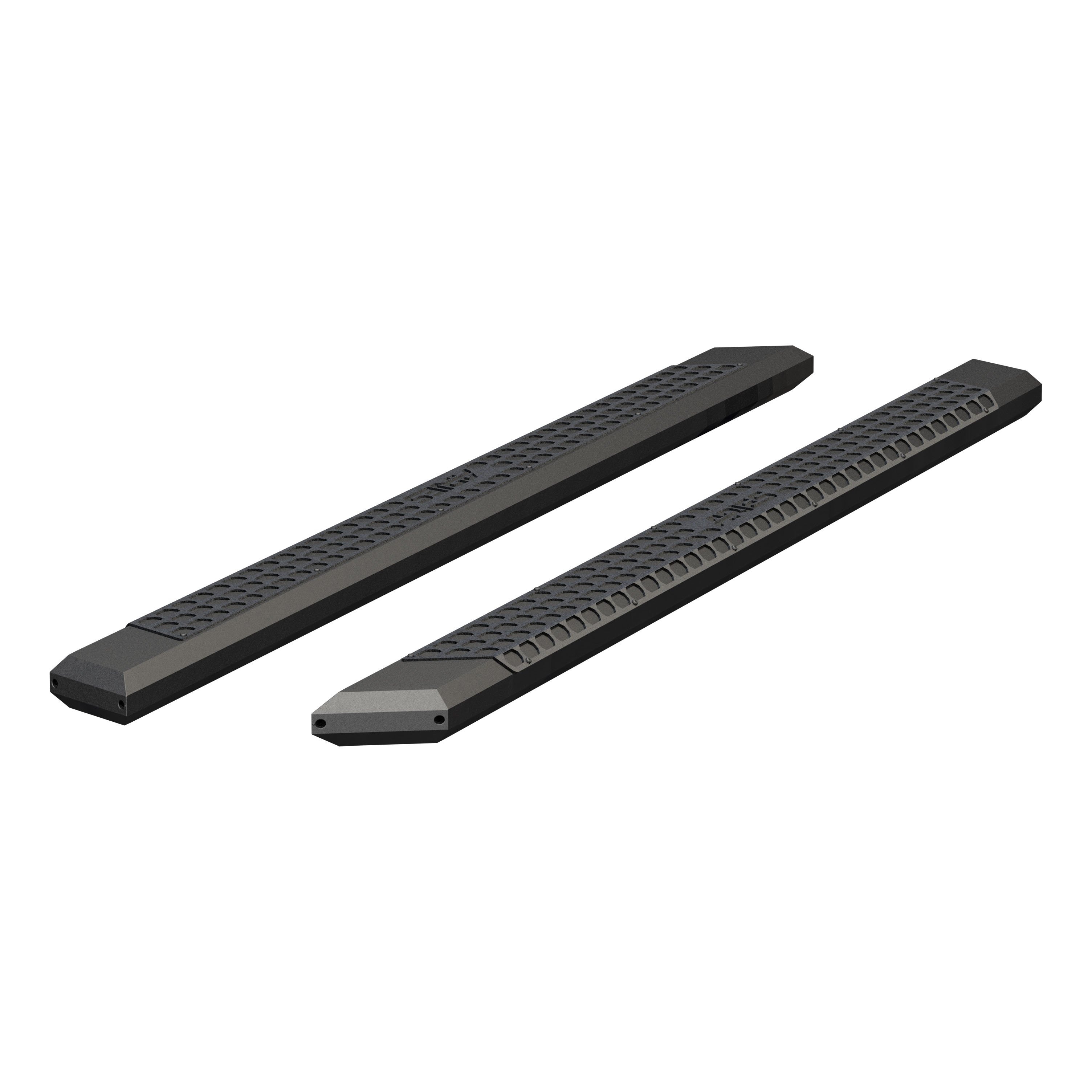 ARIES AdvantEDGE side bars do away with the common, rounded look of other side bars and nerf bars, featuring an angular, eight-sided tube profile and powder-coated all-aluminum construction. The angular edges provide a clear-cut, uncompromising accent for the look of today's trucks. Made from 5-1/2" wide, eight-sided, extruded aluminum tubing, AdvantEDGE side bars are strong, lightweight and impervious to rust, offering a solid step that is built to face the elements and outlast them. They also come with die-cast aluminum end caps and a stamped aluminum tread. The aluminum treads provide a long-lasting, non-skid stepping surface that will not crack or fade in the sun. ARIES AdvantEDGE side bars are also marked for their easy, custom-fit installation. They feature the ARIES VersaTrac mounting system with brackets that are made from powder-coated steel and built for specific vehicles (NOTE: VersaTrac mounting brackets are sold separately; see application information to determine which brackets and side bars fit your vehicle). The high-strength steel brackets mount using pre-existing holes, and the side bars attach to the brackets with heavy-duty hardware and a full-length channel. The VersaTrac mounting system makes installation simple and customizable, allowing the side bars to be swapped out at any time with other side steps or running boards that feature the VersaTrac system. Setting yourself apart is simple with the ARIES AdvantEDGE series. In addition to our AdvantEDGE side bars, we also offer the AdvantEDGE bull bar and AdvantEDGE headache rack, featuring the same all-aluminum construction and eight-sided tube profile. For a fully customized look to match your pickup, AdvantEDGE side bars are available in two finish options, including carbide black powder coat or chrome powder coat.