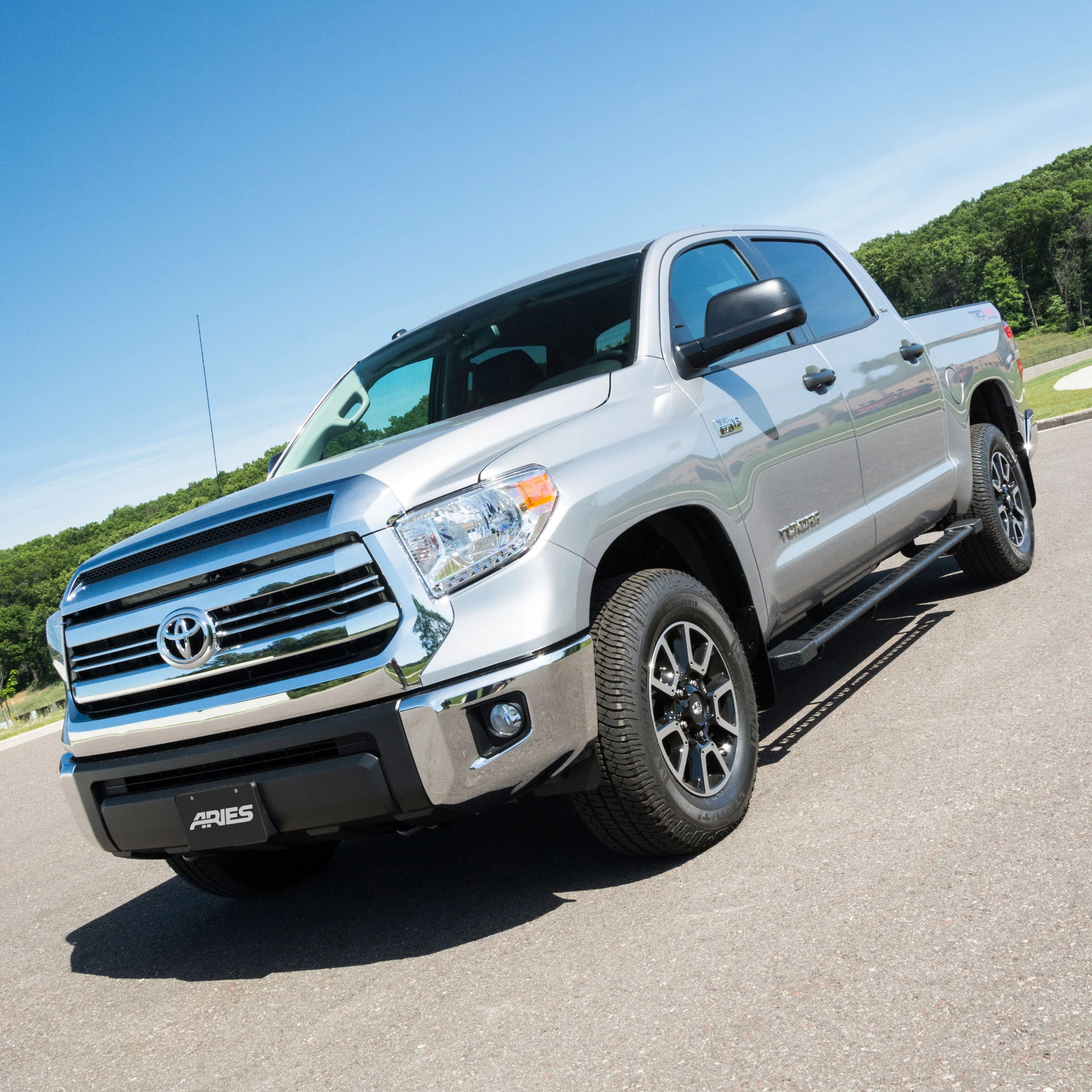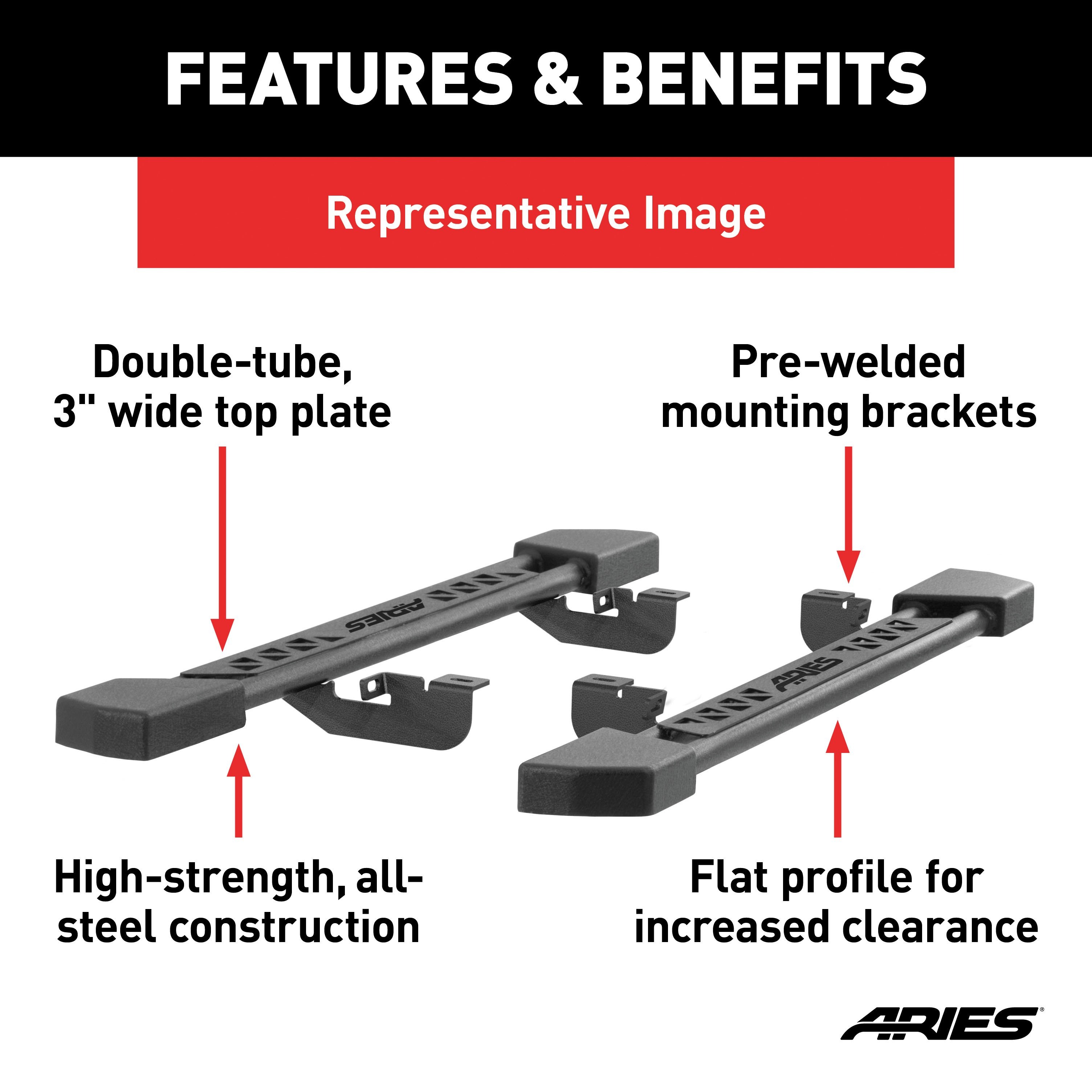 Sometimes side bars, nerf bars and running boards just aren't the right fit for the off-roader. When your vehicle is beefed up and built out the way it was born to be, you need a step up from ordinary. ARIES Rocker Step running boards are the ideal side accessory for the off-road-style truck, Jeep or SUV, featuring extra protection for your rocker panels, a convenient 3" wide step up and enough ground clearance to allow you to hold nothing back. While many rocker panel protectors are simple steel panels or tubes, the ARIES Rocker Step is something more. In addition to its all-steel construction, it has a wide, flat profile that provides two key advantages. First, it offers a convenient, comfortable step up into your vehicle The double-tube layout and welded top plate create a sturdy, 3" wide stepping surface. Second, the flat design offers added ground clearance. Unlike some side bars that are mounted down and away from the vehicle, ARIES Rocker Step running boards are set high enough to clear brush, boulders and other off-road debris. They also feature a durable E-coat and textured black powder coat finish to resist rust and hide scratches and grime. Mounting ARIES Rocker Step running boards is fast and easy. They come with vehicle-specific mounting brackets, pre-welded into place, to provide reliable footing and a custom fit on your vehicle. This particular set of Rocker Step running boards fits specific years of the Toyota Tundra (see application info to verify fitment). The brackets install using pre-existing mounting locations to eliminate the need for drilling and cut down on installation time. ARIES Rocker Steps are sold in pairs for the driver and passenger side and come with all necessary mounting hardware.