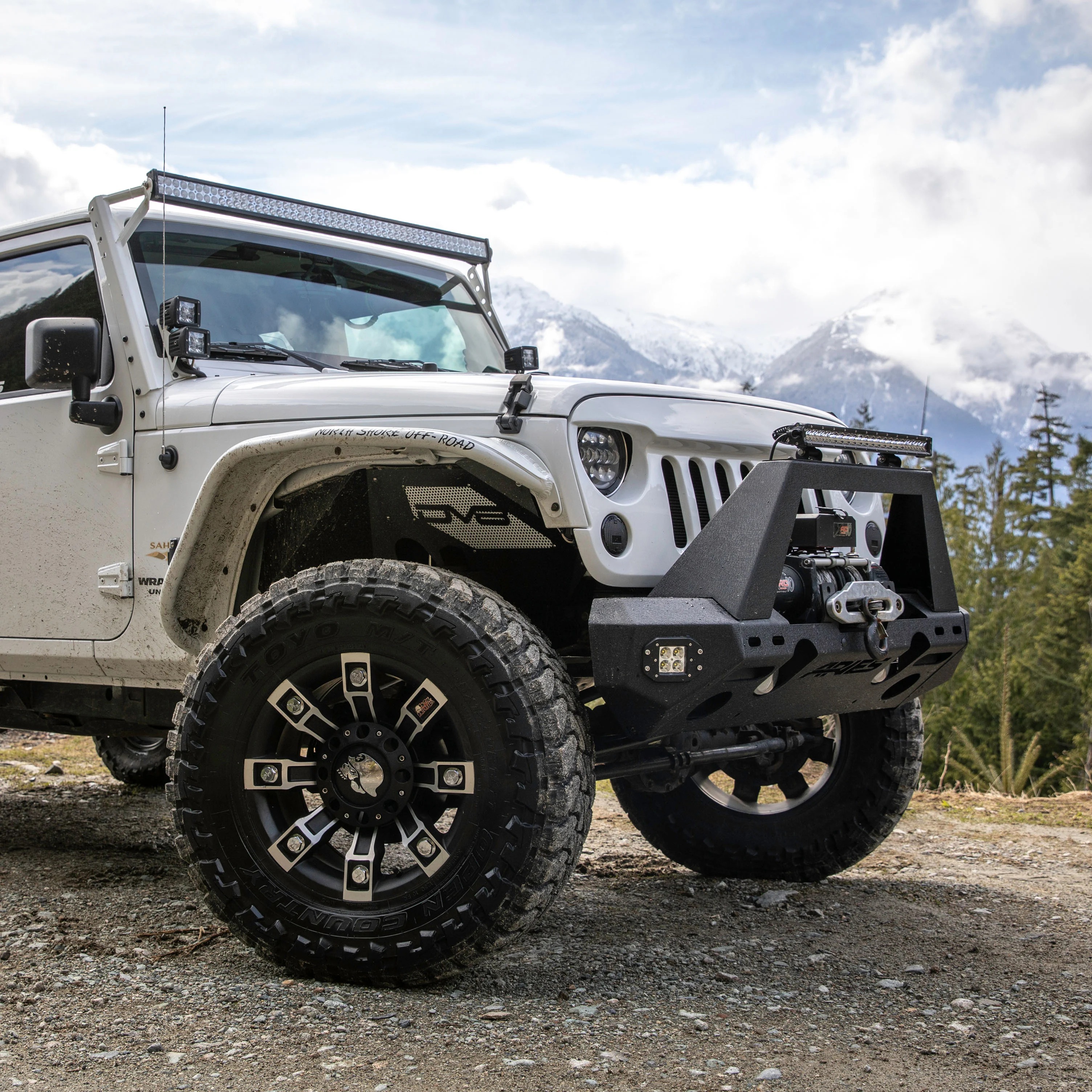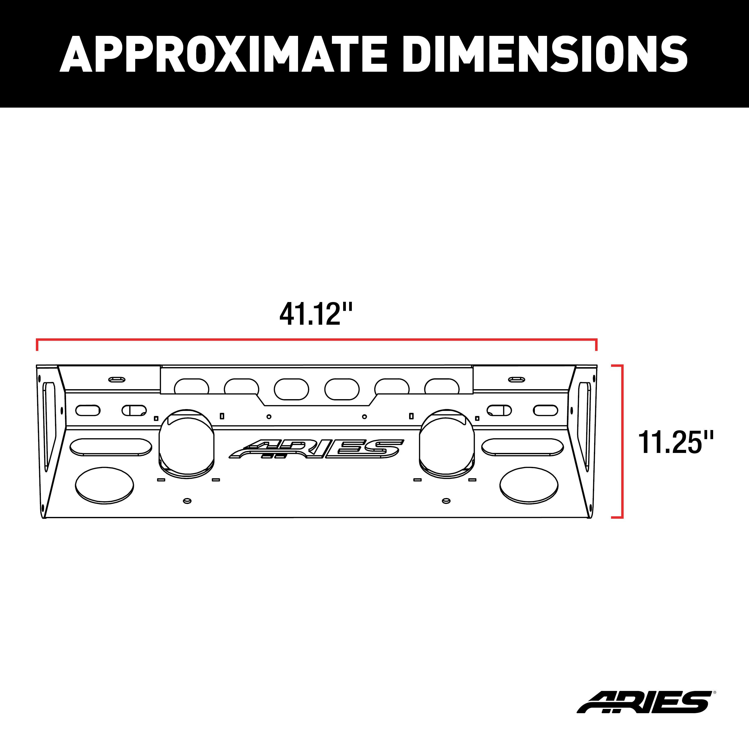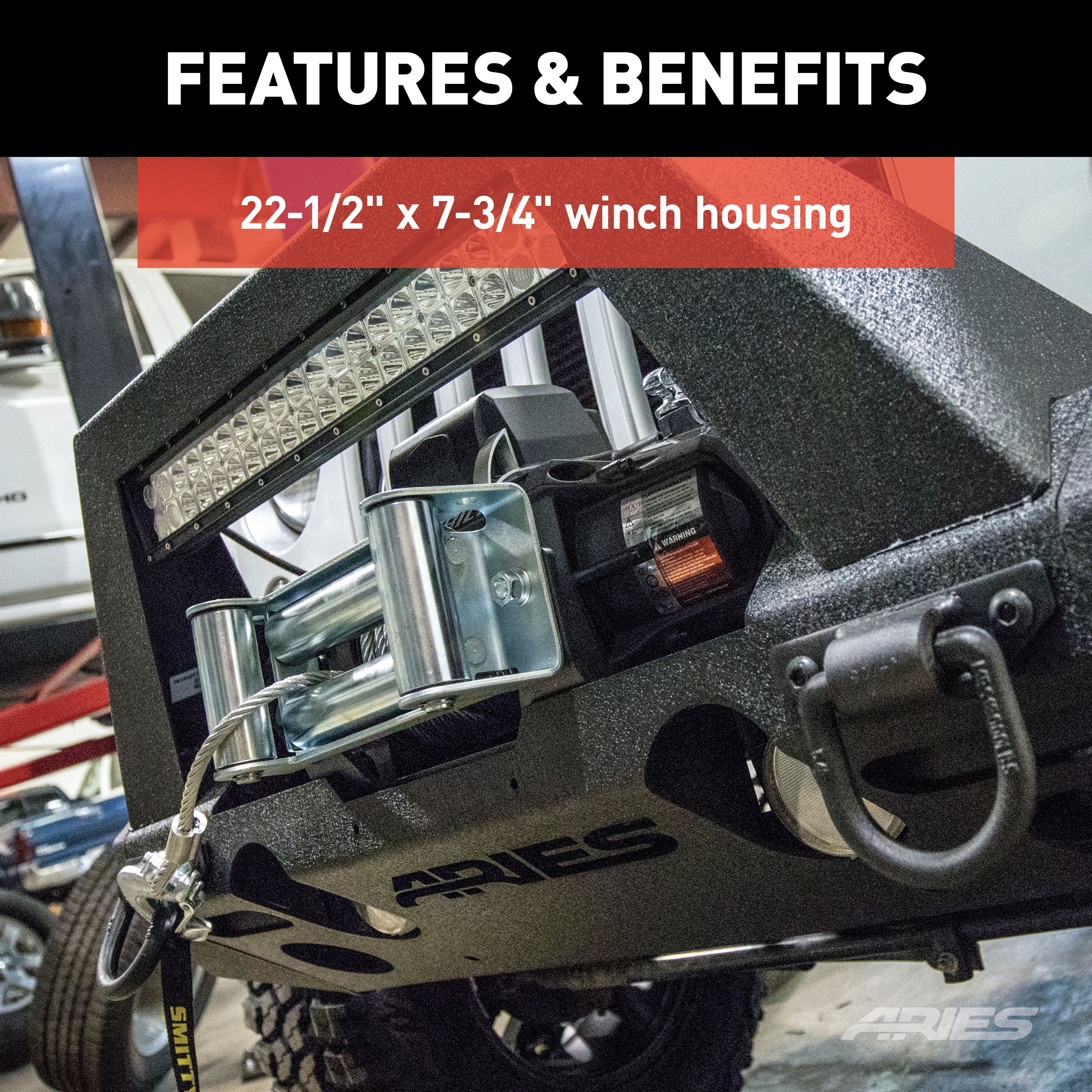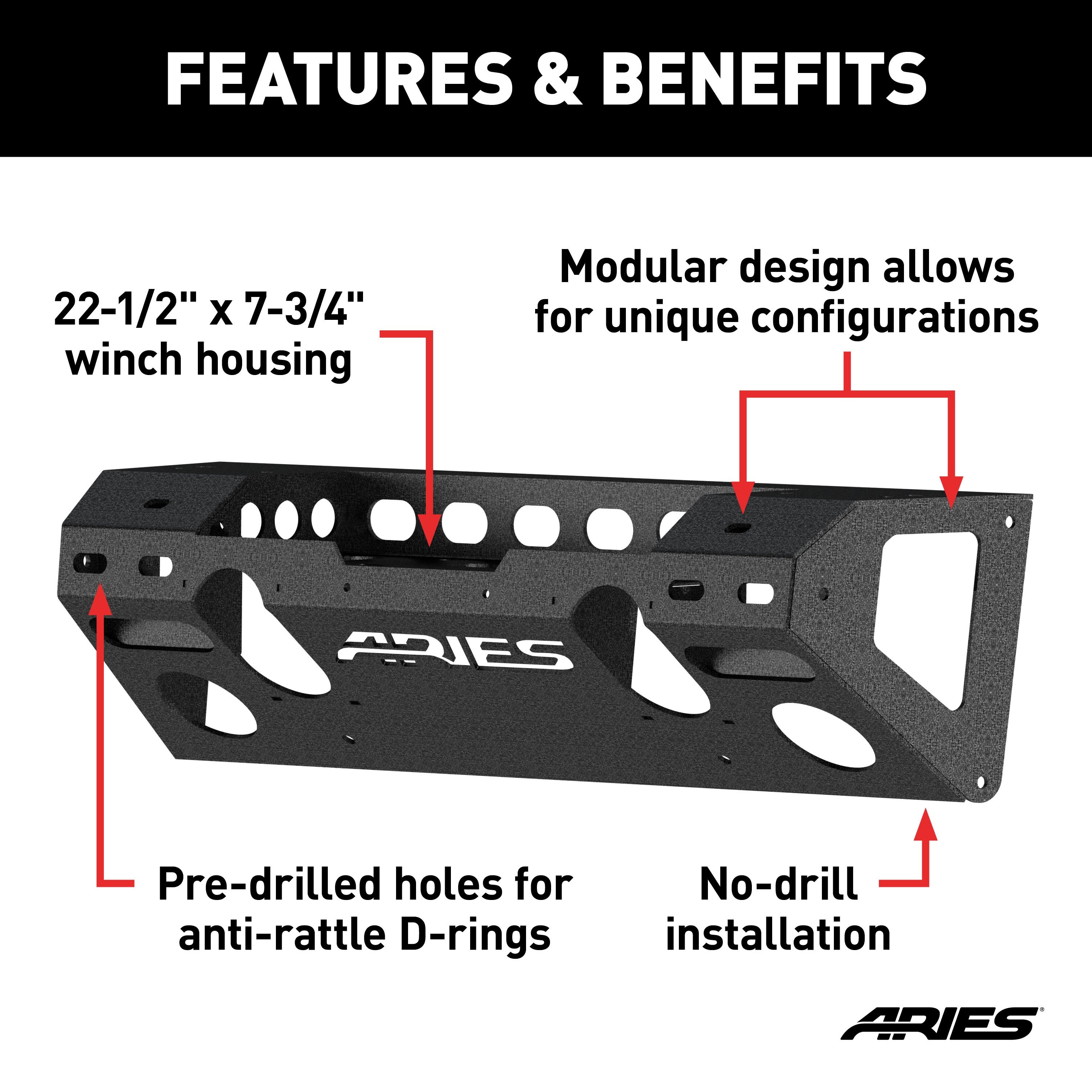 The ARIES TrailChaser Jeep bumper is unlike any other bumper for the Jeep Wrangler JK because it features a modular design. Each piece can be attached or swapped out as desired, giving you complete freedom of customization and a look that best characterizes your Jeep Wrangler. All TrailChaser bumpers are also compatible with a variety of accessories, including LED lights, D-rings, tow hooks and a winch. This particular piece includes the front-end center section only and is intended to accept corners and brush guards (sold separately). It is constructed from T6 aluminum alloy to be strong, lightweight and rust-free, and has a unique, textured black powder coat finish for maximum corrosion resistance. It is also available in high-strength, powder-coated steel. This bumper center section features a standard 22-1/2" x 7-3/4" winch housing and is compatible with the ARIES winch adapter #2072100 for larger winches. It provides cutouts for lights and has pre-drilled holes for D-rings #2081300 and tow hooks #15600TW (lights and accessories not included). All ARIES TrailChaser bumpers install using pre-existing factory mounting points for fast, easy installation with no drilling required.
