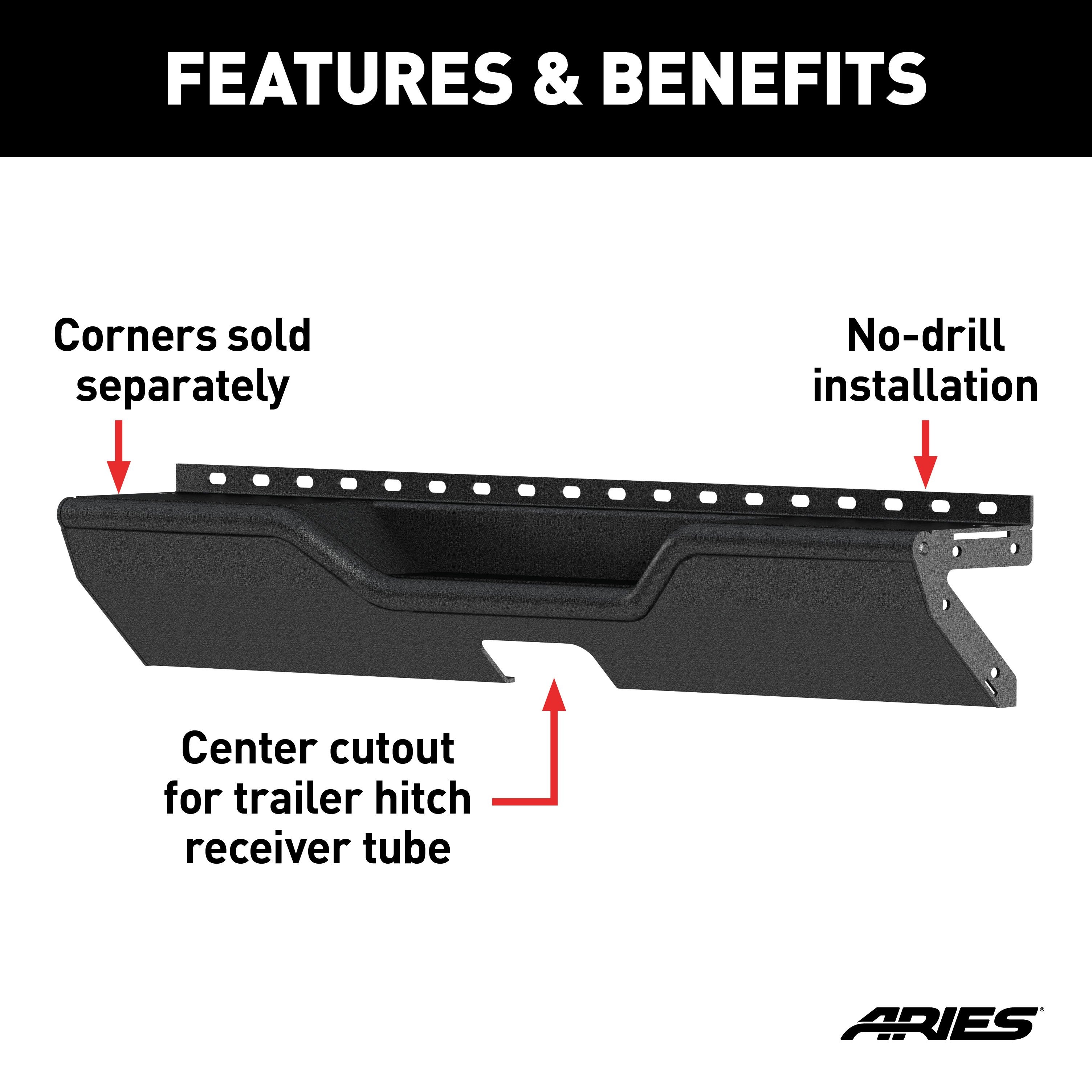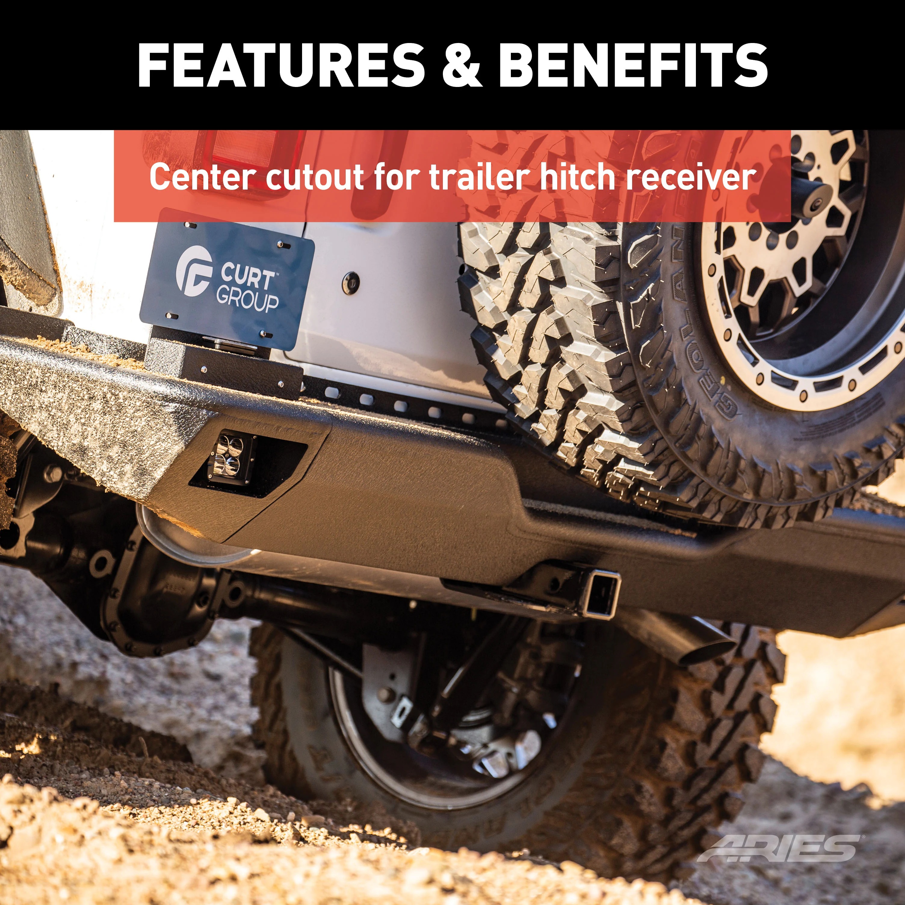 The ARIES TrailChaser Jeep bumper is unlike any other bumper for the Jeep Wrangler JL because it features a modular design. Each piece can be attached or swapped out as desired, giving you complete freedom of customization. This particular piece includes the rear center section only and is intended to accept corners (sold separately). It is constructed from T6 aluminum alloy to be strong, lightweight and rust-free, and has a unique, textured black powde r coat finish for maximum corrosion resistance. It is also available in powder-coated steel.