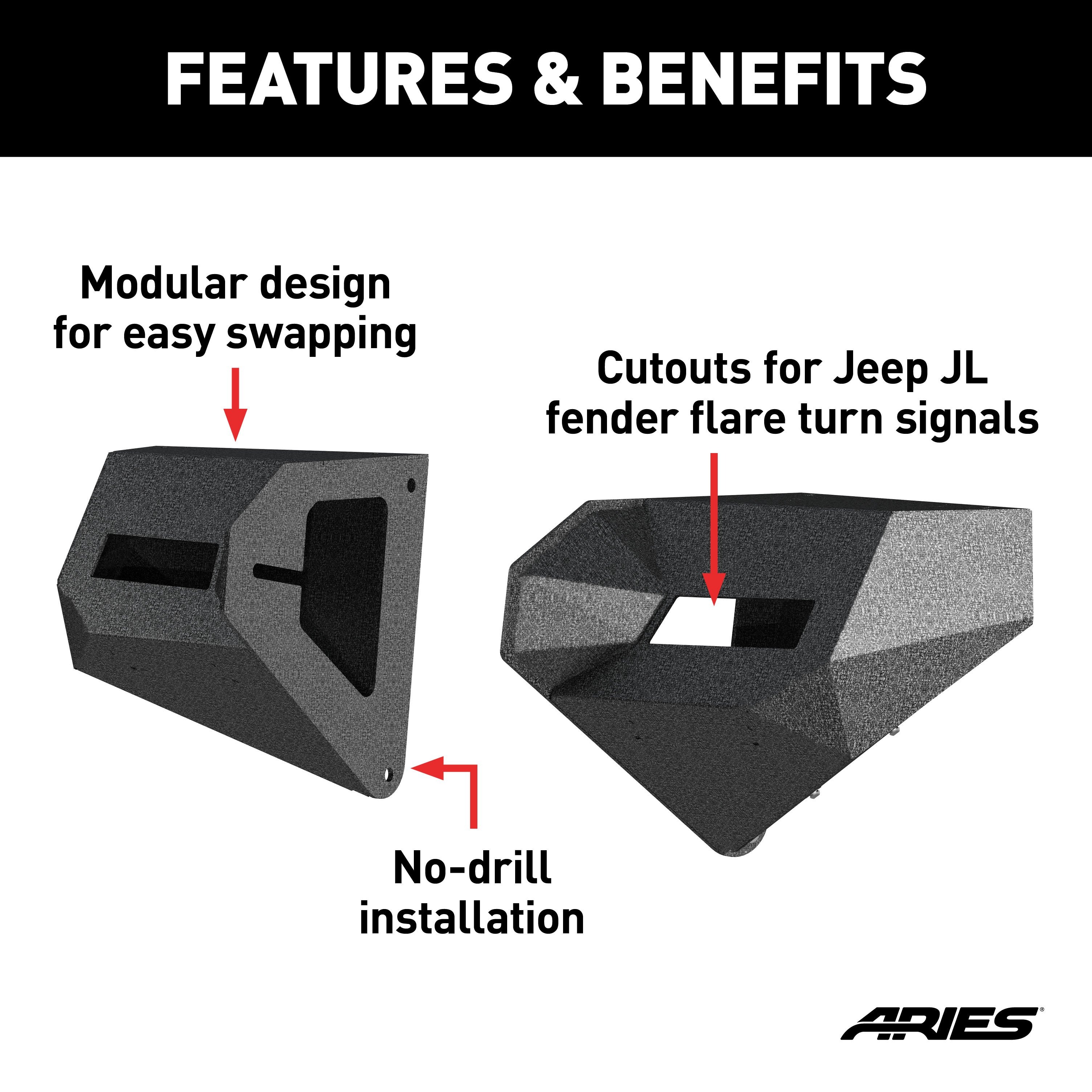 - Provides cutouts for integrating Jeep JL / JT fender flare turn signals