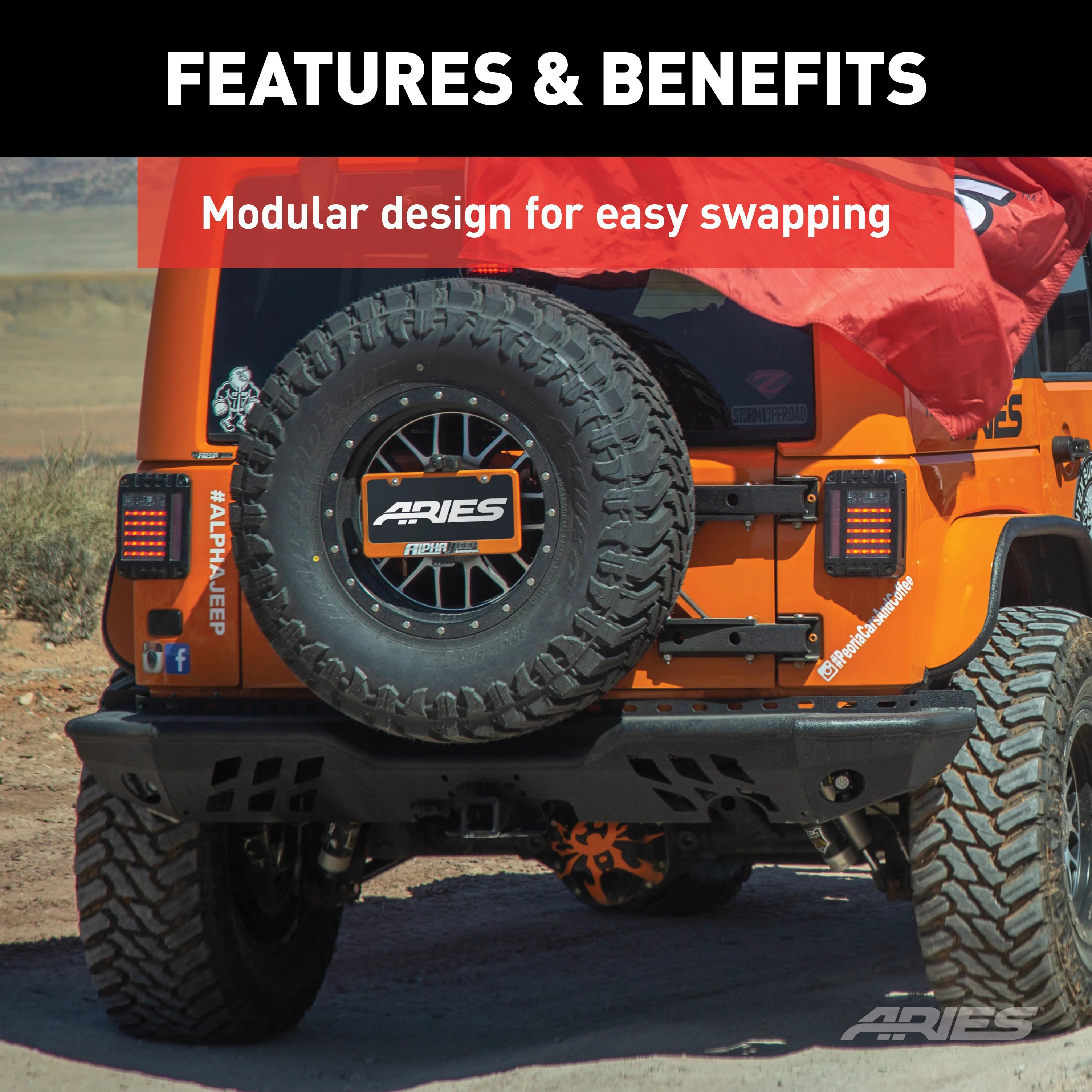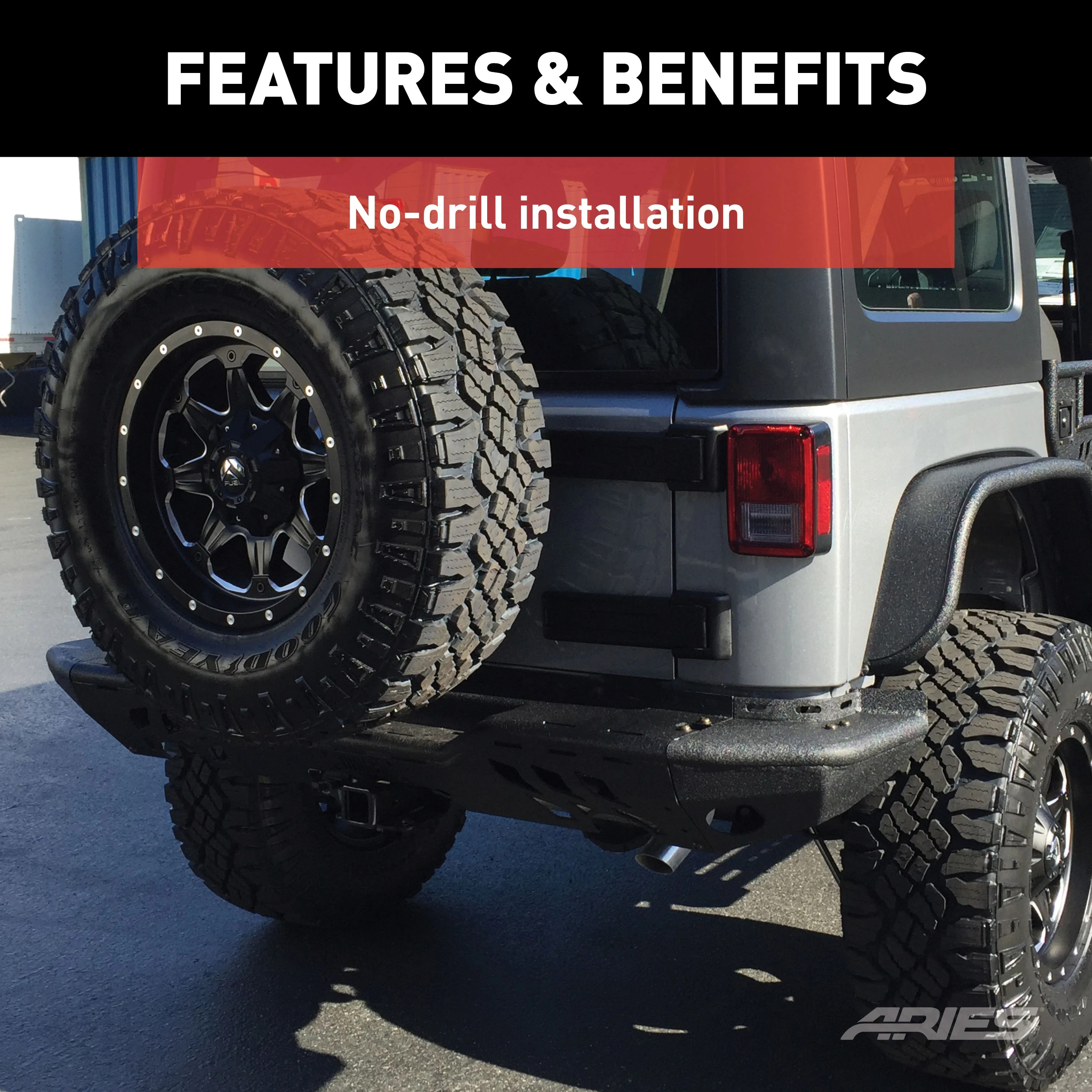 The ARIES TrailChaser Jeep bumper is unlike any other bumper for the Jeep Wrangler because it features a modular design. Each piece can be attached or swapped out as desired, giving you complete freedom of customization. This particular package includes the rear corners only. These two corners are intended to be mounted on the TrailChaser rear bumper center section (sold separately). They offer a bold finishing touch with an aggressive cutout and mounting points for additional lights. These side extensions are constructed from T6 aluminum alloy to be strong, lightweight and rust-free, and have a unique, textured black powder coat finish for maximum corrosion resistance. They are also available in powder-coated steel.