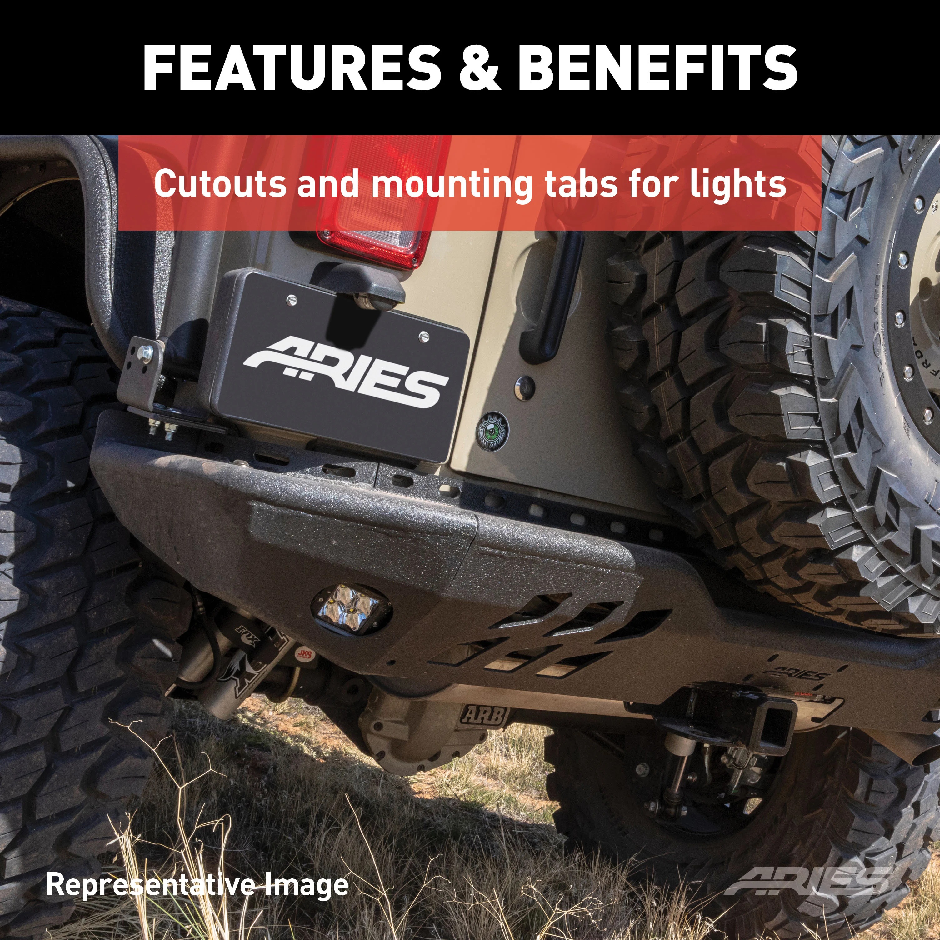 The ARIES TrailChaser Jeep bumper is unlike any other bumper for the Jeep Wrangler JL because it features a modular design. This particular bumper for the rear of the Jeep includes the center section and side extensions. It is constructed from T6 aluminum alloy to be strong, lightweight and rust-free, and has a unique, textured black powder coat finish for maximum corrosion resistance. It is also available in high-strength, powder-coated steel. All ARIES TrailChaser bumpers install using pre-existing factory mounting points for fast, easy installation with no drilling required.