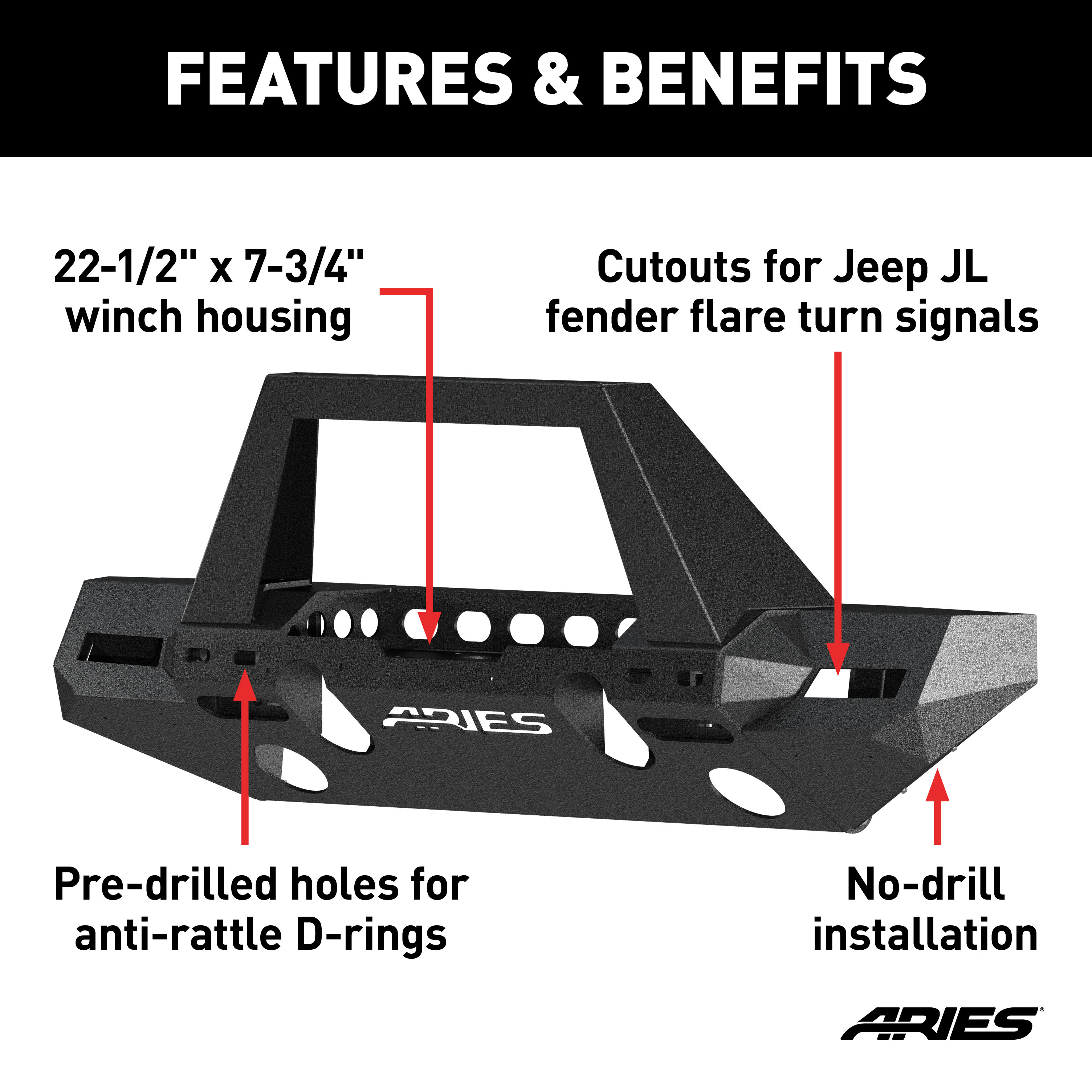The ARIES TrailChaser Jeep bumper is unlike any other bumper for the Jeep Wrangler JL and Gladiator because it features a modular design. With a variety of options to choose from, you can select the perfect configuration to match the style of your Jeep. All TrailChaser bumpers are also compatible with a variety of accessories, including LED lights, D-rings, tow hooks and a winch. This particular TrailChaser bumper comes with a center section, corner end caps and angular center brush guard. The corners feature unique cutouts to integrate the Jeep JL / JT fender flare turn signals when installing aftermarket fender flares. The bumper is constructed from T6 aluminum alloy to be strong, lightweight and rust-free, and has a unique, textured black powder coat finish for maximum corrosion resistance. It is also available in high-strength, powder-coated steel. The bumper center section features a standard 22-1/2" x 7-3/4" winch housing and is compatible with the ARIES winch adapter #2072100 for large r winches. It provides cutouts for lights and has pre-drilled holes for D-rings #2081300 and tow hooks #15600TW. The stinger-style angular brush guard of this bumper not only adds an aggressive look to your Jeep JL/ JT, but it also provides additional mounting points for an LED light bar or LED work lights. It features a full-length, slotted channel along the center cross-member, allowing lights to be mounted on the top or bottom. All ARIES TrailChaser bumpers install using pre-existing factory mounting points for fast, easy installation with no drilling required.