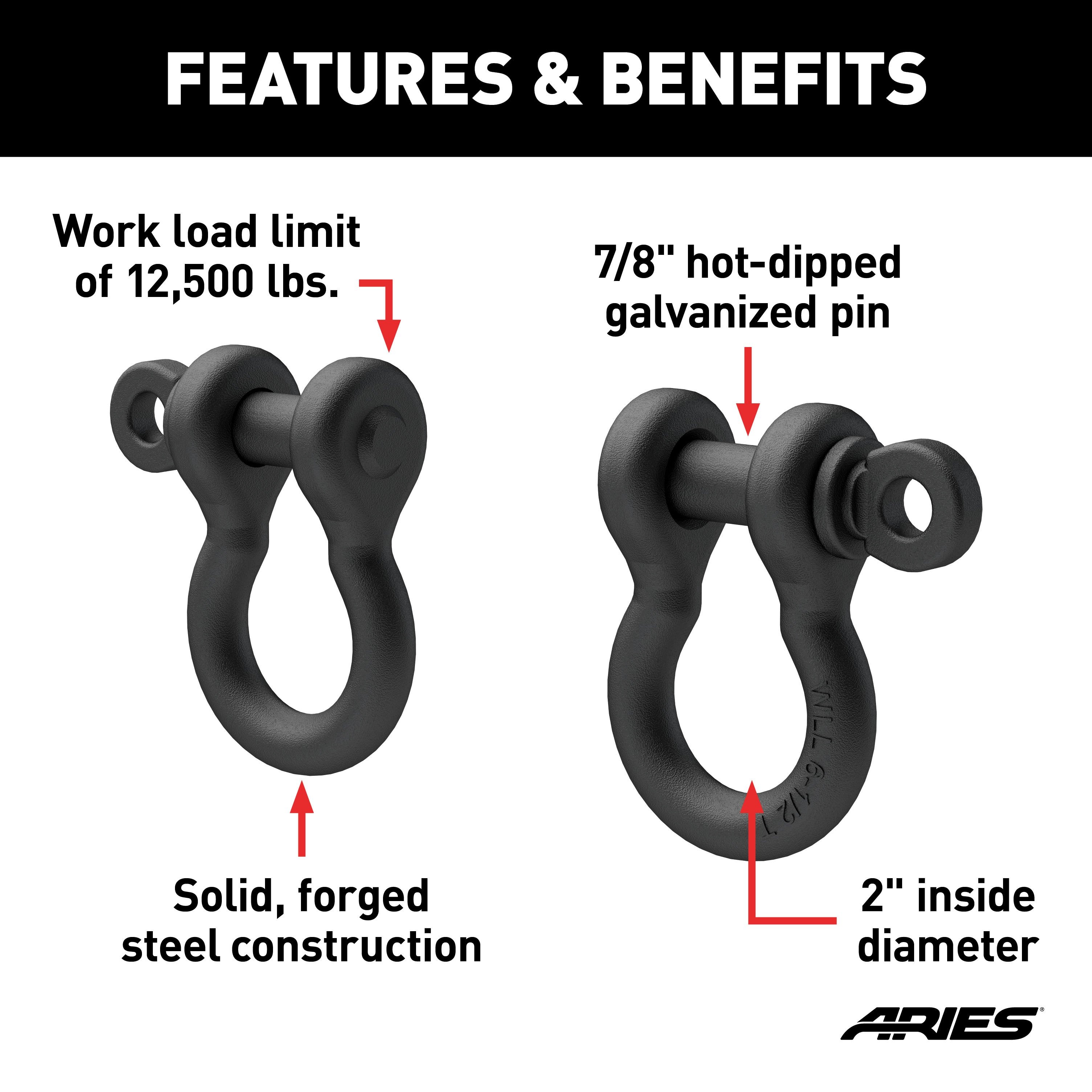 These ARIES bumper shackles have the design and strength to match the ARIES TrailCrusher bumper. They feature a 12,500-lb. work load limit, complementing the bumper's impressive rating, and a 7/8" diameter pin to perfectly fit the welded shackle mounts. The shackles are also designed to be universal and can be used on a variety of other accessories (weight rating limited to the capacity of the mounting structure). Built for the trail ahead, ARIES shackles feature forged steel construction for maximum strength. To easily outlast the elements, they are shielded in a durable carbide black powder coat finish to resist rust, scratches and other threats. The pin used to mount the shackle also receives a hot-dipped galvanized finish to protect it from harmful corrosion. Each shackle has a 2" inside diameter, and two shackles are included in each package.