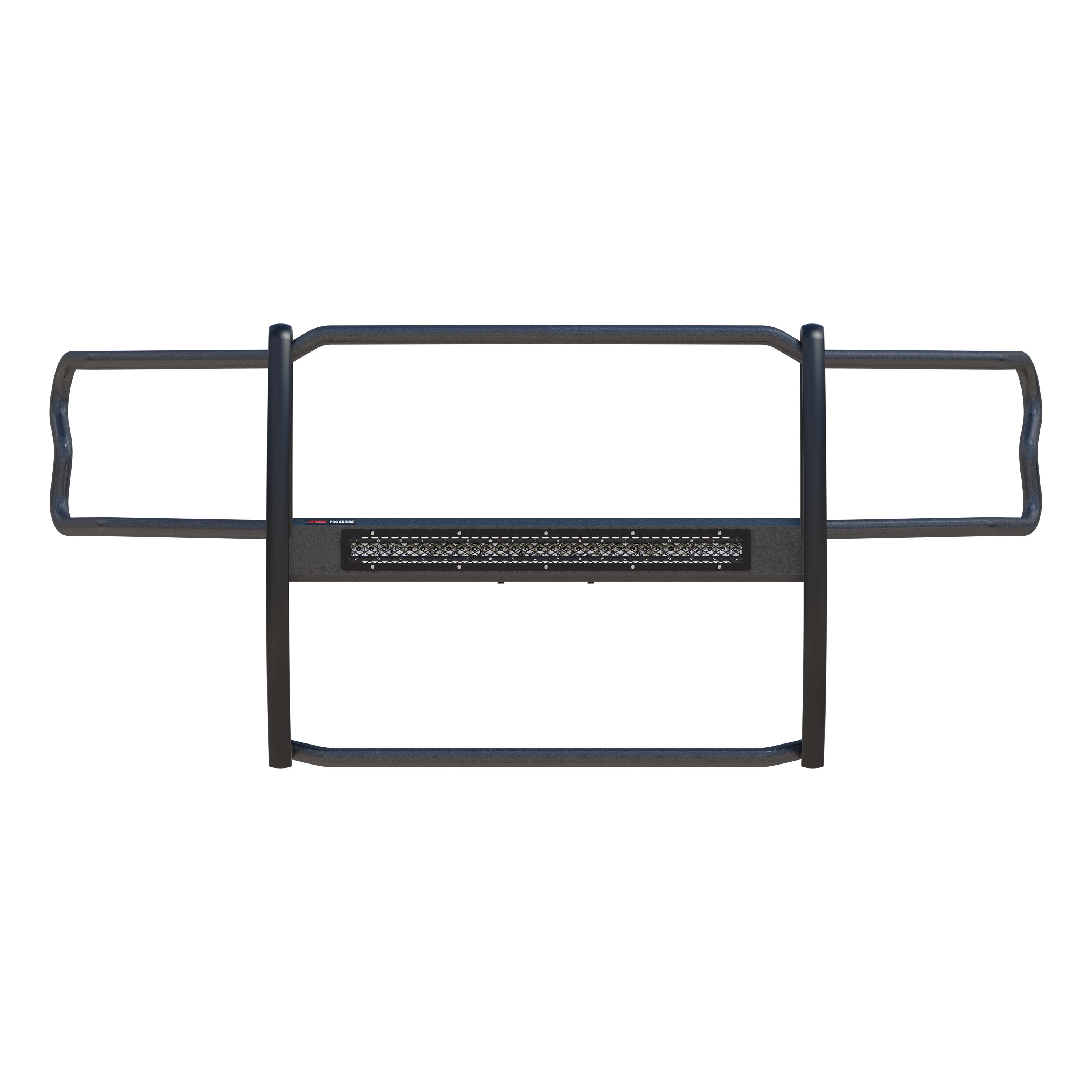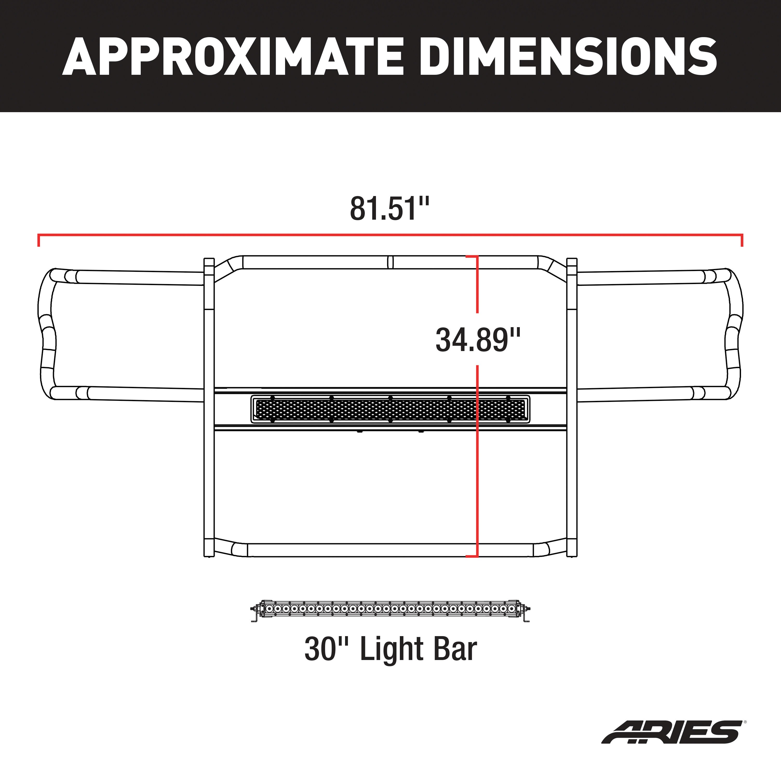 The ARIES Pro Series grille guard is unlike any other grille guard or brush guard on the road today because of its patented center crossbar. The ARIES Pro Series grille guard has a unique center crossbar that houses an LED light bar, allowing you to truly set your truck apart from all others. Rather than using a set of light clips or forcing you to drill holes into the frame, the aerodynamic crossbar of the Pro Series grille guard is the light bar housing itself. It uses a 30" slotted channel bracket to mount the included 30" LED light bar #1501264. The bracket can also accept other single-row light bars (some 30" light bars may not fit). The crossbar mount can also articulate, allowing you to position the light beam at any angle you prefer. Integrating the channel mount into the crossbar housing also keeps the light bar protected from the elements. To further stylize your truck, the Pro Series grille guard also comes with an interchangeable grille guard cover plate. Included with each grille guard is a black mesh cover plate that easily bolts on and provides added security for your aftermarket lights. The mesh cover plate can be swapped out with other cover plate options, including five different styles and two finishes. Solid construction should be an essential feature of any grille guard, and the Pro Series grille guard is more than qualified. It has a one-piece design of 1/4" thick welded plates and 1-1/2" mandrel-bent carbon steel tubing. We also finish each Pro Series grille guard in a highly durable, dual-layer E-coat and textured black powder coat, giving it resilience to rust and scratches. This unique finish also helps hide minor scratches and grime to maintain a clean look. ARIES Pro Series grille guards are made vehicle-specific for seamless integration with the factory bumper and an easy, no-drill installation. This grille guard fits select mode l years of the Ford F-150 (see application info to verify fitment).