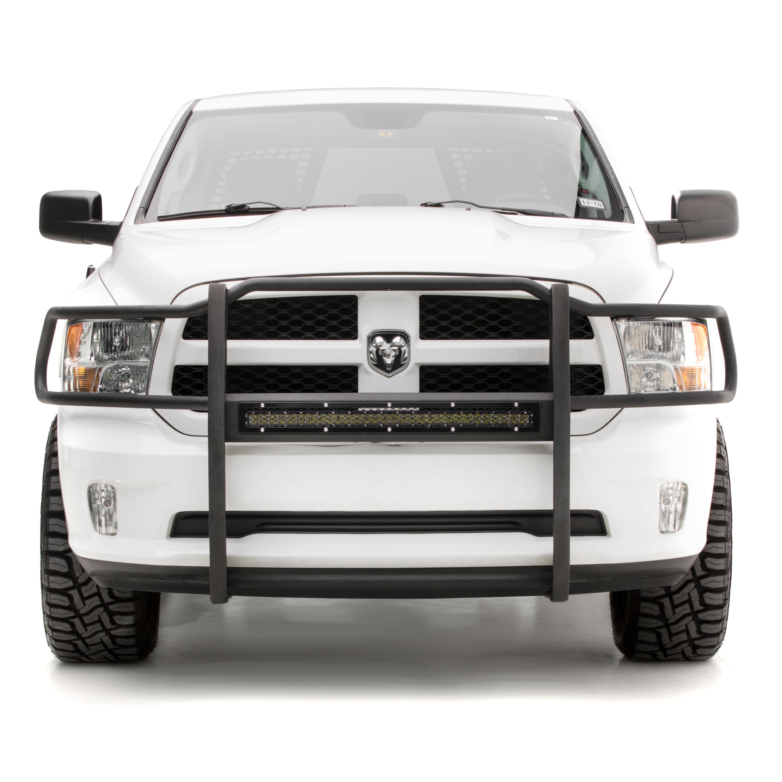 The ARIES Pro Series grille guard is unlike any other grille guard or brush guard on the road today because of its patented center crossbar. The ARIES Pro Series grille guard has a unique center crossbar that houses an LED light bar, allowing you to truly set your truck apart from all others. Rather than using a set of light clips or forcing you to drill holes into the frame, the aerodynamic crossbar of the Pro Series grille guard is the light bar housing itself. It uses a 30" slotted channel bracket to mount the included 30" LED light bar #1501264. The bracket can also accept other single-row light bars (some 30" light bars may not fit). The crossbar mount can also articulate, allowing you to position the light beam at any angle you prefer. Integrating the channel mount into the crossbar housing also keeps the light bar protected from the elements. To further stylize your truck, the Pro Series grille guard also comes with an interchangeable grille guard cover plate. Included with each grille guard is a black mesh cover plate that easily bolts on and provides added security for your aftermarket lights. The mesh cover plate can be swapped out with other cover plate options, including five different styles and two finishes. Solid construction should be an essential feature of any grille guard, and the Pro Series grille guard is more than qualified. It has a one-piece design of 1/4" thick welded plates and 1-1/2" mandrel-bent carbon steel tubing. We also finish each Pro Series grille guard in a highly durable, dual-layer E-coat and textured black powder coat, giving it resilience to rust and scratches. This unique finish also helps hide minor scratches and grime to maintain a clean look. ARIES Pro Series grille guards are made vehicle-specific for seamless integration with the factory bumper and an easy, no-drill installation. This grille guard fits select model years of the Ram 2500 and 3500 and Dodge Ram 2500 and 3500 (see application info to verify fitment).