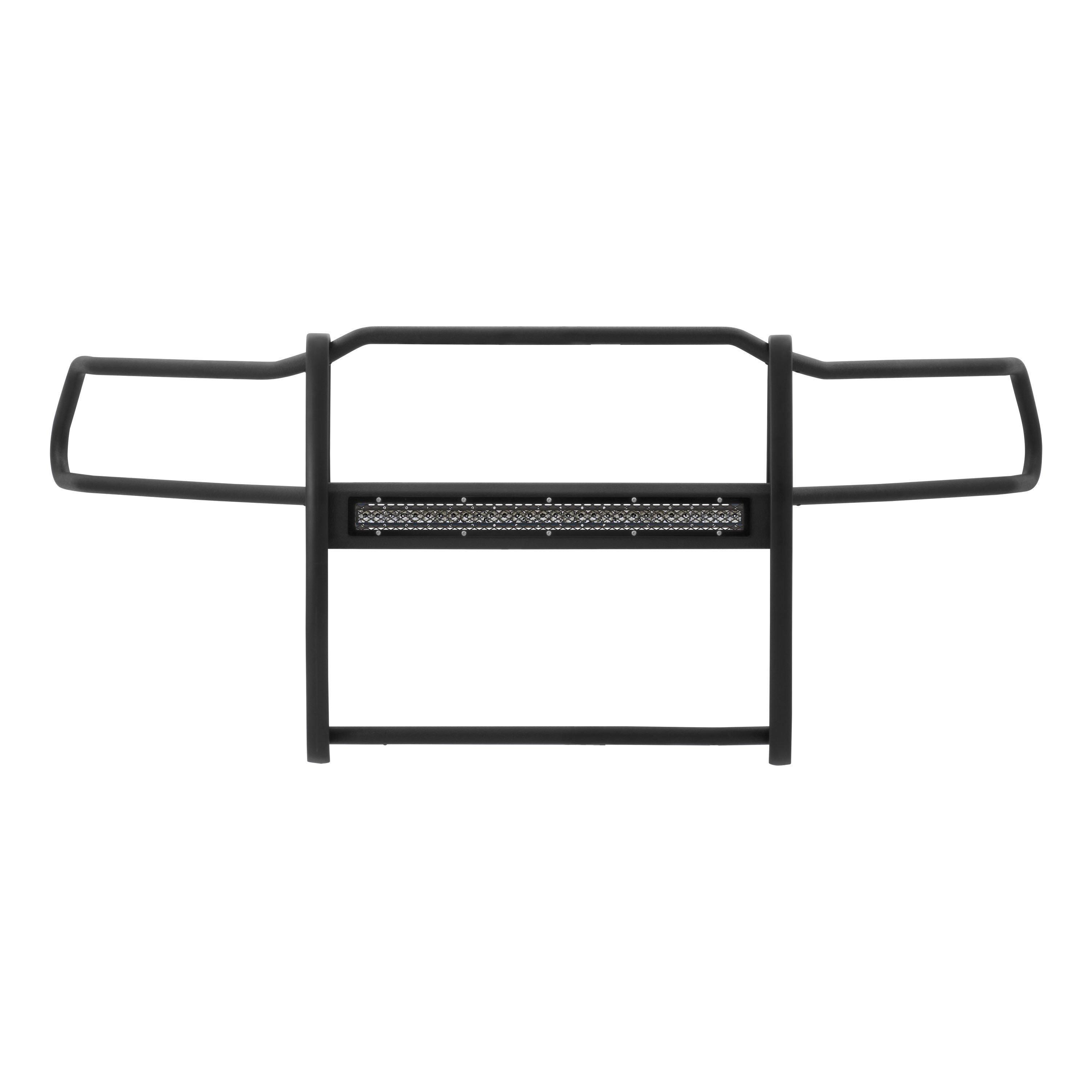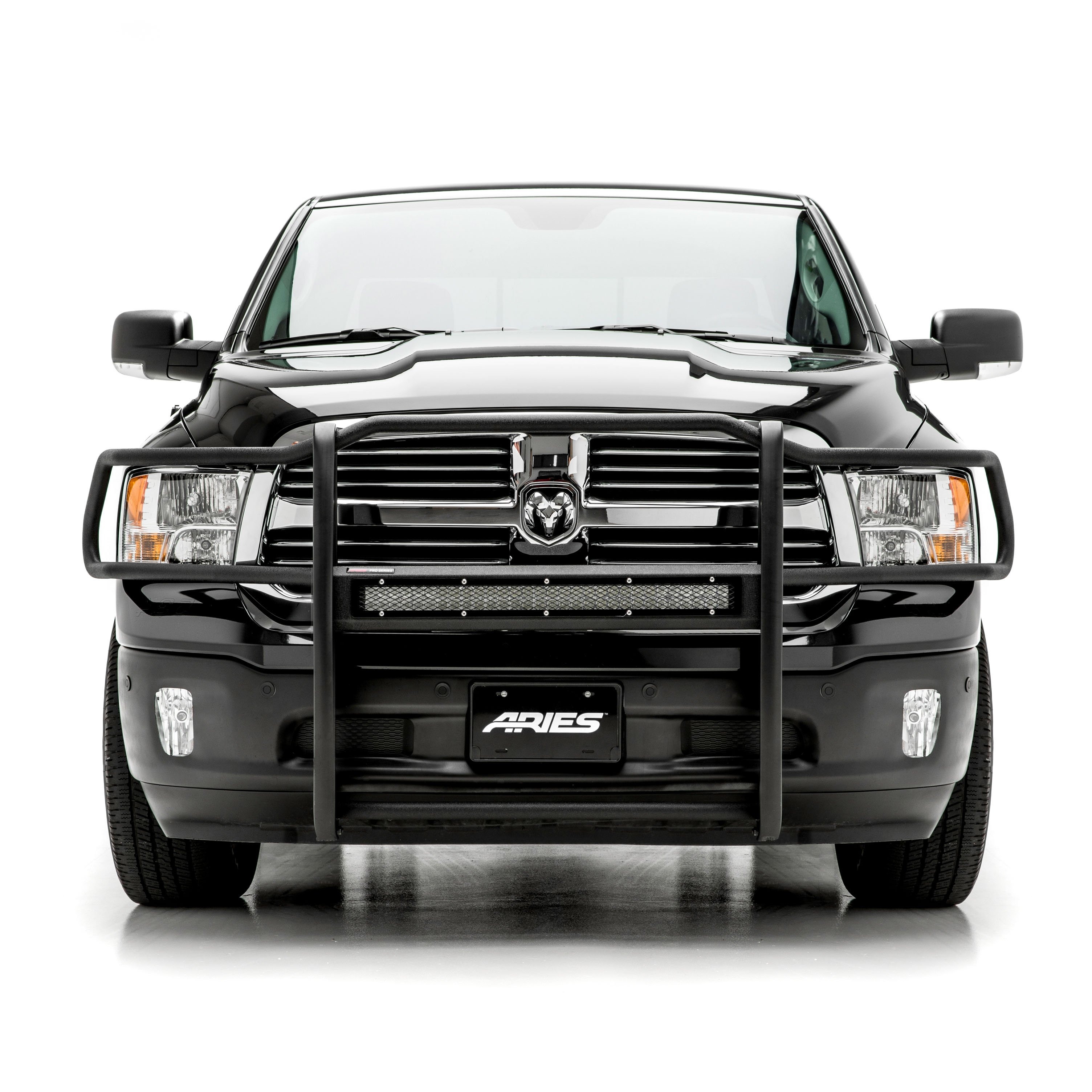 The ARIES Pro Series grille guard is unlike any other grille guard or brush guard on the road today because of its patented center crossbar. The ARIES Pro Series grille guard has a unique center crossbar that houses an LED light bar, allowing you to truly set your truck apart from all others. Rather than using a set of light clips or forcing you to drill holes into the frame, the aerodynamic crossbar of the Pro Series grille guard is the light bar housing itself. It uses a 30" slotted channel bracket to mount the included 30" LED light bar #1501264. The bracket can also accept other single-row light bars (some 30" light bars may not fit). The crossbar mount can also articulate, allowing you to position the light beam at any angle you prefer. Integrating the channel mount into the crossbar housing also keeps the light bar protected from the elements. To further stylize your truck, the Pro Series grille guard also comes with an interchangeable grille guard cover plate. Included with each grille guard is a black mesh cover plate that easily bolts on and provides added security for your aftermarket lights. The mesh cover plate can be swapped out with other cover plate options, including five different styles and two finishes. Solid construction should be an essential feature of any grille guard, and the Pro Series grille guard is more than qualified. It has a one-piece design of 1/4" thick welded plates and 1-1/2" mandrel-bent carbon steel tubing. We also finish each Pro Series grille guard in a highly durable, dual-layer E-coat and textured black powder coat, giving it resilience to rust and scratches. This unique finish also helps hide minor scratches and grime to maintain a clean look. ARIES Pro Series grille guards are made vehicle-specific for seamless integration with the factory bumper and an easy, no-drill installation. This grille guard fits select model years of the Ram 1500, Ram 1500 Classic and Dodge Ram 1500 (see application info to verify fitment).
