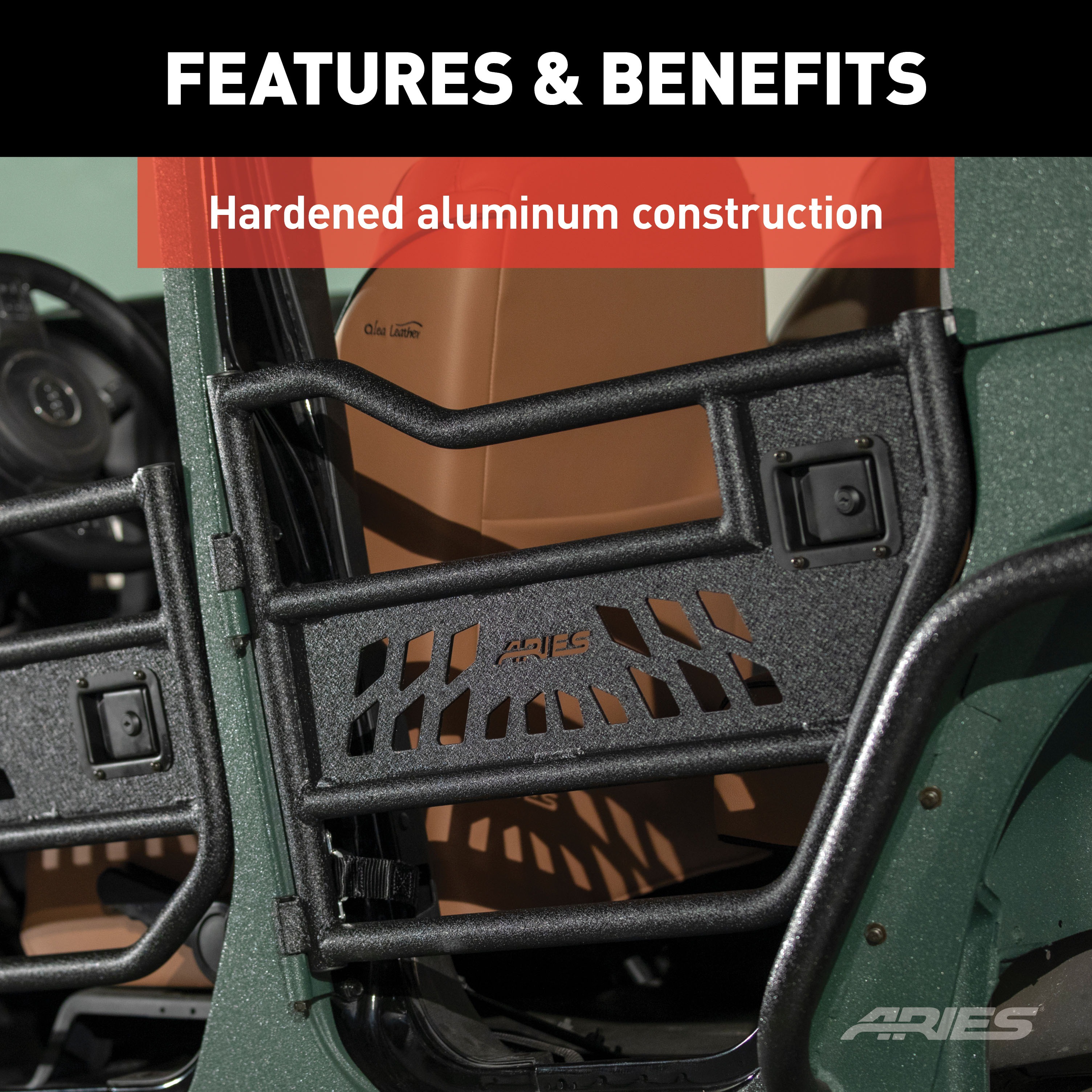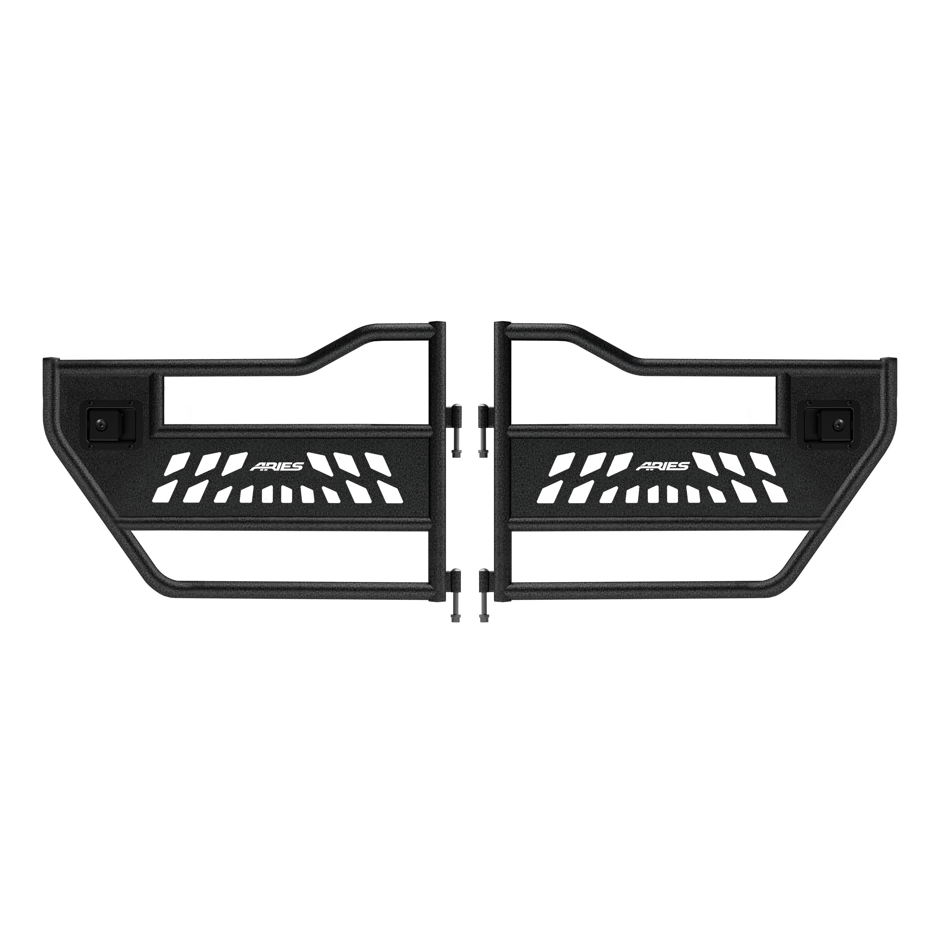 ARIES Jeep tube doors are more than a fancy aftermarket toy for your Wrangler JK; they are the key to turning your ride into the ultimate off-roading machine. Their open-concept design and aggressive cutout pattern makes them the perfect accessory for the desert baja and the rock climber alike. To keep your Jeep JK light on its feet over every sand dune, ARIES Jeep tube doors are built to be lightweight while still maintaining superior strength. They are constructed from T6 aluminum alloy, making them strong but far lighter than steel. We also use 100% TIG welds to ensure a solid build and a precise fit on your vehicle. Jeep tube doors are quick to install and easy to remove whenever necessary, using the factory hinge points. They are coated in a durable black powder coat for maximum corrosion resistance, and the unique textured finish of the powder coat helps hide minor scratches and grime from your off-road excursions (NOTE: Before purchasing ARIES Jeep tube doors, it is recommended that you check local and state laws. Some laws may prohibit the use of this product).