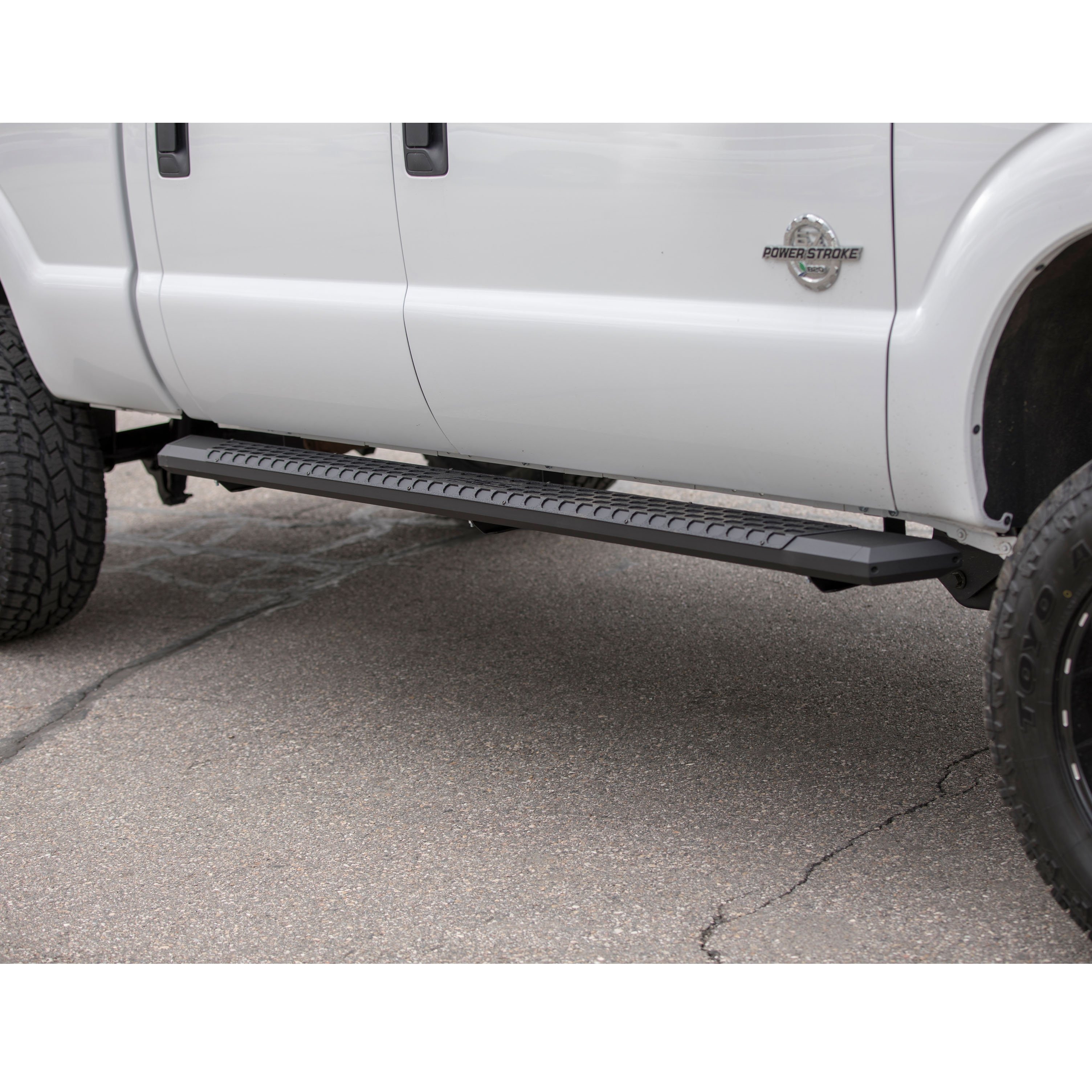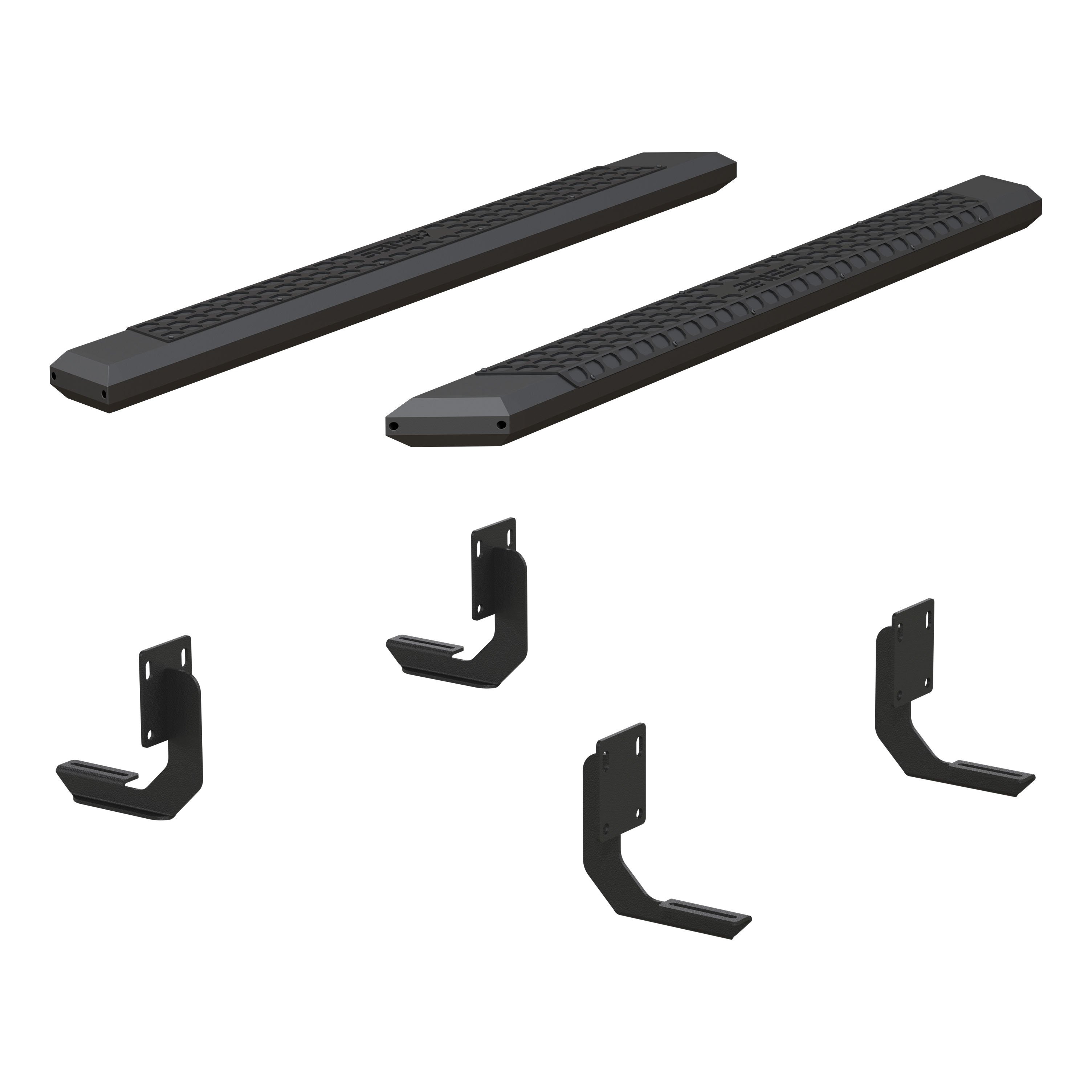 ARIES AdvantEDGE side bars do away with the common, rounded look of other side bars, nerf bars and running boards, featuring an angular, eight-sided tube profile and powder-coated all-aluminum construction. The angular edges provide a clear-cut, uncompromising accent for the look of today's trucks. Made from 5-1/2" wide, eight-sided, extruded aluminum tubing, AdvantEDGE running boards are strong, lightweight and impervious to rust, offering a solid step that is built to face the elements and outlast them. They also come with die-cast aluminum end caps and a stamped aluminum tread. The aluminum treads provide a long-lasting, non-skid stepping surface that will not crack or fade in the sun. ARIES AdvantEDGE side bars are also marked for their easy, custom-fit installation. They feature the ARIES VersaTrac mounting system with brackets that are made from powder-coated steel and built for specific vehicles. This particular set of custom running boards fits specific years of the Ford F250, F250 Super Duty and F350 Super Duty (see application info to verify compatibility). The high-strength steel brackets mount using pre-existing holes, and the aluminum running boards attach to the brackets with heavy-duty hardware. The VersaTrac mounting system makes installation simple and customizable, allowing the side bars to be swapped out at any time with other side steps or running boards that use the VersaTrac system. Setting yourself apart is simple with the ARIES AdvantEDGE series. In addition to these truck side steps, we also offer the AdvantEDGE bull bar and AdvantEDGE headache rack, featuring the same all-aluminum construction and eight-sided tube profile. For a fully customized look to match your pickup, AdvantEDGE side bars are available in two finish options, including carbide black powder coat and chrome powder coat.