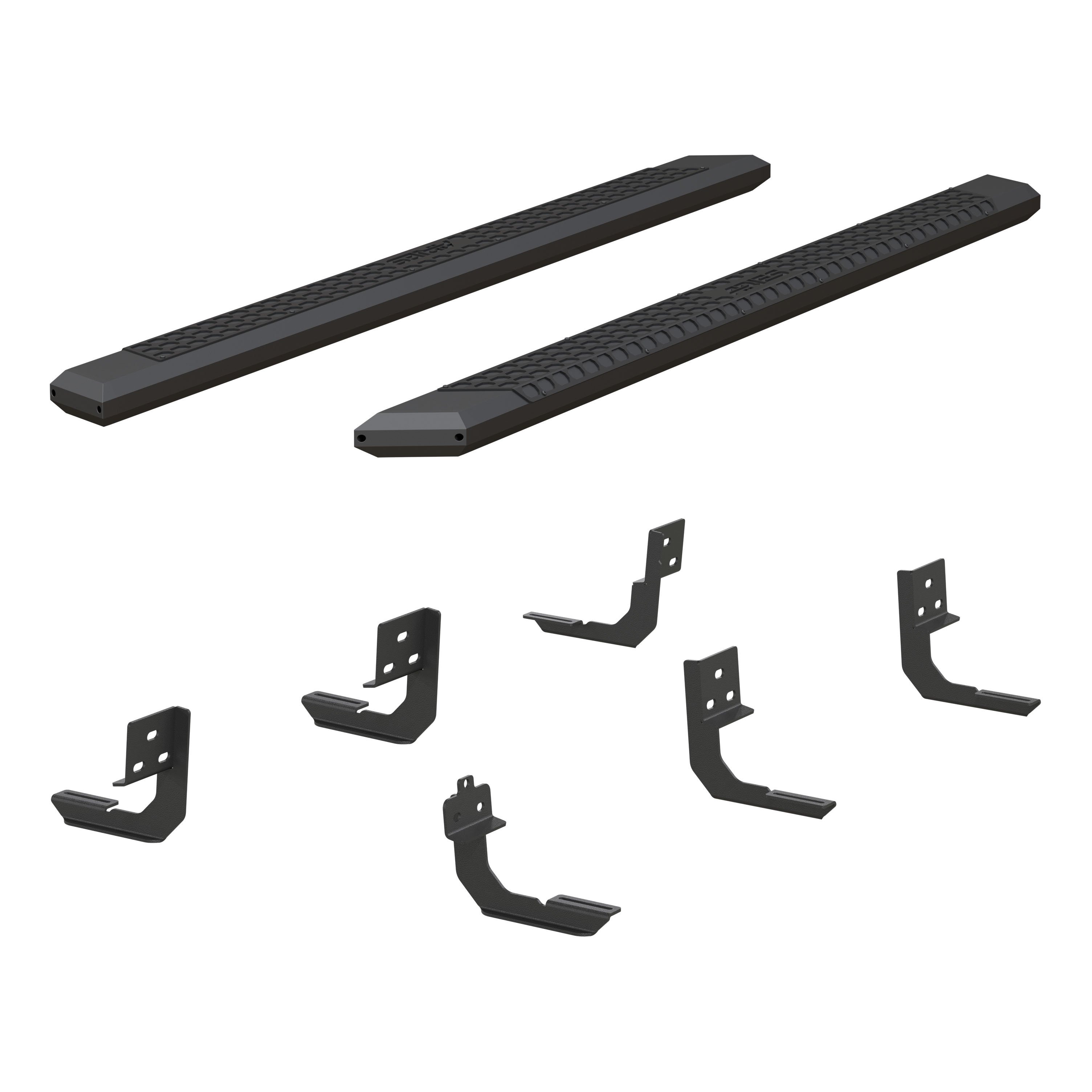 ARIES AdvantEDGE side bars do away with the common, rounded look of other side bars, nerf bars and running boards, featuring an angular, eight-sided tube profile and powder-coated all-aluminum construction. The angular edges provide a clear-cut, uncompromising accent for the look of today's trucks. Made from 5-1/2" wide, eight-sided, extruded aluminum tubing, AdvantEDGE running boards are strong, lightweight and impervious to rust, offering a solid step that is built to face the elements and outlast them. They also come with die-cast aluminum end caps and a stamped aluminum tread. The aluminum treads provide a long-lasting, non-skid stepping surface that will not crack or fade in the sun. ARIES AdvantEDGE side bars are also marked for their easy, custom-fit installation. They feature the ARIES VersaTrac mounting system with brackets that are made from powder-coated steel and built for specific vehicles. This particular set of custom running boards fits specific years of the Ram 2500 and 3500 (see application info to verify compatibility). The high-strength steel brackets mount using pre-existing holes, and the aluminum running boards attach to the brackets with heavy-duty hardware. The VersaTrac mounting system makes installation simple and customizable, allowing the side bars to be swapped out at any time with other side steps or running boards that use the VersaTrac system. Setting yourself apart is simple with the ARIES AdvantEDGE series. In addition to these truck side steps, we also offer the AdvantEDGE bull bar and AdvantEDGE headache rack, featuring the same all-aluminum construction and eight-sided tube profile. For a fully customized look to match your pickup, AdvantEDGE side bars are available in two finish options, including carbide black powder coat and chrome powder coat.