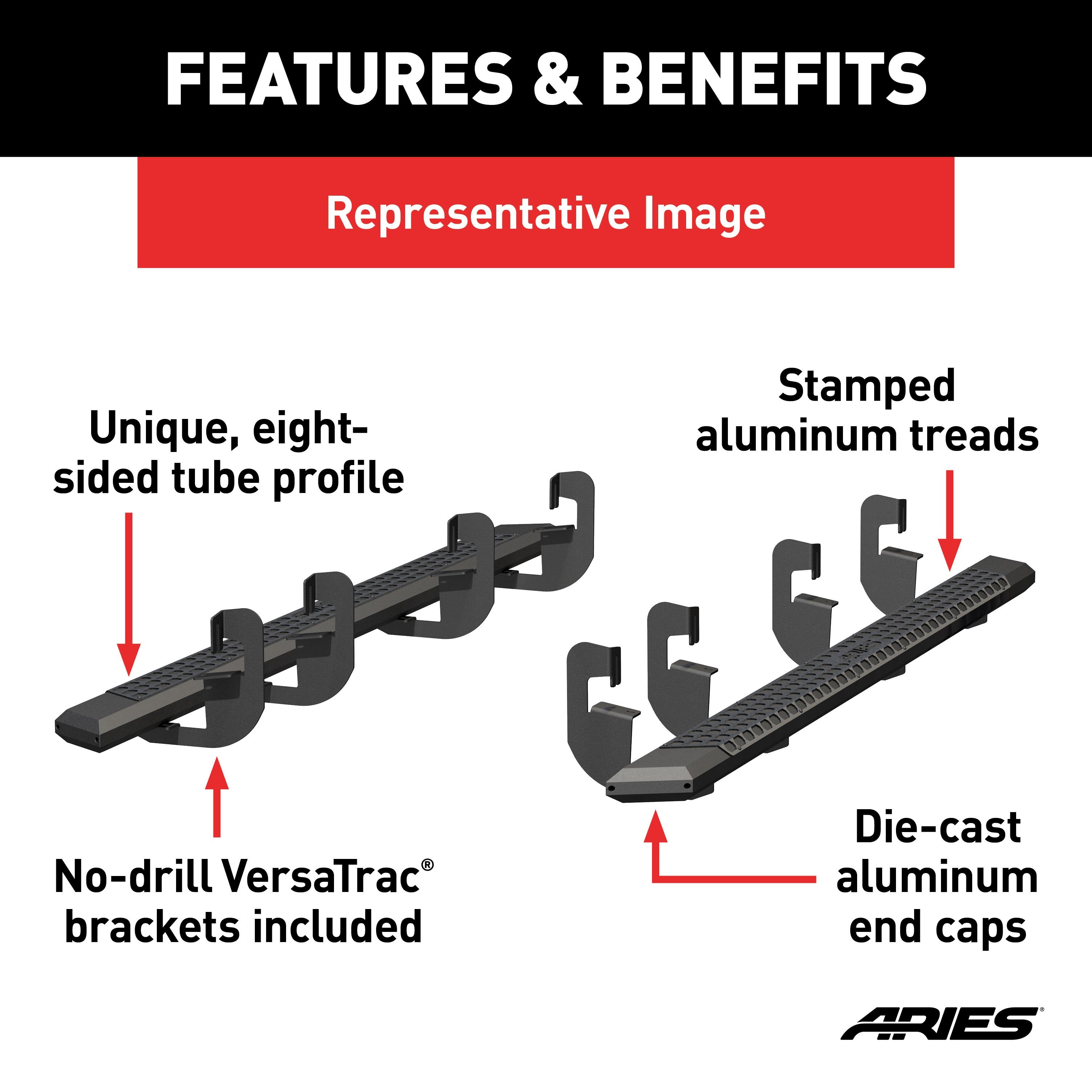 ARIES AdvantEDGE side bars do away with the common, rounded look of other side bars, nerf bars and running boards, featuring an angular, eight-sided tube profile and powder-coated all-aluminum construction. The angular edges provide a clear-cut, uncompromising accent for the look of today's trucks. Made from 5-1/2" wide, eight-sided, ex truded aluminum tubing, AdvantEDGE running boards are strong, lightweight and impervious to rust, offering a solid step that is built to face the elements and outlast them. They also come with die-cast aluminum end caps and a stamped aluminum tread. The aluminum treads provide a long-lasting, non-skid stepping surface that will not crack or fade in the sun. ARIES AdvantEDGE side bars are also marked for their easy, custom-fit installation. They feature the ARIES VersaTrac mounting system with brackets that are made from powder-coated steel and built for specific vehicles. This particular set of custom running boards fits specific years of the Chevy Silverado, Avalanche, Tahoe or Suburban and GMC Sierra or Yukon (see application info to verify compatibility). The high-strength steel brackets mount using pre-existing holes, and the aluminum running boards attach to the brackets with heavy-duty hardware. The VersaTrac mounting system makes installation simple and customizable, allowing the side bars to be swapped out at any time with other side steps or running boards that use the VersaTrac system. Setting yourself apart is simple with the ARIES AdvantEDGE series. In addition to these truck side steps, we also offer the AdvantEDGE bull bar and AdvantEDGE headache rack, featuring the same all-aluminum construction and eight-sided tube profile. For a fully customized look to match your pickup, AdvantEDGE side bars are available in two finish options, including carbide black powder coat and chrome powder coat.