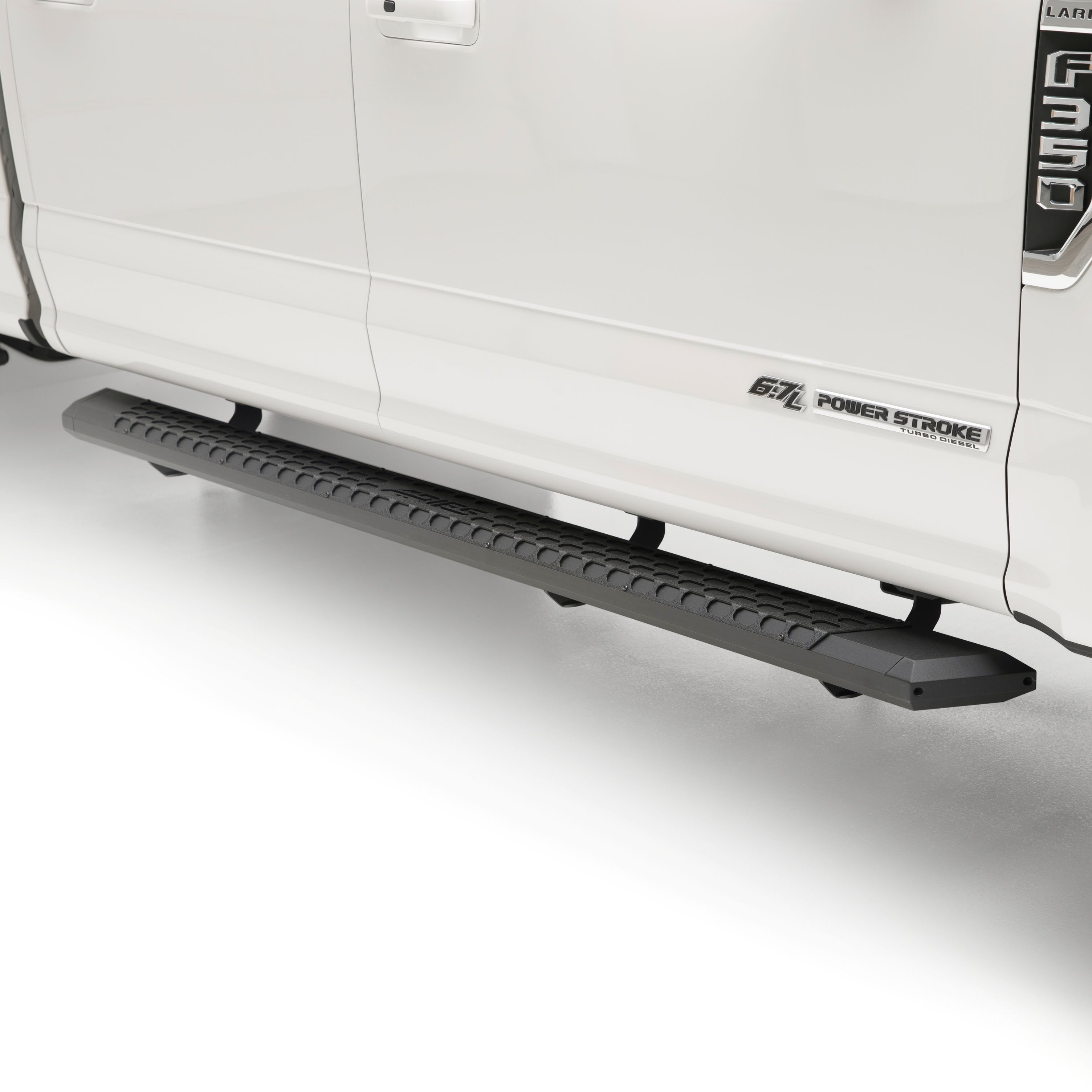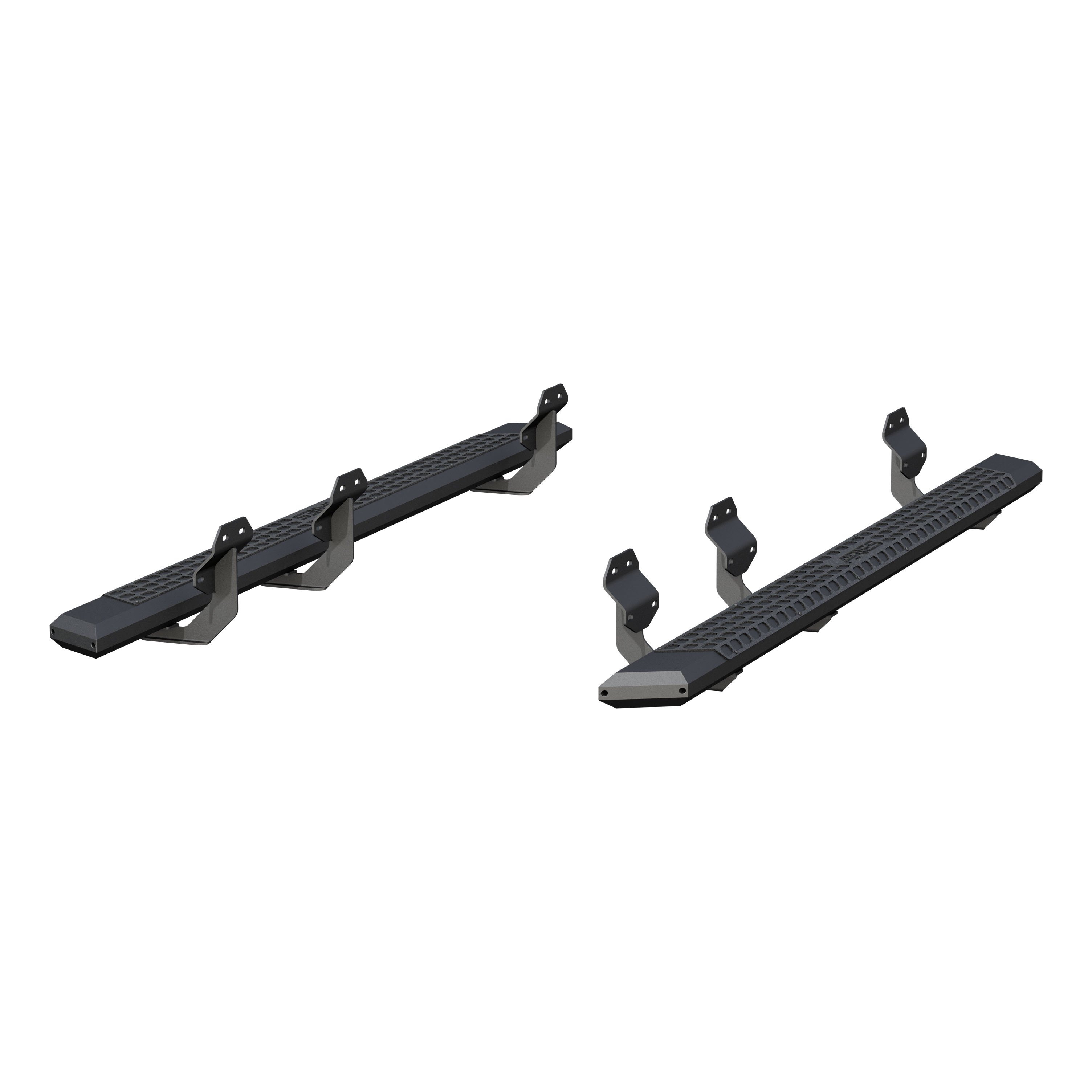 ARIES AdvantEDGE side bars do away with the common, rounded look of other side bars, nerf bars and running boards, featuring an angular, eight-sided tube profile and powder-coated all-aluminum construction. The angular edges provide a clear-cut, uncompromising accent for the look of today's trucks. Made from 5-1/2" wide, eight-sided, extruded aluminum tubing, AdvantEDGE running boards are strong, lightweight and impervious to rust, offering a solid step that is built to face the elements and outlast them. They also come with die-cast aluminum end caps and a stamped aluminum tread. The aluminum treads provide a long-lasting, non-skid stepping surface that will not crack or fade in the sun. ARIES AdvantEDGE side bars are also marked for their easy, custom-fit installation. They feature the ARIES VersaTrac mounting system with brackets that are made from powder-coated steel and built for specific vehicles. This particular set of custom running boards fits specific years of the Ford F-150, F-150 Lightning, F-250 Super Duty, F-350 Super Duty, F-450 Super Duty and F-550 Super Duty crew cab (see application info to verify compatibility). The high-strength steel brackets mount using pre-existing holes, a nd the aluminum running boards attach to the brackets with heavy-duty hardware. The VersaTrac mounting system makes installation simple and customizable, allowing the side bars to be swapped out at any time with other side steps or running boards that use the VersaTrac system. Setting yourself apart is simple with the ARIES AdvantEDGE series. In addition to these truck side steps, we also offer the AdvantEDGE bull bar and AdvantEDGE headache rack, featuring the same all-aluminum construction and eight-sided tube profile. For a fully customized look to match your pickup, AdvantEDGE side bars are available in two finish options, including carbide black powder coat and chrome powder coat.