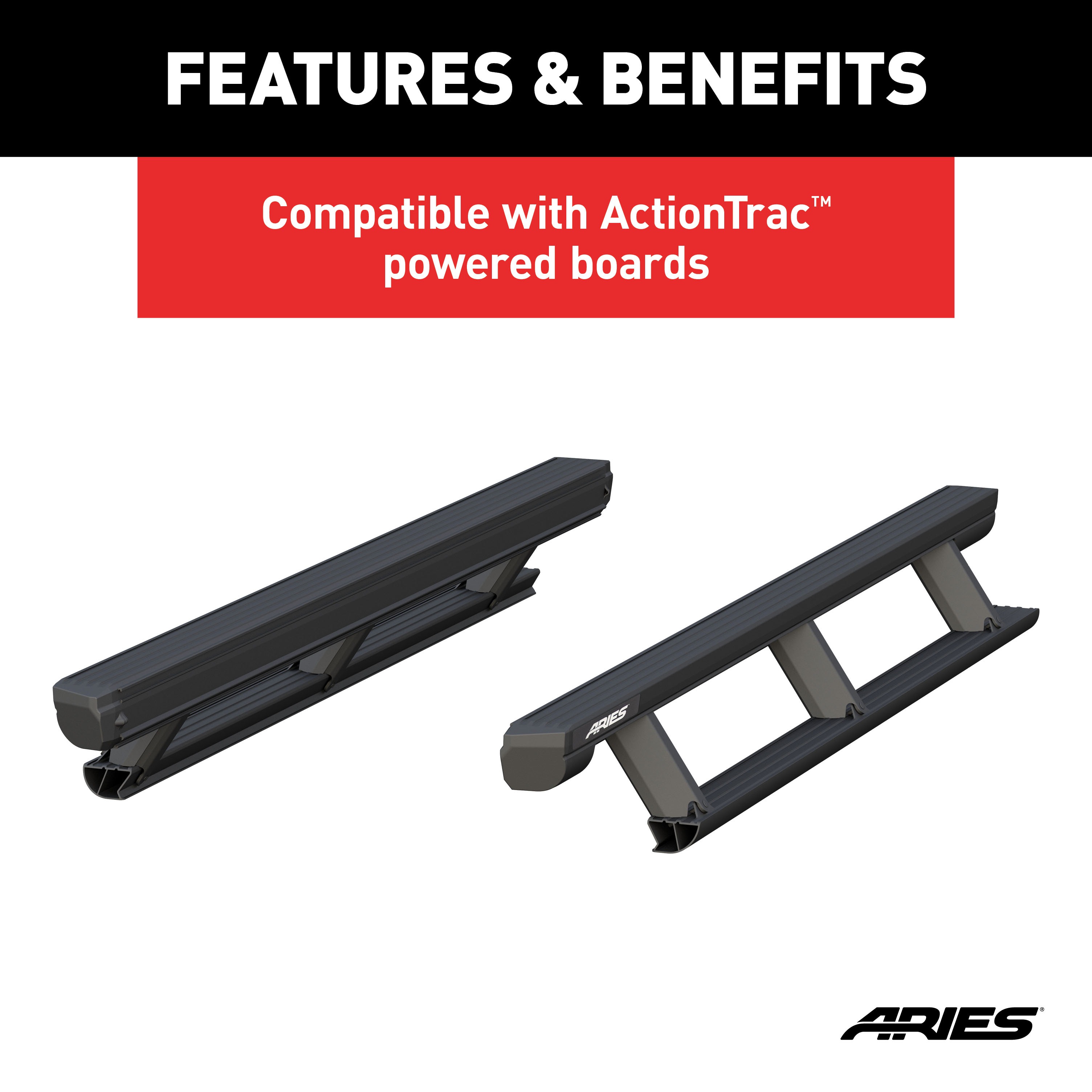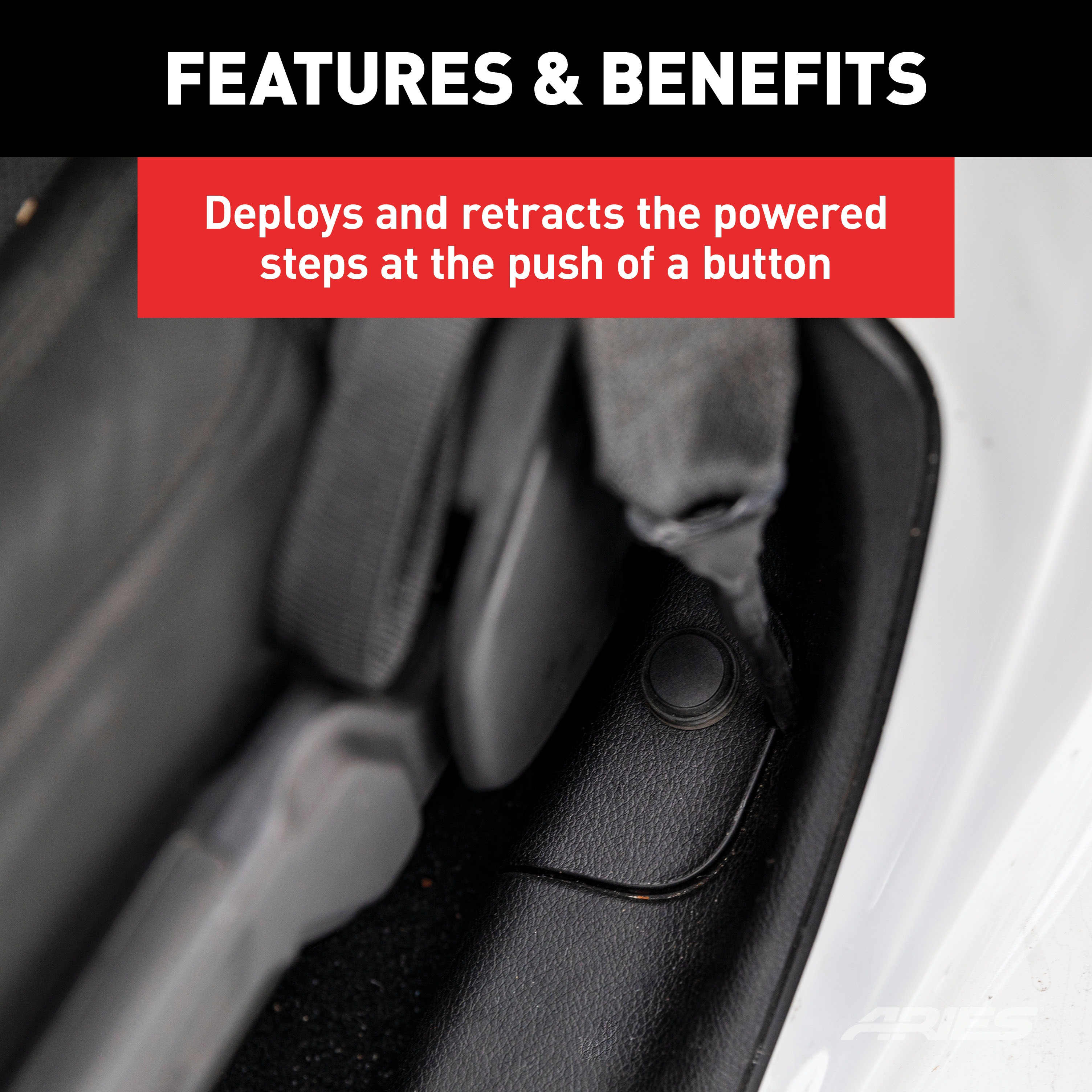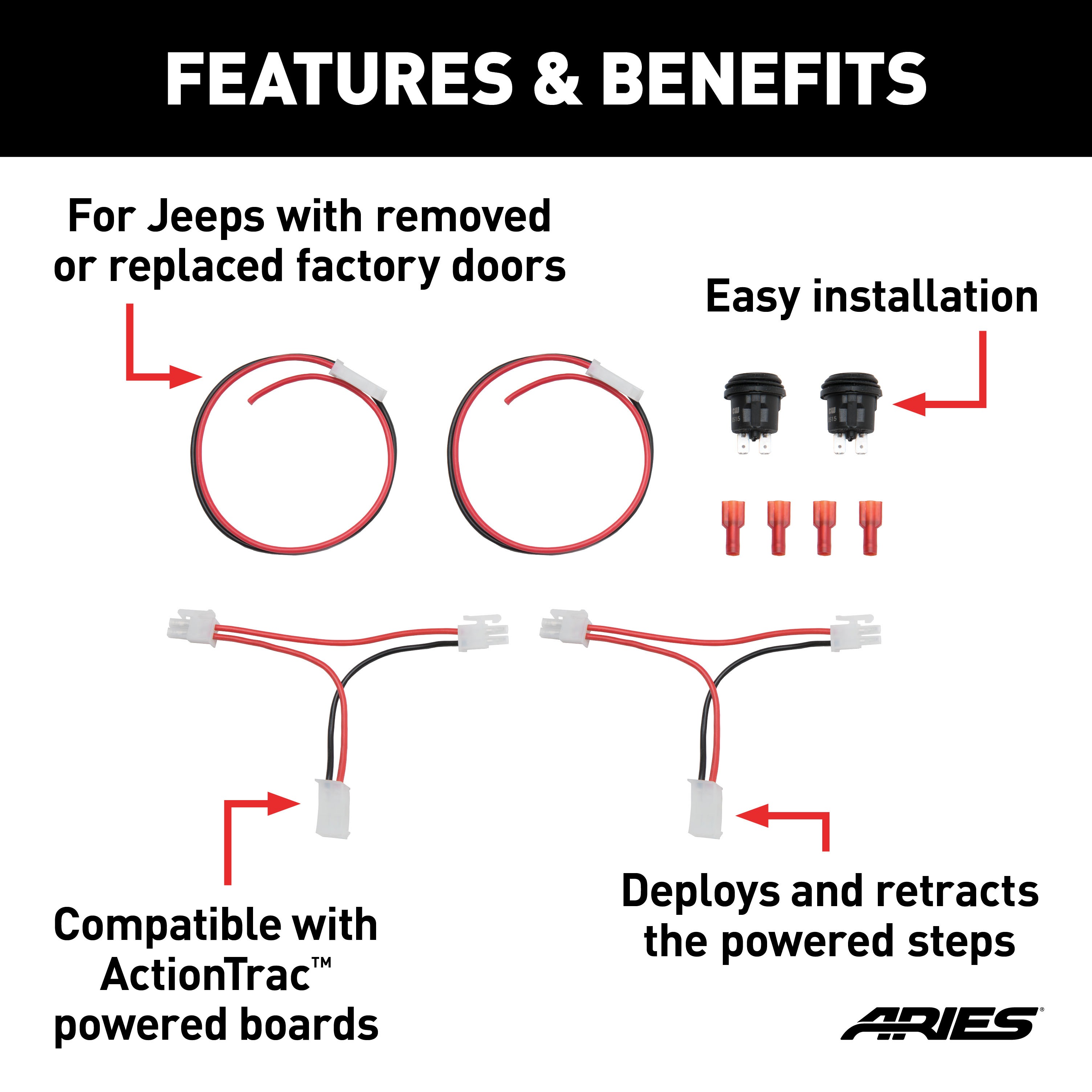 ARIES ActionTrac powered running boards are an innovative step in truck accessories. These electric side steps are unique from other power side steps because they are actually two steps in one. This step-within-a-step design -- combined with a no-drill installation, smart-sensor operation and powder-coated aluminum construction -- truly makes these retractable running boards an asset for the offroad truck or Jeep Wrangler, particularly as lifted truck steps. This door delete kit is intended to be mounted on a Jeep Wrangler with the factory doors removed or replaced with aftermarket doors. It includes two switches that allow the powered steps to be deployed and retracted at the push of a button. NOTE: Use of these switches requires manual operation of the running boards. Failure to retract the boards when operating the vehicle could result in damage to the boards or vehicle.
