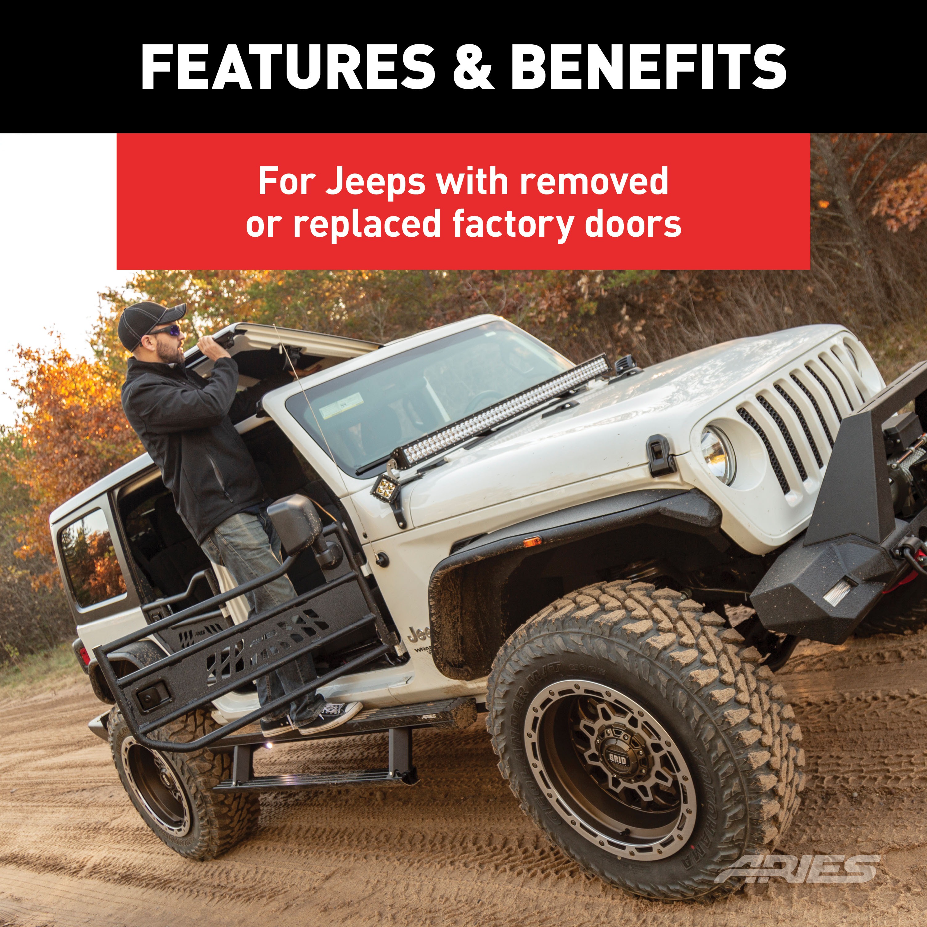 - For Jeep applications with the factory doors removed or replaced with tube doors.