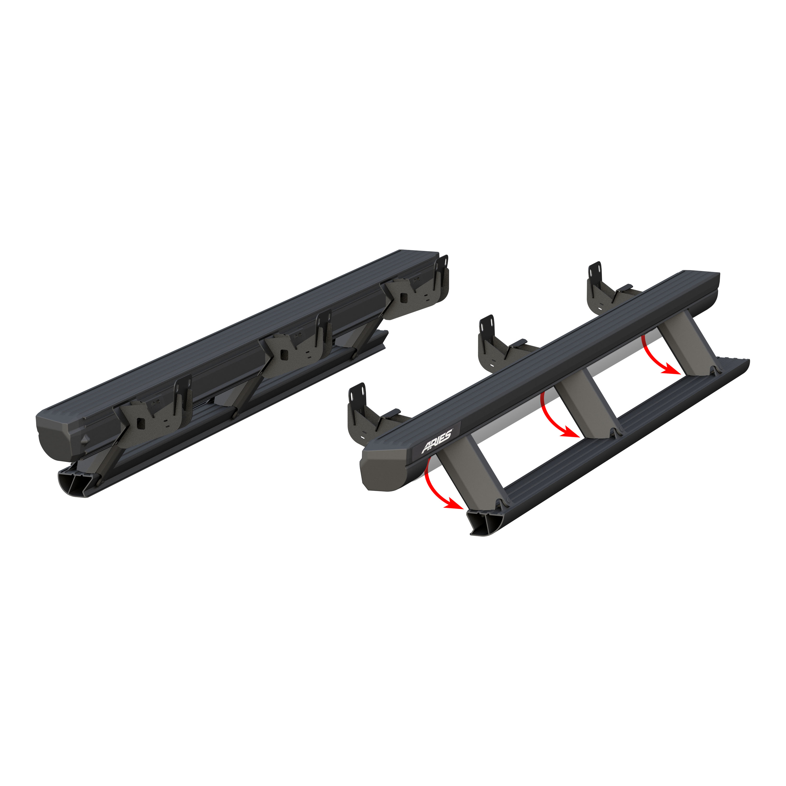 ARIES ActionTrac powered running boards are unique from other power side steps because they are actually two steps in one. This patented step-within-a-step design -- combined with a no-drill bracket installation on most models, control module operation and powder-coated aluminum construction -- truly makes these retractable running boards an asset for the offroad truck or Jeep, particularly as lifted truck steps. ActionTrac powered running boards have one 4" wide step on top of the main housing and one 3" wide that automatically deploys as needed. When the door opens, the control module deploys the power step 8" below the main step, 15" below the doorsill, depending on the model. This two-step design offers enhanced safety and easier vehicle entry and exit, especially on large, lifted vehicles. It's also very helpful for families with young children and for elderly passengers. The boards contour to the vehicle and offer extra protection for the rocker panels from small road debris. For additional safety, the module is able to detect any obstructions during operation to avoid pinch hazards. LED lights are also built into the housing to illuminate the steps when deployed. ARIES ActionTrac powered running boards are made for vehicle-specific installation for a custom fit. They use pre-existing factory holes for the brackets to eliminate drilling on most models. They also do not require any splicing into factory wiring. These particular running boards fit specific years of the Ram and Dodge Ram 1500, 2500 or 3500 (see application info to verify fitment). Each set is constructed from powder-coated aluminum to be strong, lightweight and non-corrosive. The quiet, maintenance-free rotary motor is shielded within the main housing, along with the power step pivot points and all electrical components, protecting them from the harsh elements. NOTE: Boards, brackets and wiring are included.