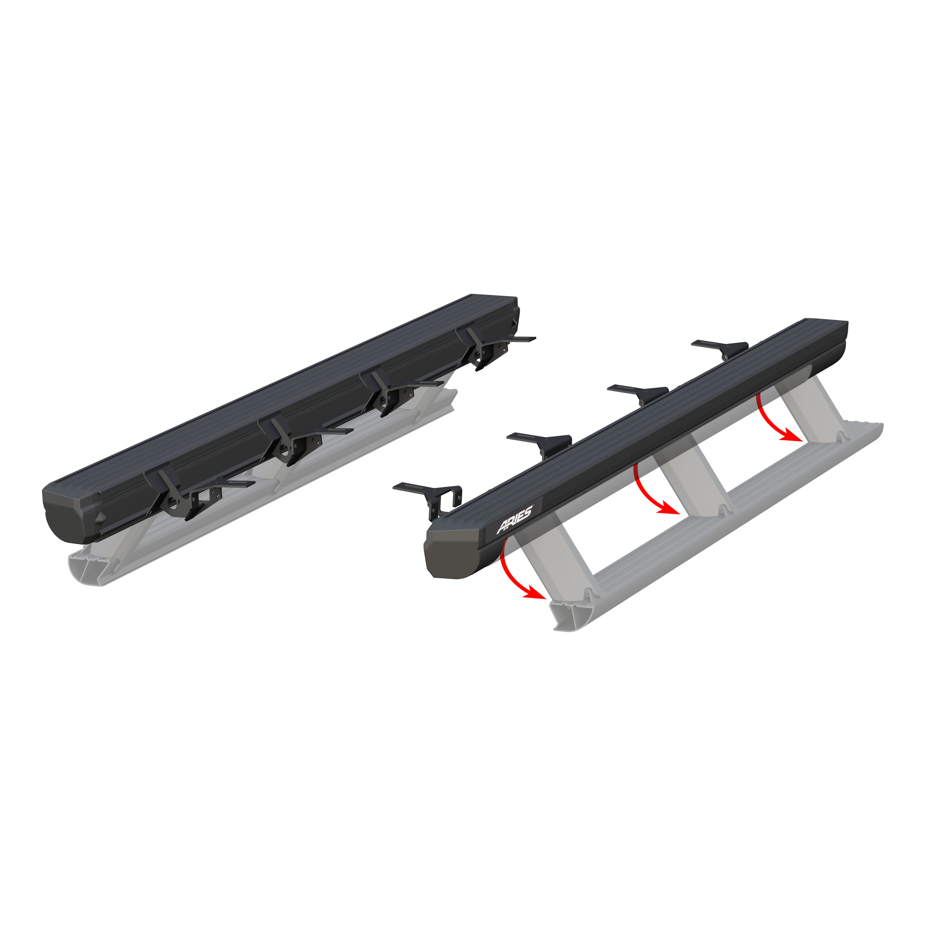 ARIES ActionTrac powered running boards are unique from other power side steps because they are actually two steps in one. This patented step-within-a-step design -- combined with a no-drill bracket installation, control module operation and powder-coated aluminum construction -- truly makes these retractable running boards an asset for the offroad truck or Jeep, particularly as lifted truck steps. ActionTrac powered running boards have one 4" wide step on top of the main housing and one 3" wide that automatically deploys as needed. When the door opens, the control module deploys the power step 8" below the main step, 15" below the doorsill, depending on the model. This two-step design offers enhanced safety and easier vehicle entry and exit, especially on large, lifted vehicles. It's also very helpful for families with young children and for elderly passengers. The boards contour to the vehicle and offer extra protection for the rocker panels from small road debris. For additional safety, the module is able to detect any obstructions during operation to avoid pinch hazards. LED lights are also built into the housing to illuminate the steps when deployed. ARIES ActionTrac powered running boards are made for vehicle-specific installation for a cu stom fit. They use pre-existing factory holes for the brackets to eliminate drilling. They also do not require any splicing into factory wiring. These particular running boards fit specific years of the Jeep Gladiator (see application info to verify fitment). Each set is constructed from powder-coated aluminum to be strong, lightweight and non-corrosive. The quiet, maintenance-free rotary motor is shielded within the main housing, along with the power step pivot points and all electrical components, protecting them from the harsh elements. NOTE: Boards, brackets and wiring are included.