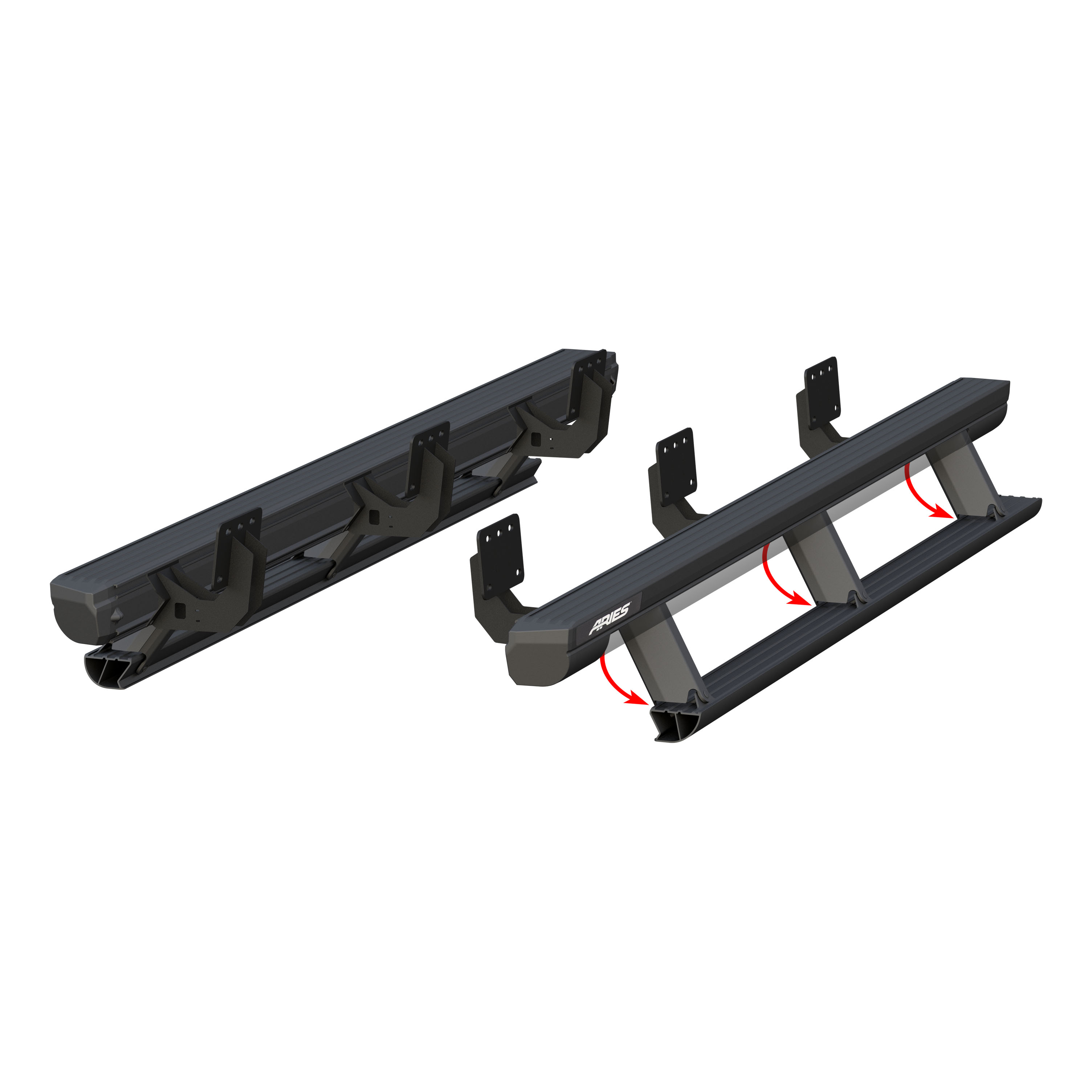 ARIES ActionTrac powered running boards are unique from other power side steps because they are actually two steps in one. This patented step-within-a-step technology -- combined with a no-drill bracket installation, control module operation and powder-coated aluminum construction -- truly makes these retractable running boards an asset for the offroad truck or Jeep, particularly as lifted truck steps. ActionTrac motorized running boards have one 4" wide step on top of the main housing and one 3" wide that automatically deploys as needed. When the door opens, the control module deploys the power step 8" below the main step, 15" below the doorsill, depending on the model. This two-step design offers enhanced safety and easier vehicle entry and exit, especially on large, lifted vehicles. It's also very helpful for families with young children and for elderly passengers. The boards contour to the vehicle and offer extra protection for the rocker panels from small road debris. For additional safety, the module is able to detect any obstructions during operation to avoid pinch hazards. LED lights are also built into the housing to illuminate the steps when deployed. ARIES ActionTrac automatic running boards are made for vehicle-specific installation for a custom fit. They use pre-existing factory holes for the brackets to eliminate drilling. They also do not require any splicing into original factory wiring. These particular automotive running boards fit specific years of the Ram 1500 (see application info to verify fitment). Each set is constructed from powder-coated aluminum to be strong, lightweight and non-corrosive. The quiet, maintenance-free rotary motor is shielded within the main housing, along with the powerboard pivot points and all electrical components, protecting them from the harsh elements. NOTE: Boards, brackets and wiring are included.