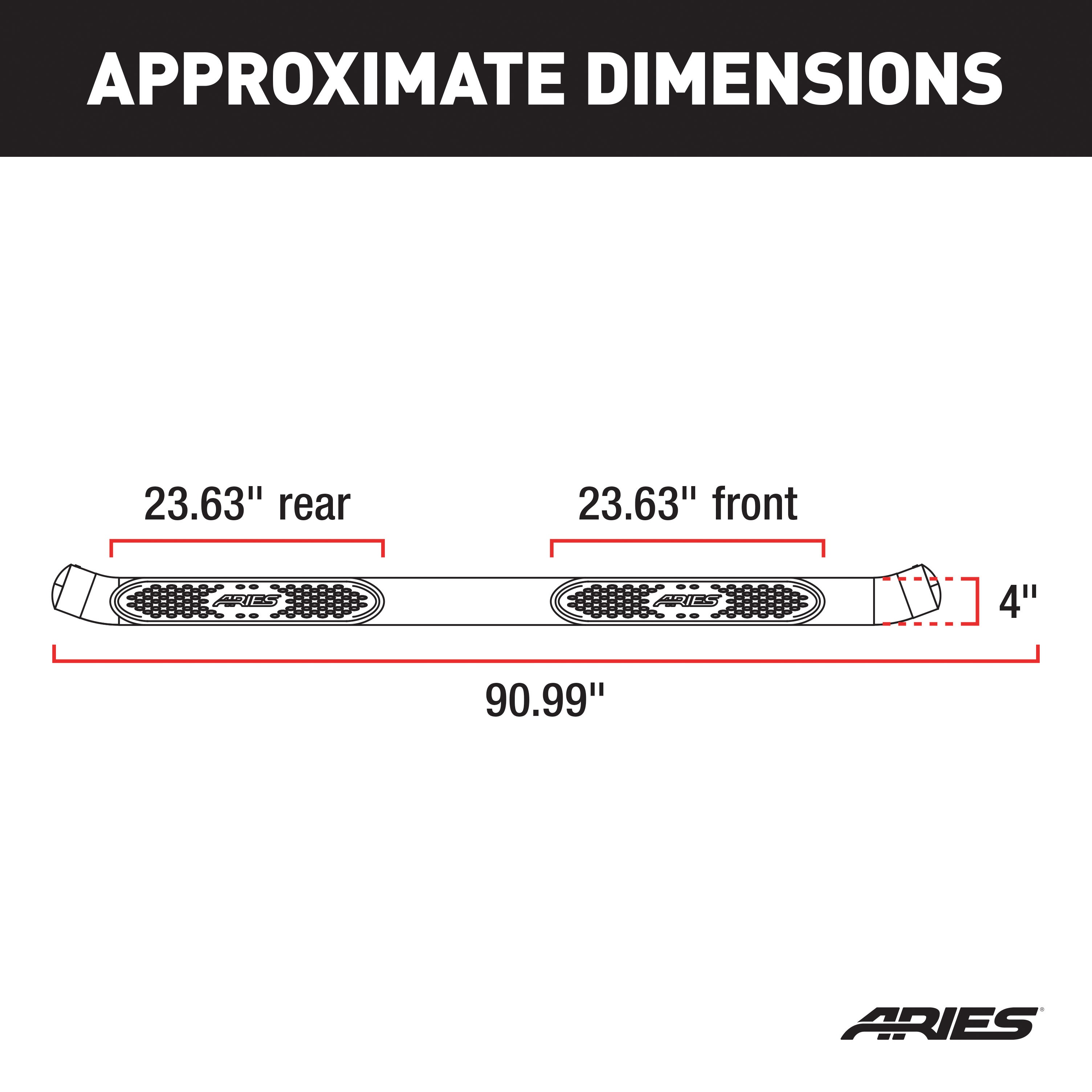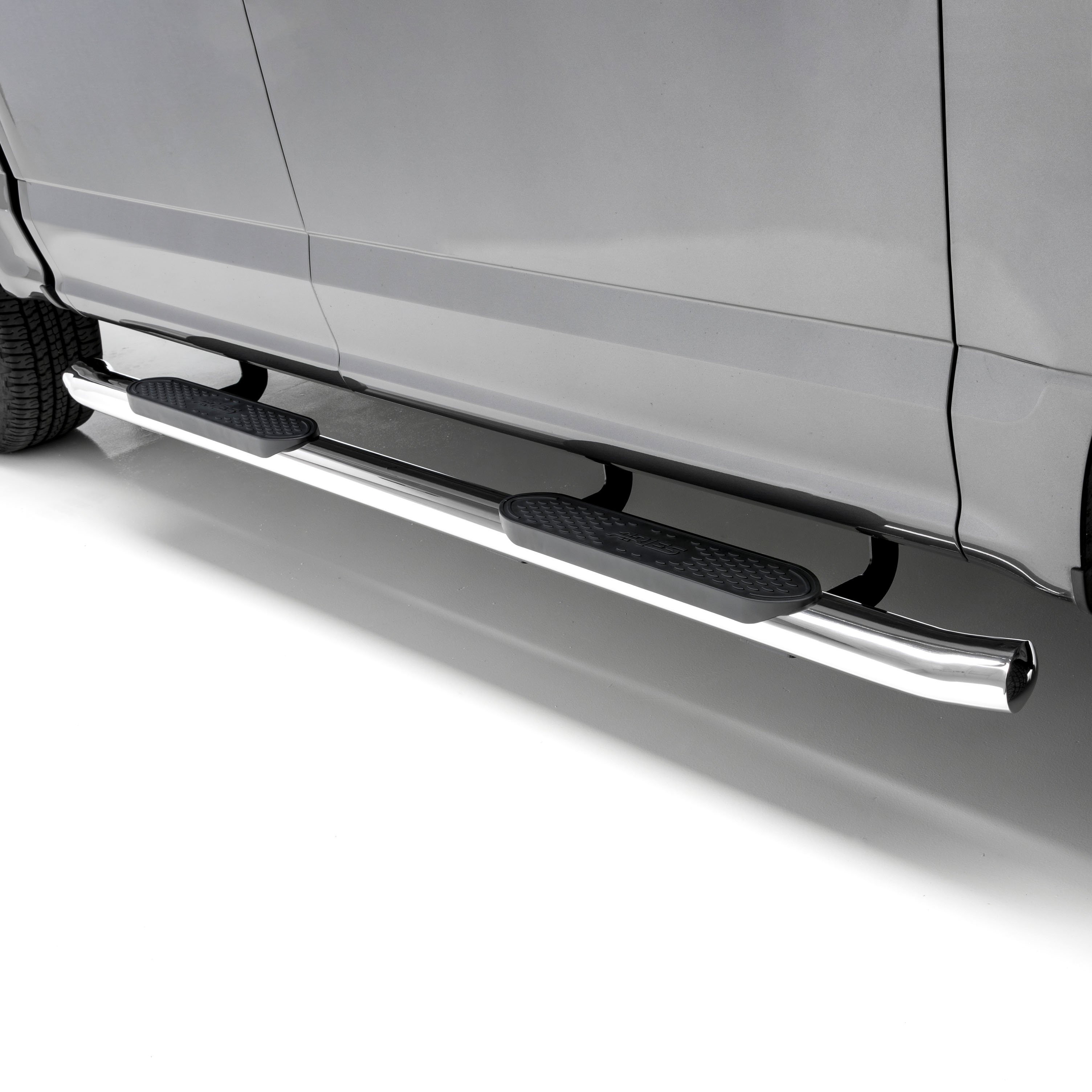 When you start and end your day turning the ignition of your truck, unreliable footing just is not an option. You need a step that can bear weight with ease, provide comfortable footing and look good doing it. ARIES 4" oval side bars are sleek, strong and custom-fitted to be a highly functional extension of your truck. ARIES 4" oval side bars are made with strong 4" elliptical tubing and are available in two different finish options to allow you full customization: polished stainless steel and black powder coat carbon steel. This set of side bars is constructed from 304 stainless steel, meaning high nickel content to be truly stainless. They easily resist rust and corrosion and feature a highly polished finish that is made to last. Something that sets the ARIES 4" oval side bar apart from all others is its blended end caps and OE-style bends. Rather than capping our side bars with a plastic cap, we offer a blended end cap for a smooth, finished appearance. We also equip the ends with a special 20-degree bend and original equipment styling to perfectly contour to your vehicle. ARIES 4" oval side bars are fitted with raised step pads to provide a wide stepping surface. The polypropylene construction will not crack over time, and because it has a textured grip, the surface is highly resistant to slips and skids, even when wet. To add an extra element of class to our oval sides, we also fit each one with a stainless steel insignia bearing the ARIES name. Installation of ARIES 4" oval side bars is quick and easy with custom-fitted mounting brackets and no drilling necessary. These nerf bars fit select model years of the Ford F-150, F-150 Lightning, F-250 Super Duty, F-350 Super Duty, F-450 Super Duty and F-550 Super Duty (see application info to verify fitment).