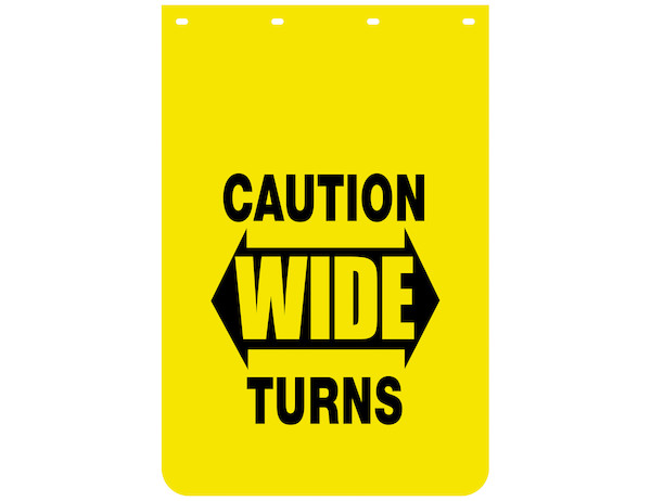 Buyers Products "Caution Wide Turns" Polymer Mud Flaps feature a bright safety yellow color to alert other drivers on the road. Constructed from durable polymer, the splash guards repel impact from road debris while maintaining their appearance and anti-sail properties. They can endure subfreezing temperatures and resist the buildup of road debris, ice, and snow to remain visible in the harshest of conditions.