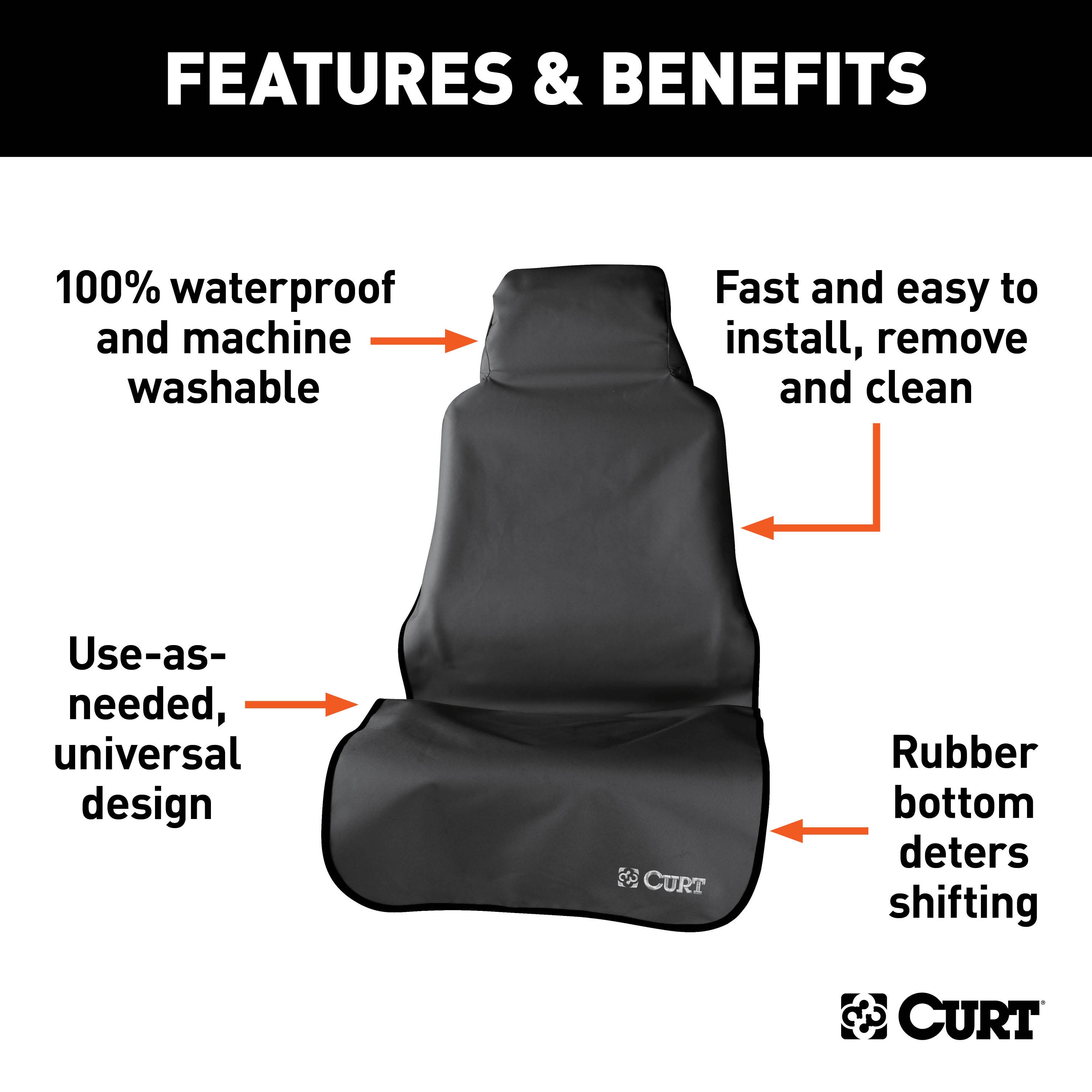 The CURT Seat Defender car seat cover is a universal, use-as-needed seat cover protection system that readily installs whenever you need it. It provides an instant defense against dirt, spills, pet dander and any other threats to your vehicle's interior. What makes it unique is its use-as-needed design. Rather than being a permanent cover-up for unsightly interior that has already been damaged, Seat Defender seat covers act as a barrier to prevent the damage before it happens. Unlike seat covers that require tedious installation, the Seat Defender is designed to be easy to put on and take off, whenever needed. It attaches securely to the headrest and conforms to the shape of the seat, giving the seat a tough, waterproof outer layer. CURT Seat Defender seat coverings are also easy to store and keep clean. Because it is not a permanent seat cover, it is designed for fast cleanup, fast foldup and fast installation the next time you need it. It easily protects against wet clothes, dirty tools, muddy sports equipment, shedding pets, sandy swimsuits, messy fast food and more. It is also 100% machine washable and can be stored in any small compartment in your vehicle. The CURT Seat Defender is made out of a two-sided material to provide a sophisticated barrier against potential threats. The underside is a layer of water-resistant thermoplastic rubber (TPR). TPR is durable and wear-resistant and provides added comfort and safety by gripping the surface of the seat. The top side is a woven 600-denier terylene fabric that keeps dirt and spills out and maintains comfort for the user. Seat Defenders are the perfect seat covers for cars, trucks, minivans, SUVs and more. They're great for pet owners, outdoor enthusiasts, sports lovers, industrial and commercial workers, frequenters of the beach or boat landing and many others. They also make great baby car seat covers!