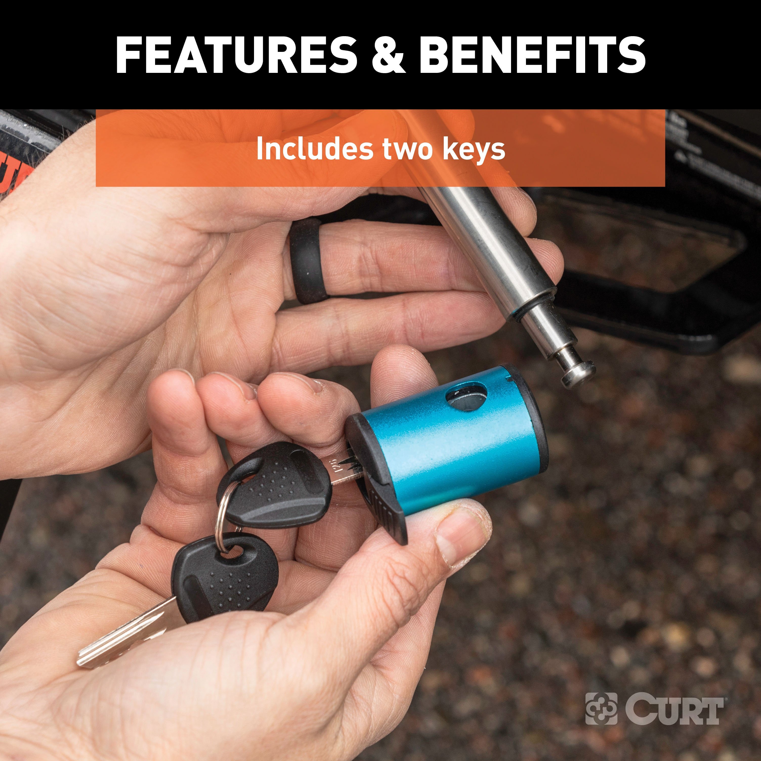 Make your tow vehicle and trailer more secure by keeping them locked up tight with a CURT hitch lock. Like a hitch pin and clip, a hitch lock is designed to insert into the fastener hole in the side of a receiver tube in order to hold a ball mount or hitch-mounted accessory in place. While a CURT hitch pin does offer sufficient strength for keeping your ball mount firmly attached, a CURT hitch lock goes one step further. CURT hitch locks allow you to lock your ball mount into your trailer hitch, deterring theft and preventing anyone from detaching your trailer at the ball mount and towing away your property without your permission. This CURT hitch lock features a right angle, barbell design and comes with a 5/8" pin diameter to fit a 2" receiver tube size. CURT barbell hitch locks are comprised of a pin with two end caps and a round locking mechanism. They are key-operated and activate with a simple 1/4-turn. They also come with a watertight dust cap to keep out the elements and prevent corrosion. For the ultimate in towing security, a hitch lock and coupler lock used together will provide security at both the vehicle-side and trailer-side of your towing setup. For your boat, ATV or camper, keep your toys more secure with CURT hitch locks.