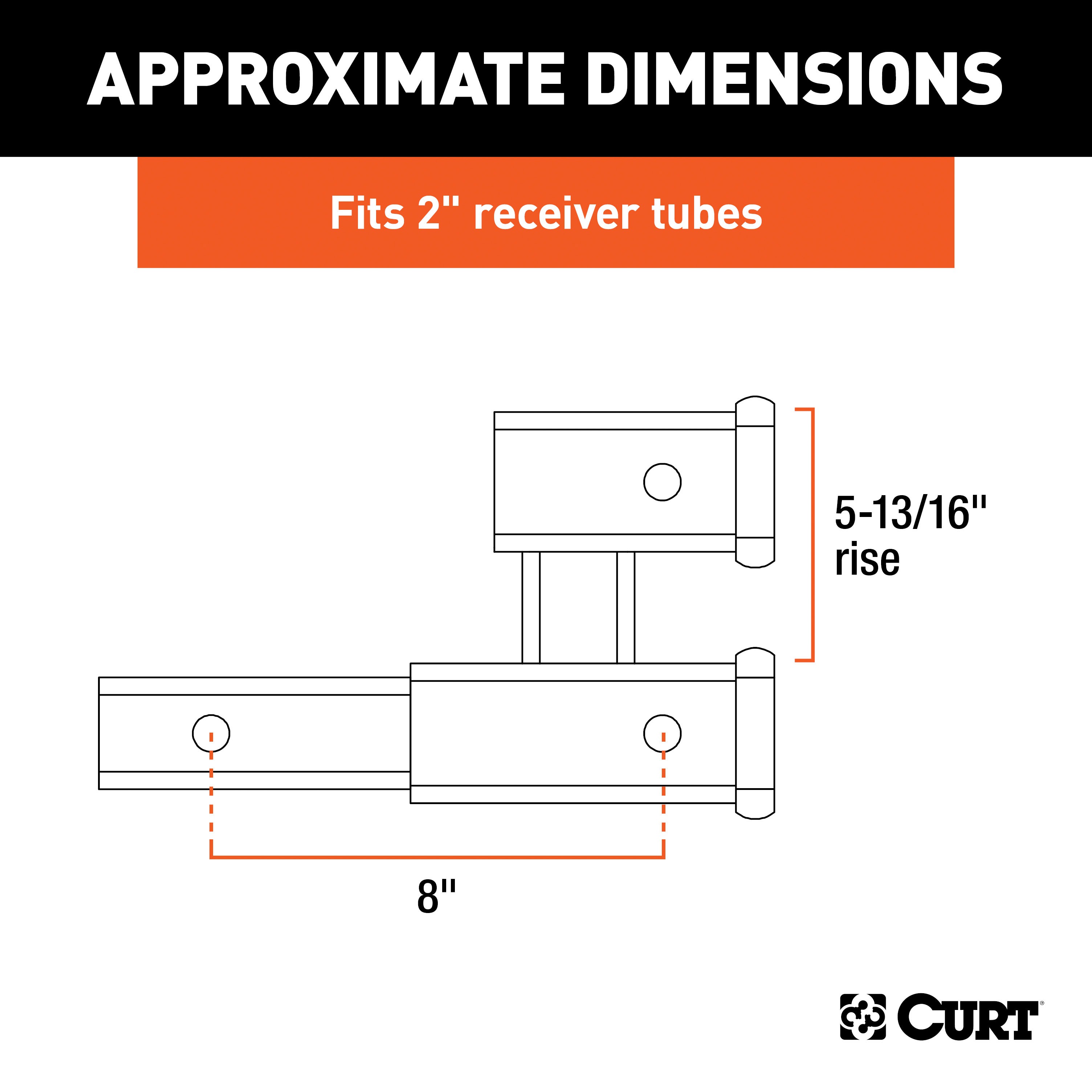 No matter what you are towing, CURT towing equipment is intended to get you from point A to point B and to have peace of mind while doing so. Our hitch extenders are no exception. When you have spacing issues with your hitch-mounted accessories such as a bike rack or cargo carrier, or you need to give your ball mount and trailer coupler a little extra room, a CURT hitch extender can help. Hitch extensions are simply receiver tubes that insert into your trailer hitch to add a certain amount of clearance for your vehicle's bumper or spare tire mounted on the back. A hitch extender makes it very easy to give your tow load the room that it requires and helps protect your vehicle from scuffs, scratches and even dents. This special dual receiver hitch extension is designed to fit a 2" x 2" receiver tube opening. It not only extends the receiver by 8" but also allows you to simultaneously tow a trailer and mount a hitch-mounted bike rack or cargo. It has a gross trailer weight capacity of 3,500 lbs. and tongue weight capacity of 350 lbs. The top receiver is not intended for towing a trailer. CURT hitch extenders, like our ball mounts and trailer hitches, are crafted to be durable and dependable. In addition to the strong steel construction and precise welding, our trailer hitch extenders receive a gloss black powder coat for ongoing prevention of rust, chipping and UV damage.