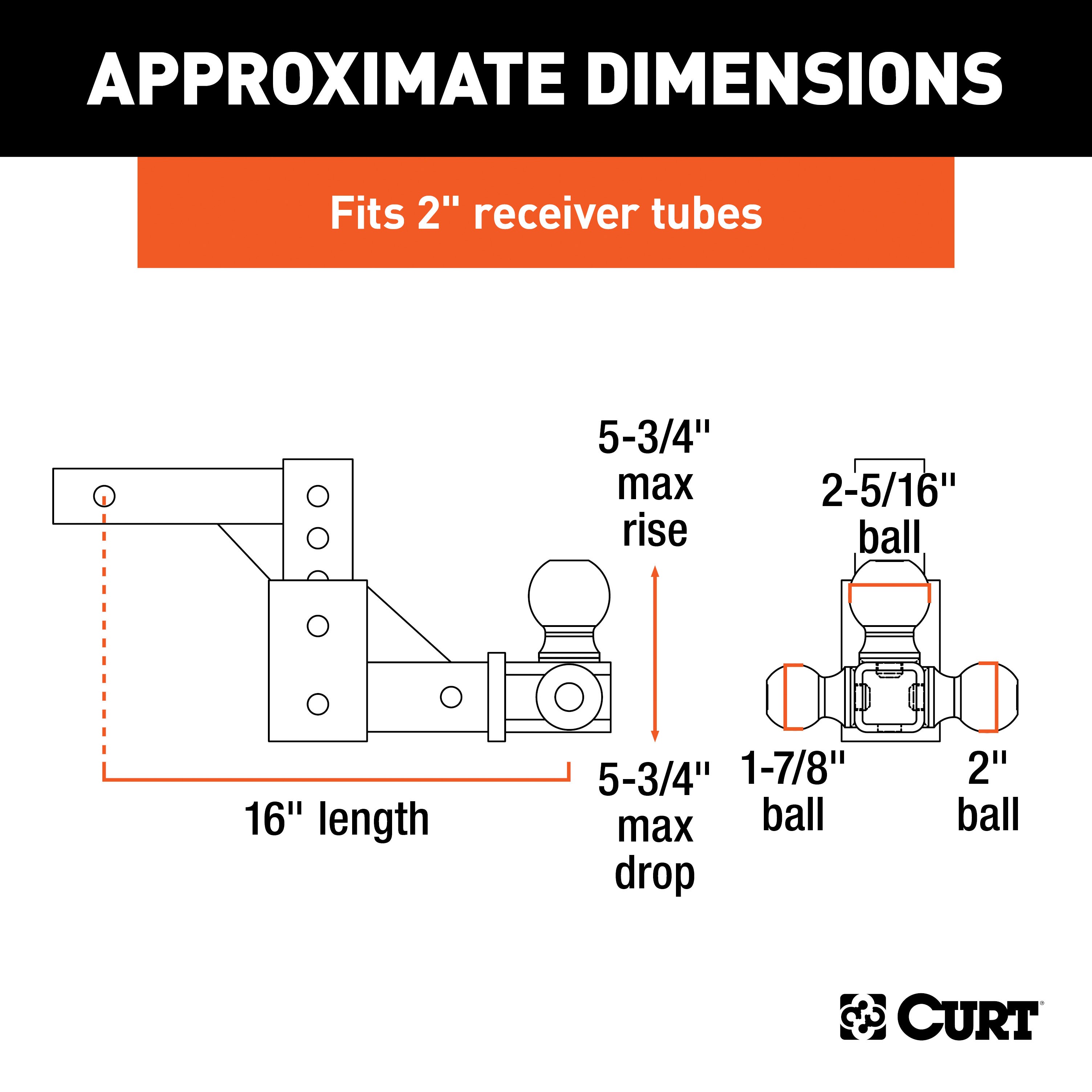 If you own multiple trailers or frequently tow a variety of loads, you know how much time and money are spent tailoring your towing system to each and every individual trailer. There is nothing more inconvenient than switching back and forth between a few different ball mounts and trying to remember which mount fits with which trailer. A CURT adjustable ball mount is your multipurpose towing solution. This CURT adjustable ball mount has a shank size of 2" x 2" and features three different trailer ball sizes to accommodate all standard coupler sizes: 1-7/8", 2" and 2-5/16". The 1-7/8" trailer ball offers a gross trailer weight capacity of 6,000 lbs. and a tongue weight capacity of 600 lbs. The 2" trailer ball has a GTW capacity of 7,500 lbs. and a TW capacity of 750 lbs., and the 2-5/16" ball offers 10,000 lbs. GTW and 1,000 lbs. TW. This allows you to easily tow a variety of trailers and to ensure that each one tows smoothly and securely. This tri-ball ball mount also features an adjustable shank assembly with multiple mounting holes for varying ball heights. Each trailer ball can be raised to a maximum of 5-3/4" rise or lowered to a maximum of 5-3/4" drop, allowing you to make your trailer completely level in any towing situation. It includes three 5/8" hitch pins for quick and secure installation, and the adjustable shank can also be used with our multipurpose ball mount attachment #45008 for even more versatility. All CURT adjustable ball mounts are made with sturdy steel construction and come with a durable powder coat finish for long-lasting rust, scratch and UV resistance.