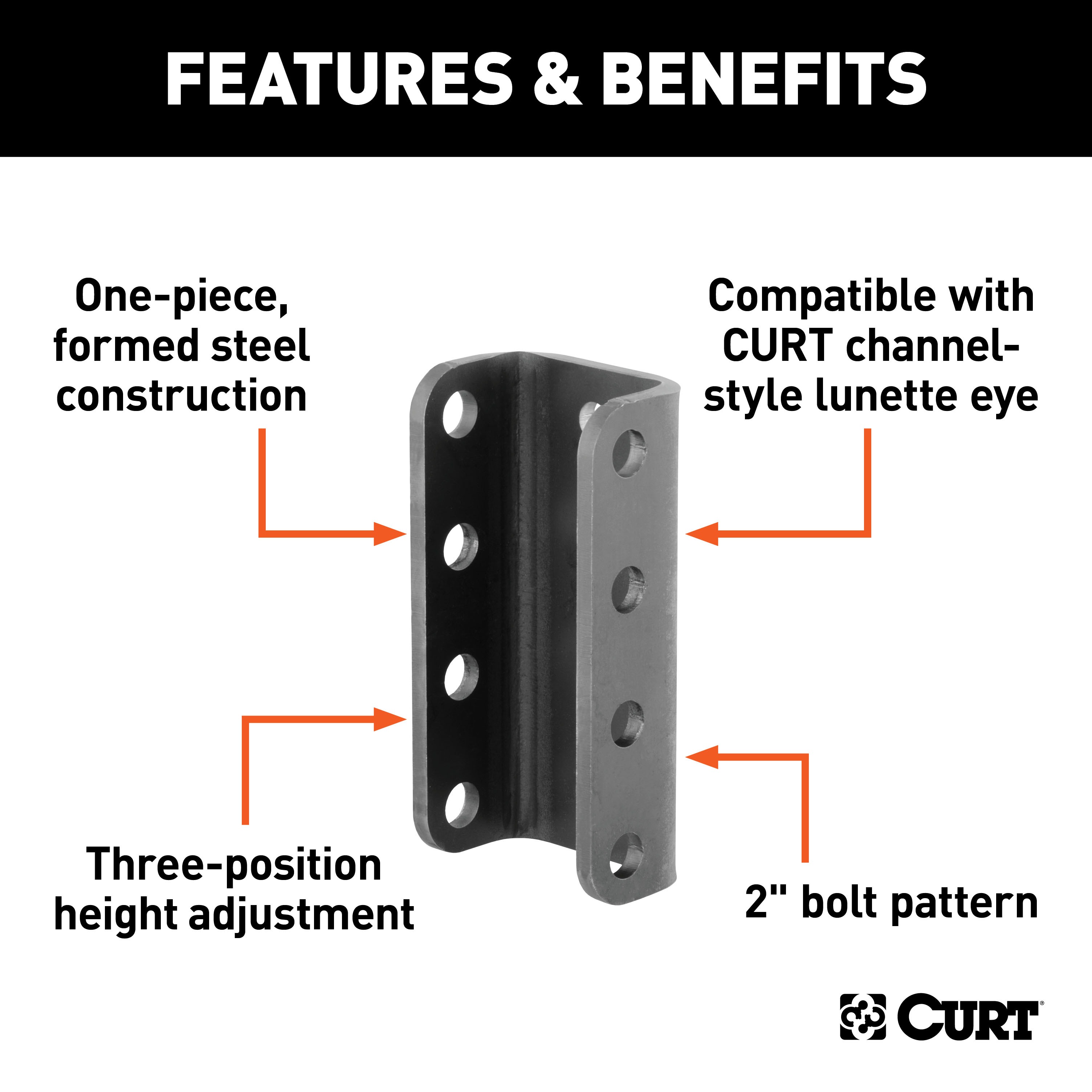 In agriculture, construction and even military applications, pintle hitches are the trusted product of specialized towing. They are notorious for their high weight capacity and simple design. The basic pintle hitch is essentially a hook and loop, with the hook attached to the vehicle and the loop mounted on the trailer. Because of their simple design, pintle hitches are able to have thicker metal construction and more secure coupling. CURT has a wide variety of pintle hitches and pintle-style products to give you a complete solution for your heavy-duty towing needs. This adjustable coupler channel is designed to mount CURT lunette rings #48600, #48601 or #48660 or CURT channel-style couplers #25319, #25329, #25330 or #25328, allowing for easy height adjustment and trailer levelling. It features a formed, one-piece steel construction and boasts a gross trailer weight capacity of 12,000 lbs. (NOTE: Never exceed the lowest weight capacity of any towing component; i.e. the vehicle, hitch, trailer, etc). It offers three different height adjustment positions with an overall height of 7-1/2".