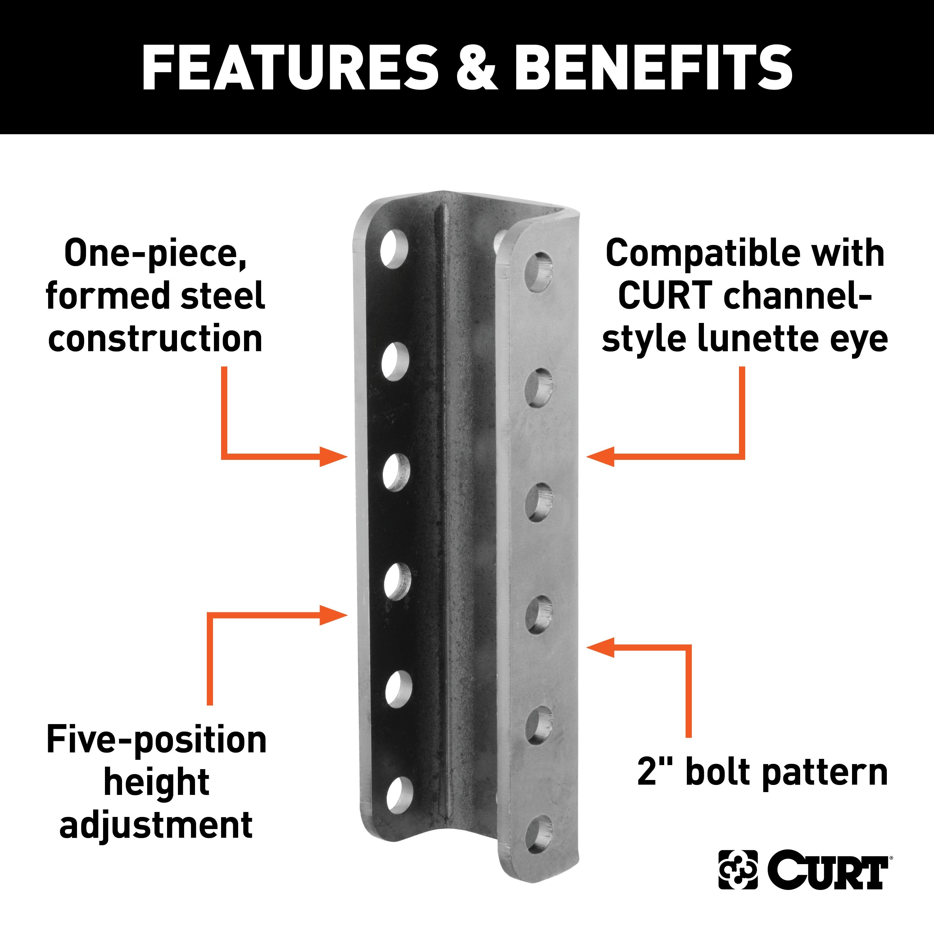 In agriculture, construction and even military applications, pintle hitches are the trusted product of specialized towing. They are notorious for their high weight capacity and simple design. The basic pintle hitch is essentially a hook and loop, with the hook attached to the vehicle and the loop mounted on the trailer. Because of their simple design, pintle hitches are able to have thicker metal construction and more secure coupling. CURT has a wide variety of pintle hitches and pintle-style products to give you a complete solution for your heavy-duty towing needs. This adjustable coupler channel is designed to mount CURT lunette rings #48600, #48601 or #48660 or CURT channel-style couplers #25319, #25329, #25330 or #25328, allowing for easy height adjustment and trailer levelling. It features a formed, one-piece steel construction and boasts a gross trailer weight capacity of 12,000 lbs. (NOTE: Never exceed the lowest weight capacity of any towing component; i.e. the vehicle, hitch, trailer, etc). It offers five different height adjustment positions with an overall height of 11-3/4".