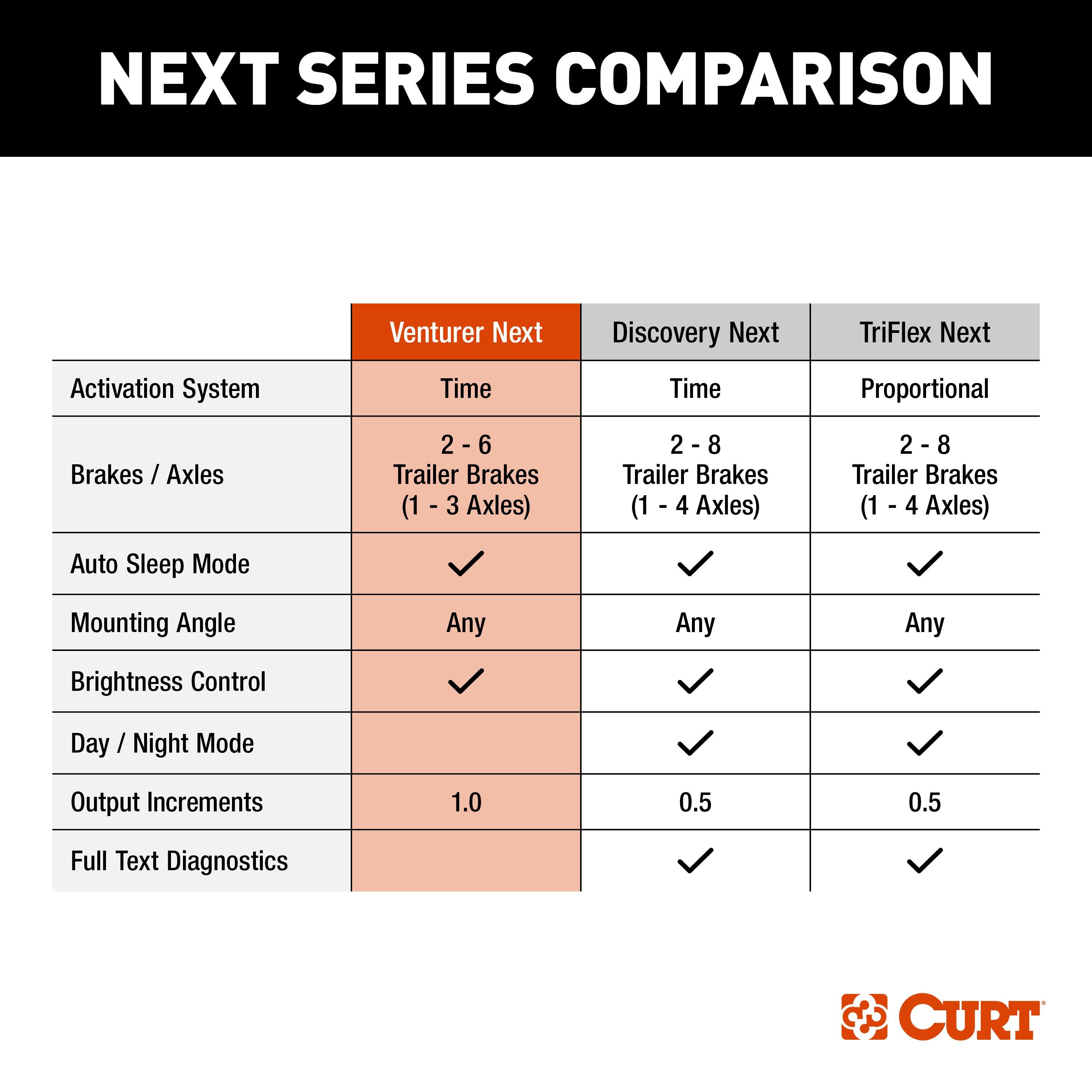 Experience the reliability and efficiency of the CURT Venturer NEXT, an intuitive and compact brake controller designed to ensure dependable operation of your electric trailer brakes directly from your vehicle's cabin. Featuring a sleek and modern design, this advanced controller is equipped with a low-profile bracket that adds clearance for enhanced functionality. With the ability to control 2-6 trailer brakes at a time (1-3 axles), it offers fully adjustable settings to perfectly adapt to your unique vehicle-trailer setup. The Venturer NEXT is a redesigned and improved version of our popular Venturer brake controller, offering compatibility with 12-volt vehicle systems and electric over hydraulic brakes. Its slim profile provides a functional and contemporary aesthetic, allowing for powerful brake control at your fingertips without dominating your vehicle's dashboard. Additionally, the included unique mounting bracket further enhances clearance, ensuring a seamless and unobtrusive installation. Equipped with a time-delay feature, the Venturer NEXT brake controller provides fully adjustable power and ramp time. Choose from a wide range of gain and load settings to perfectly match your specific towing requirements. The ramp-up progress is clearly displayed through LED indicators, and the brightness can be adjusted to suit day or night-time towing conditions. This time-based brake controller is quick and easy to set up, with no internal moving parts or leveling required. It offers versatile mounting options, allowing installation at any desired location and angle within your vehicle. For convenient plug-and-play installation, it is recommended to use a CURT brake controller wiring harness (sold separately). This bulk package includes 6 brake controllers.