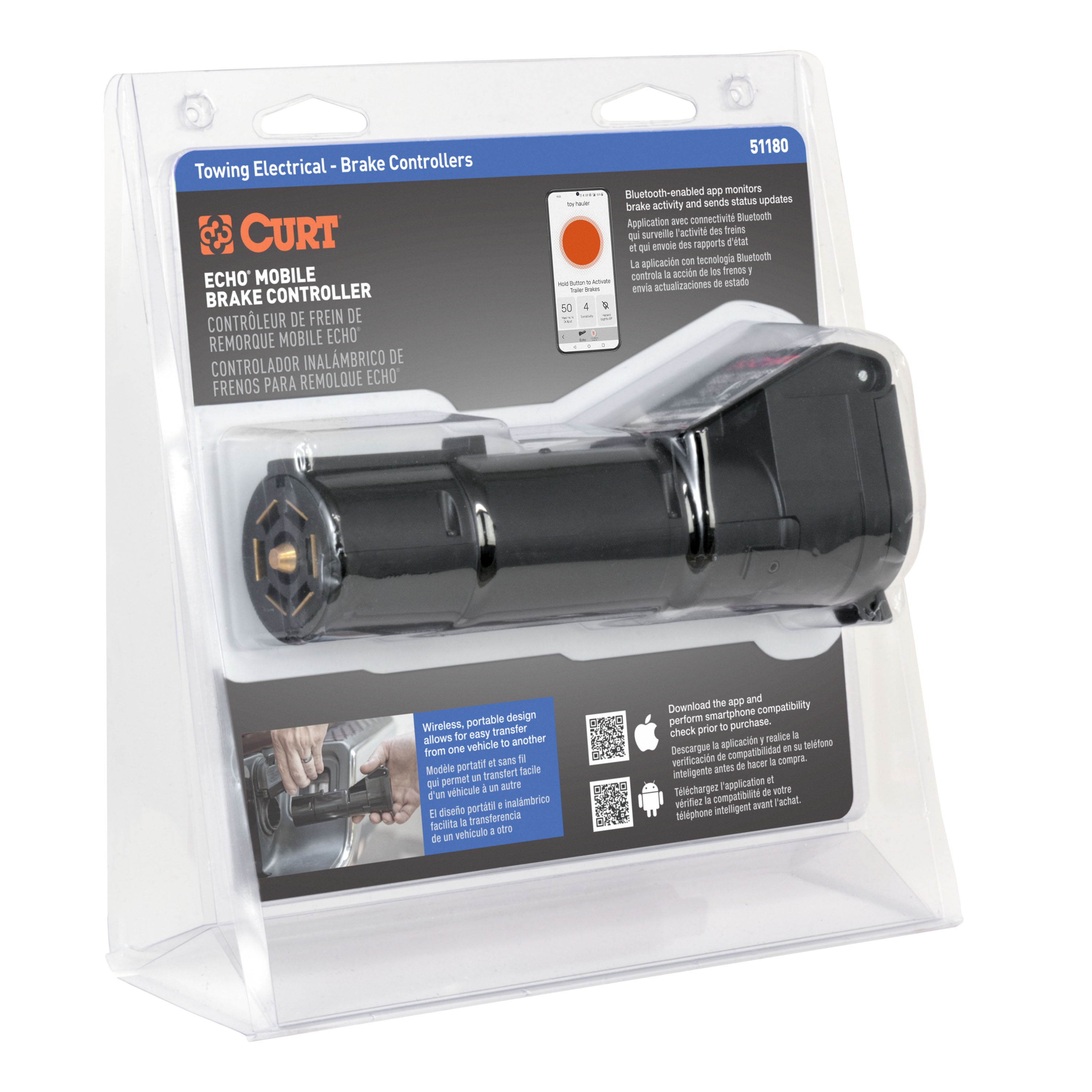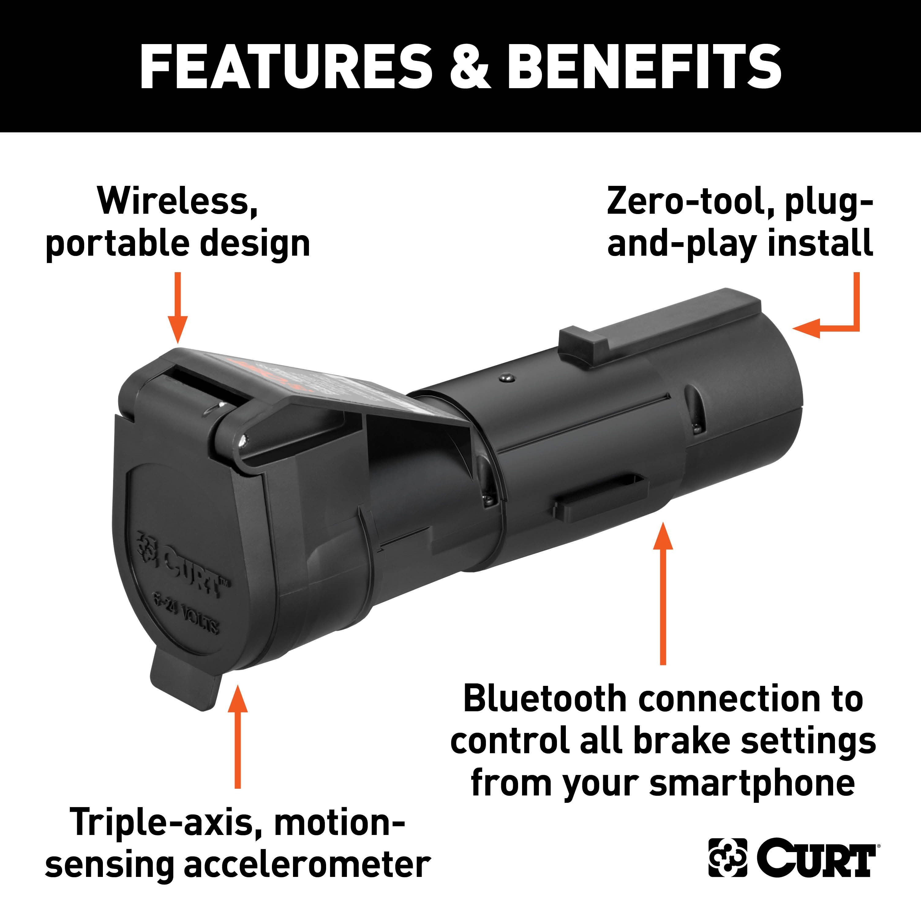 The CURT Echo mobile trailer brake controller is a Bluetooth enabled device that wirelessly connects to your smartphone and allows you to control and monitor all trailer brake activity right from your device. It features a simple, plug-and-play installation, a portable design to easily switch between vehicles and a highly durable construction to outlast the elements. The Echo brake controller brings your towing experience into the modern age. Powered by Bluetooth, it wirelessly connects to your smartphone without any extra wiring harnesses or modules required. Simply download the Smart Control app on your Apple iOS or Android OS device, plug the Echo into your vehicle and you're ready to start towing. The app allows you to create multiple vehicle-trailer profiles for different towing situations. Installing the Echo trailer brake controller is truly a plug-and-play experience. It is designed to insert in between the vehicle-trailer wiring connection and is compatible with any industry-standard 7-way RV blade plug. This design also allows the Echo to be easily transferred between vehicles, making it perfect for fleet vehicles or multiple-vehicle owners. The Echo mobile trailer brake controller is built to withstand the outdoor elements, whether you're towing through rain, snow or sunshine. It features a potted enclosure. This means the interior of the Echo is filled with an epoxy resin that covers the internal electronics and seals them off from dirt and moisture. This promotes long-lasting durability and also helps reduce vibration. To further enhance the connection, the connector port of the Echo is equipped with a retention strap and locking tab to firmly seat in the 7-way vehicle socket. The CURT Echo mobile brake controller operates with a tri-axis circuit for smooth stops going up or down a hill, and it is able to operate up to two to four trailer brakes at a time (one to two axles). It is also compatible with cruise control and ABS brakes.