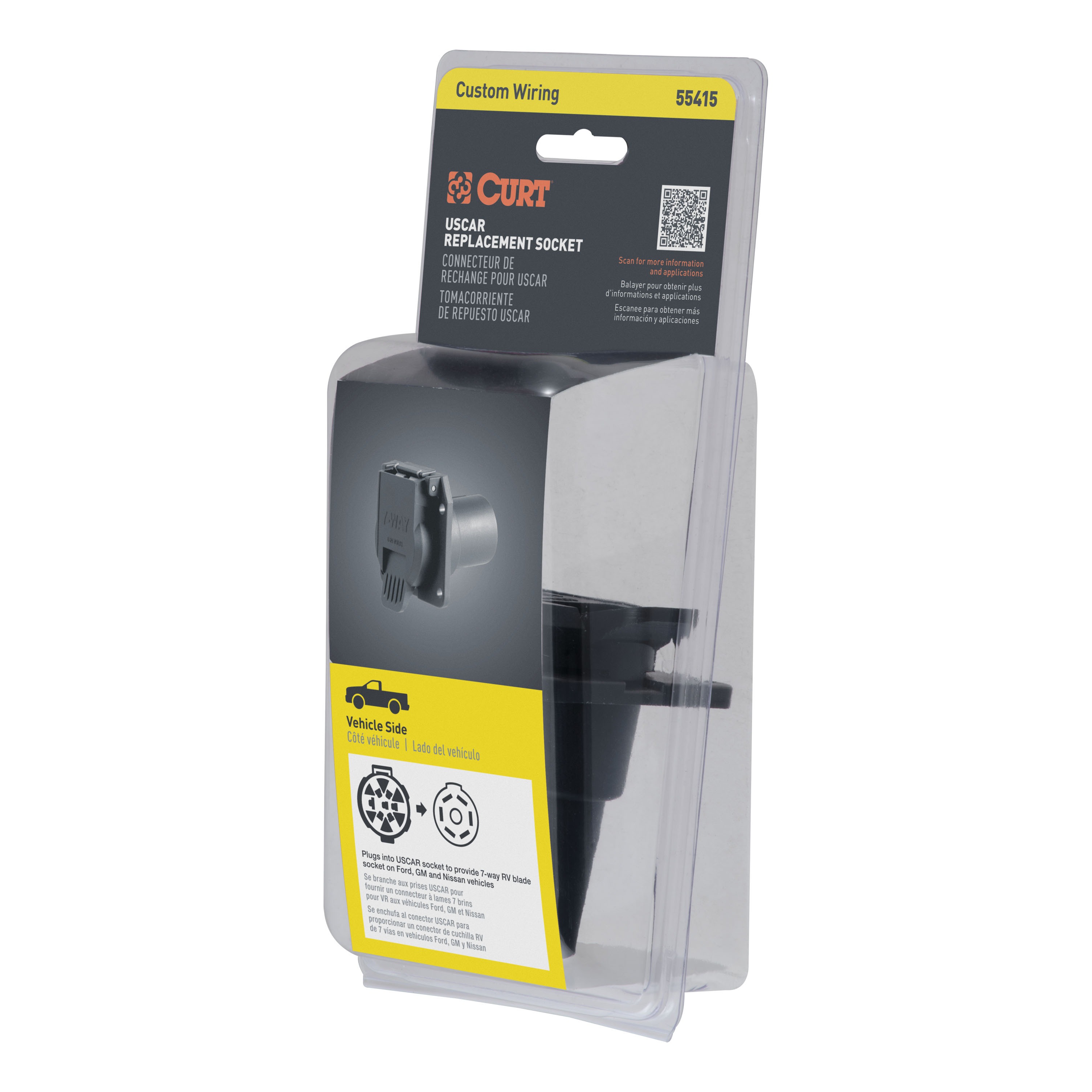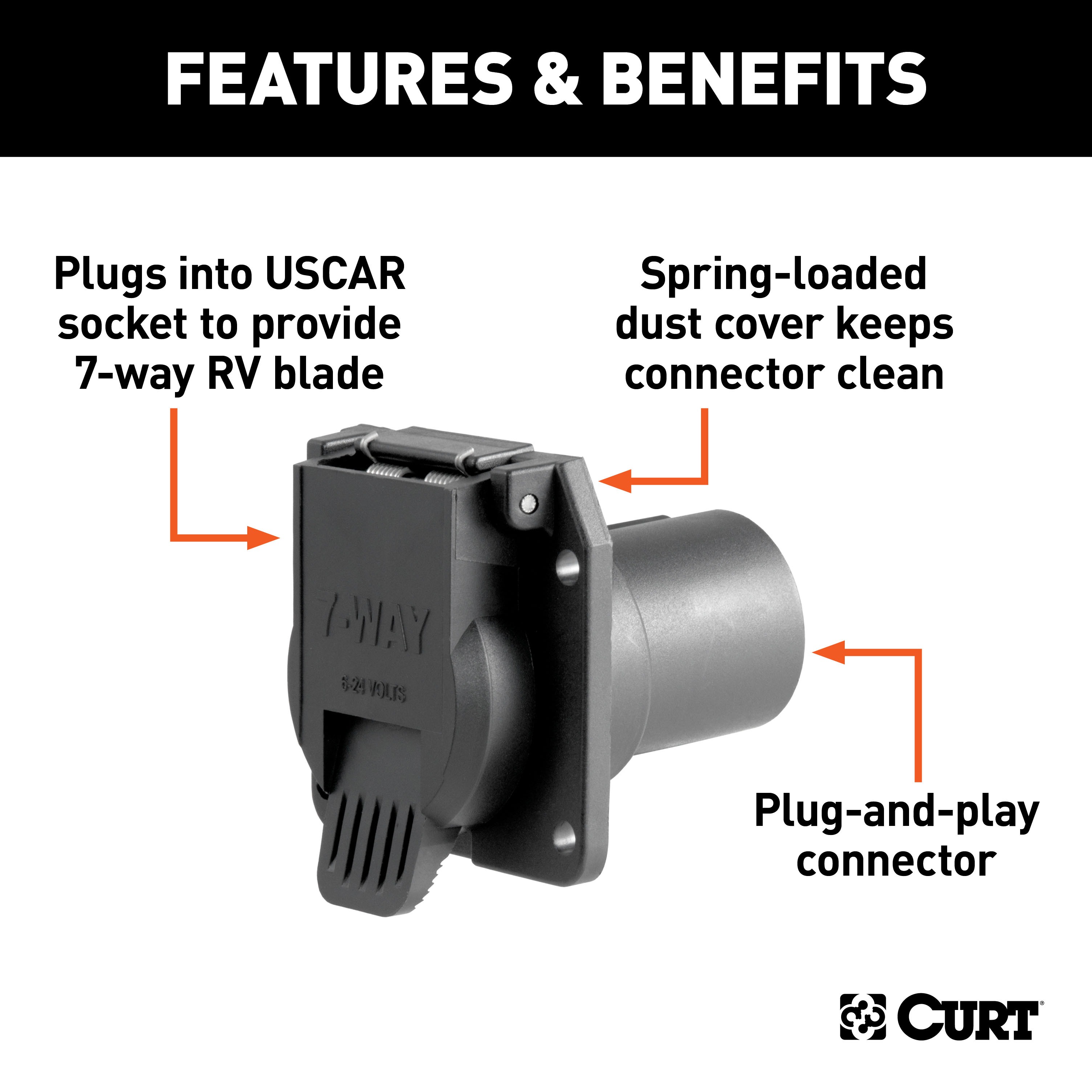 Like trailer hitches and ball mounts, electrical connectors range all over the board in shape, size and capability, but no matter what your trailer's electrical functions are, you need a solid connection to keep the power flowing and ensure safety on the road. CURT electrical connectors are designed and manufactured to give you a reliable connection every time you plug in your trailer. This 7-way RV blade connector is designed to plug into a USCAR socket and supply power for tail lights, turn signals, electric trailer brakes, a 12-volt battery, reverse lights and brake lights, as well as a ground connection. It is intended to be a replacement trailer connector, plugging into a standard USCAR socket (see application info to verify fitment with your vehicle). It features rust-free black plastic construction and comes with a spring-loaded cover to keep out dust and water. This 7-way RV blade connector is a female-end socket, specifically designed for the vehicle side of the connection.