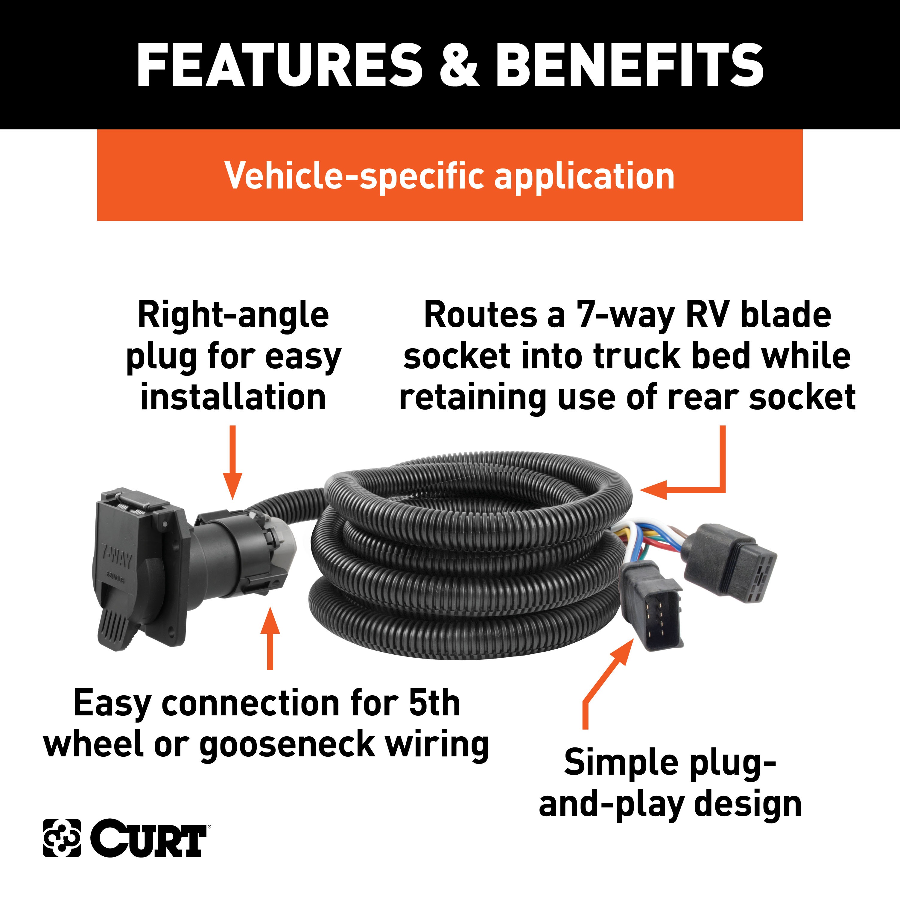 There is nothing like the luxury and power that go along with heavy-duty towing. 5th wheel RVs offer a deluxe, home-away-from-home experience unlike any other, while gooseneck trailers possess a strength that far surpasses most other trailer options. As with any trailer, however, 5th wheels and goosenecks must be equipped with the proper lighting and electrical systems, and tend to require even more complex connectors than a standard receiver-type trailer setup. Make things simple with a CURT 5th wheel / gooseneck extension harness. These wiring harnesses are designed to put an extra connector socket in the bed of your pickup truck while still retaining power to the rear connector socket mounted on your bumper. This is done by plugging into the back of the existing original equipment (OEM) harness and routing through the body of the truck to a hole in the truck bed, providing a connector that is ready to accommodate your 5th wheel or gooseneck trailer. This CURT extension harness is designed to work with 7-way RV blade connectors and comes in a length of 10'. It is compatible with the Dodge Ram 1500, 2500, 3500 and Dakota (see application to verify fitment). When you need a towing electrical solution that allows you to switch back and forth between your receiver hitch and specialized trailer hitch, CURT gets you plugged in.