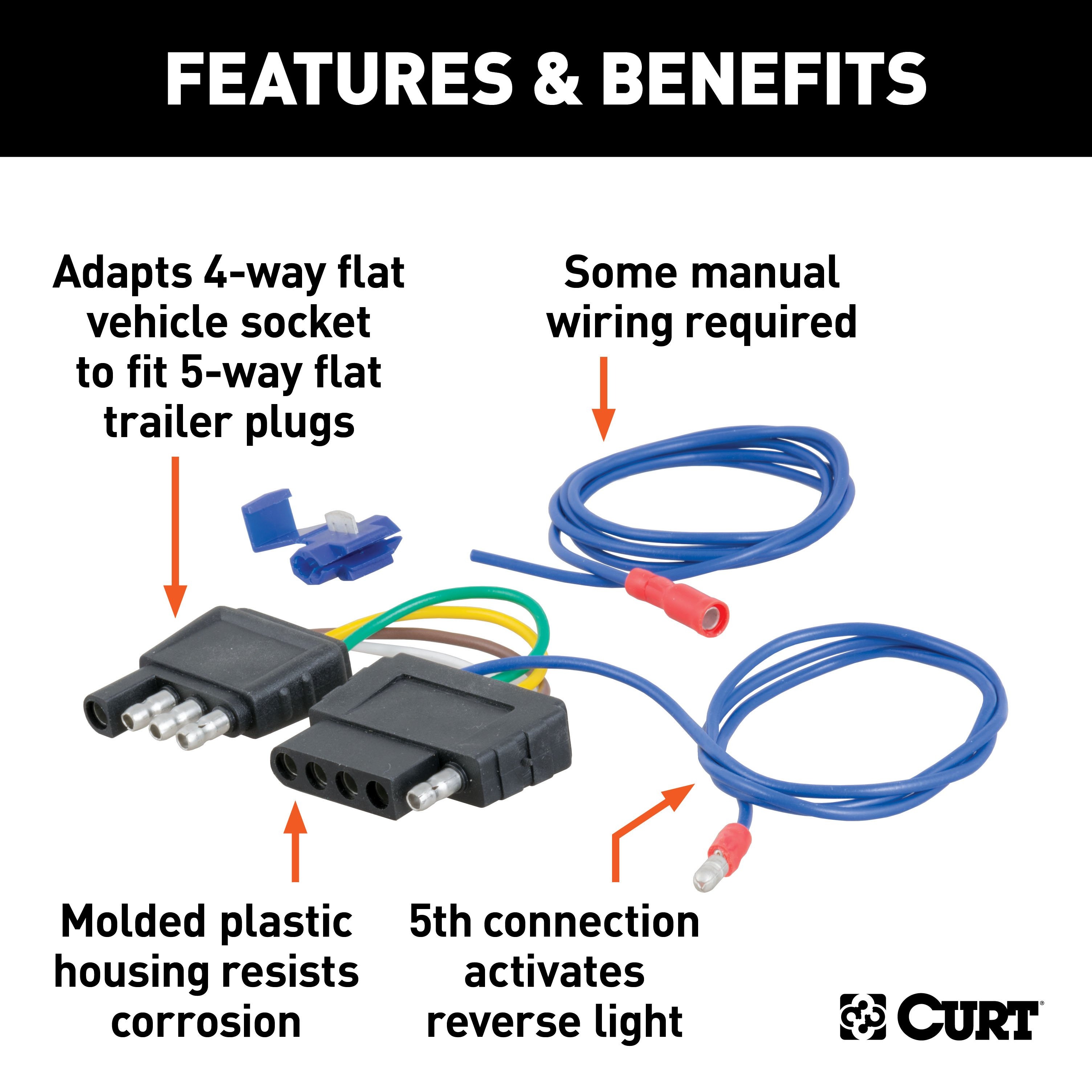 This electrical adapter is designed to adapt a 4-way flat vehicle socket to fit a 5-way flat trailer plug. It is specifically intended for boat trailers with surge brakes, adding in a fifth wire for the reverse lights and allowing your vehicle's 4-way flat to easily plug into your boat trailer 5-way flat. This boat trailer wiring adapter features durable molded plastic construction and requires some splicing. All CURT wiring and electrical products come with a one-year limited warranty to give you the assurance you need to tow with confidence.