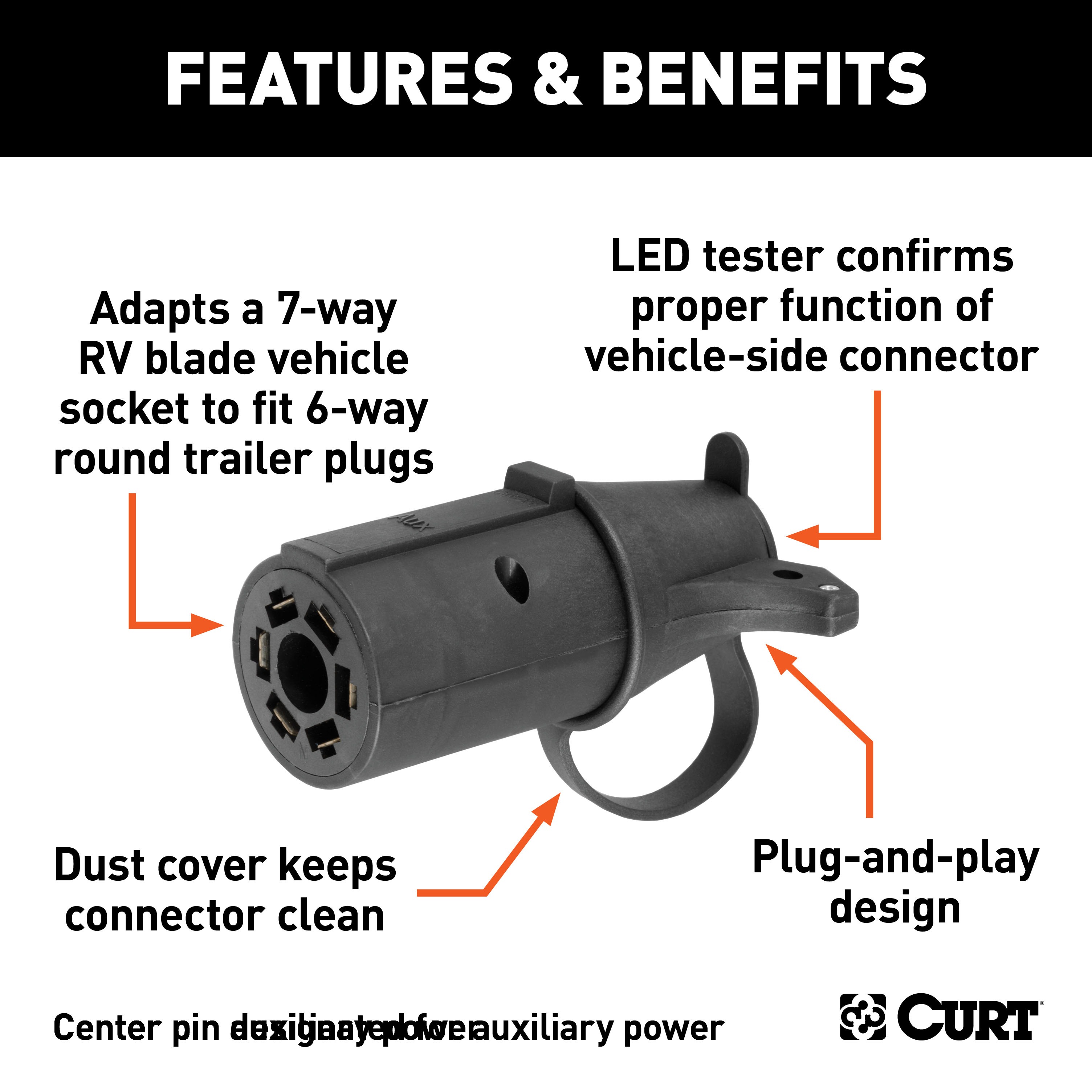 There are several different types of connectors used to supply power from a tow vehicle's electrical system to a trailer's wiring system. Some trailers only need the bare essentials -- running lights, brake lights and turn signals -- while others require a connection for reverse lights, electric brakes and auxiliary power. With connectors ranging from simple to complex, it may be the case that the connection between your vehicle and your trailer is not a perfect match. For example, your truck may be equipped with a 6-way round socket, but your trailer may have a 4-way flat plug. For this very common problem, CURT offers a quick and simple solution in the form of an electrical adapter. An adapter is an electrical device that allows a connection to be made between a mismatched trailer plug and vehicle socket. It easily plugs in your vehicle's electrical socket and usually requires no additional wiring. CURT offers an array of adapters to accommodate most types of plugs and sockets, including 4-way flat, 4-way round, 5-way flat, 6-way round, 7-way RV blades and more. This electrical adapter is designed to adapt a 7-way RV blade vehicle socket to fit a 6-way round trailer plug (center pin for auxiliary power). It features quality plastic construction, requires no splicing and comes with an LED connector tester dust cover. Not only does this dust cover protect the socket from dirt, water and road grime, but it also allows you to test your vehicle-side wiring connector to ensure your electrical systems are functioning properly. All CURT wiring and electrical products come with a one-year limited warranty to give you the assurance you need to tow with confidence.