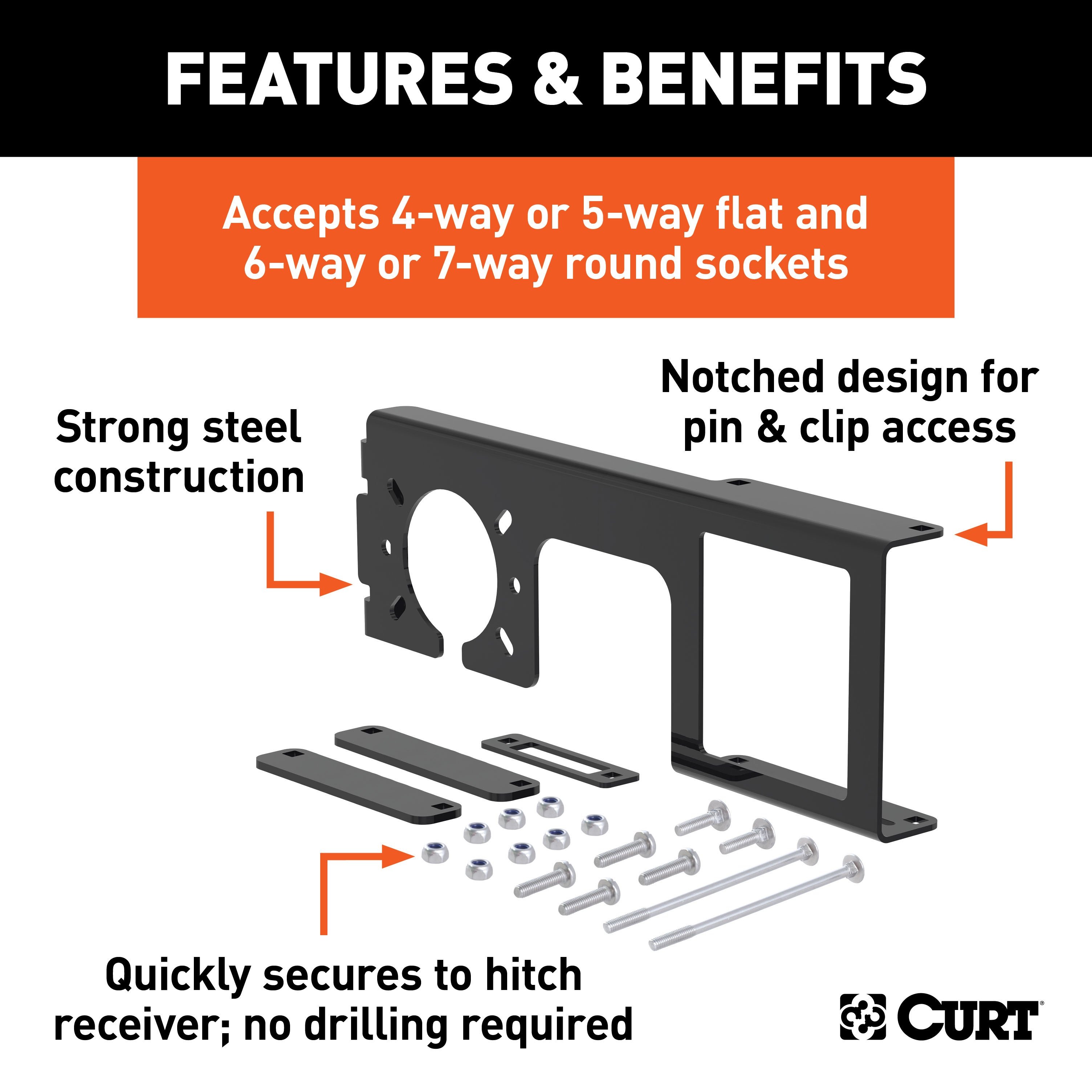CURT 58003 Easy-Mount Vehicle Trailer Wiring Connector Mounting Bracket for 2-1/2-Inch Receiver, 4 or 5-Way Flat, 6 or 7-Way Round