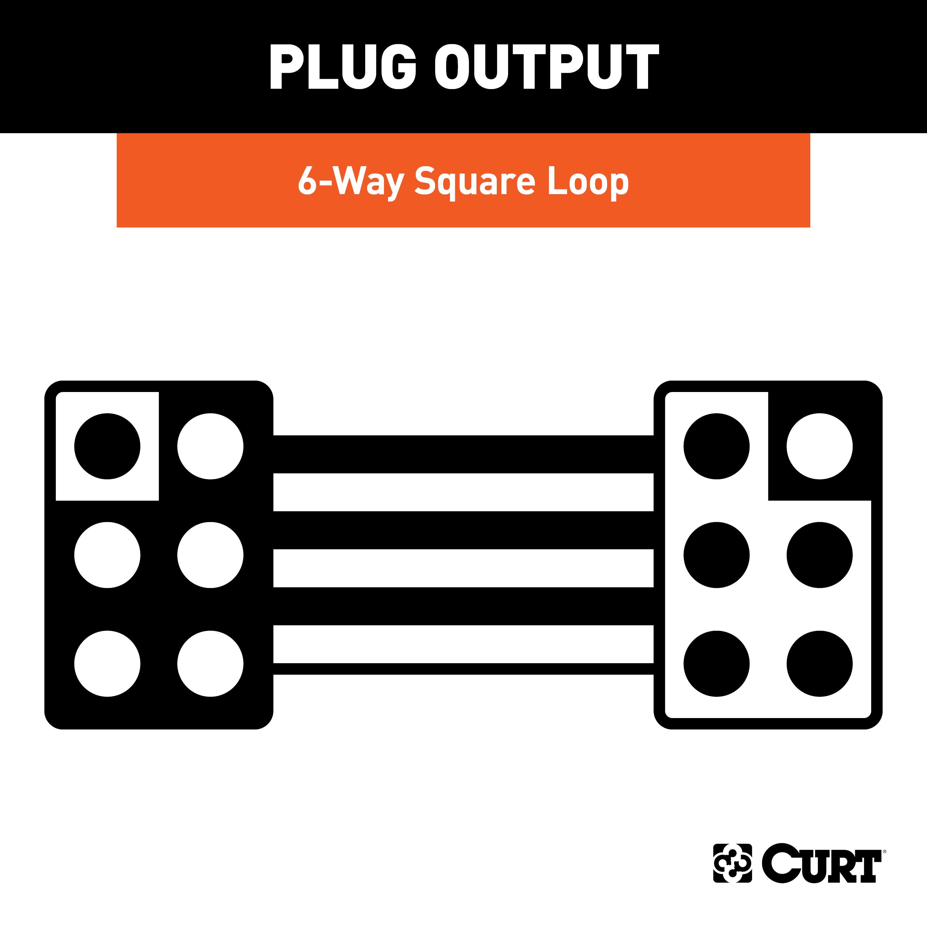 Like trailer hitches and ball mounts, electrical connectors range all over the board in shape, size and capability, but no matter what your trailer's electrical functions are, you need a solid connection to keep the power flowing and ensure safety on the road. CURT electrical connectors are designed and manufactured to give you a reliable connection every time you plug in your trailer. This 6-way square connector is designed to supply power for tail lights, turn signals, electric trailer brakes, a 12-volt battery and brake lights, as well as a ground connection. It features durable rubber-molded construction and is made with 12" of standard color-coded wire loop. It includes both a vehicle end and trailer end and can be cut to splice into existing wiring or left as a loop to serve as a useful extension harness. 6-way square wiring connectors are commonly found on popup campers.